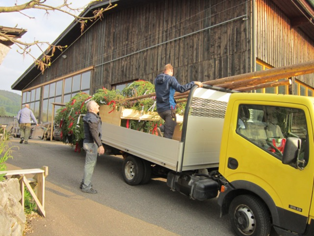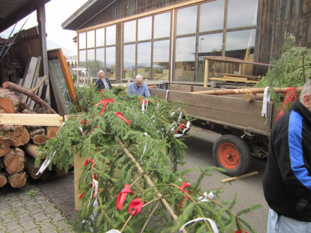 Um 19.00 Uhr trafen sich dann nochmals 2 Trachtenfrauen und 5 Trachtenmannen um die fünf Maibäume mit einem Transporter zu den Dorfbrunnen zu fahren. Dort wurden die Bäume an die durch die Einwohnergemeinde montierten Halter an den Brunnenstöcken mit je zwei langen Schrauben festgemacht.