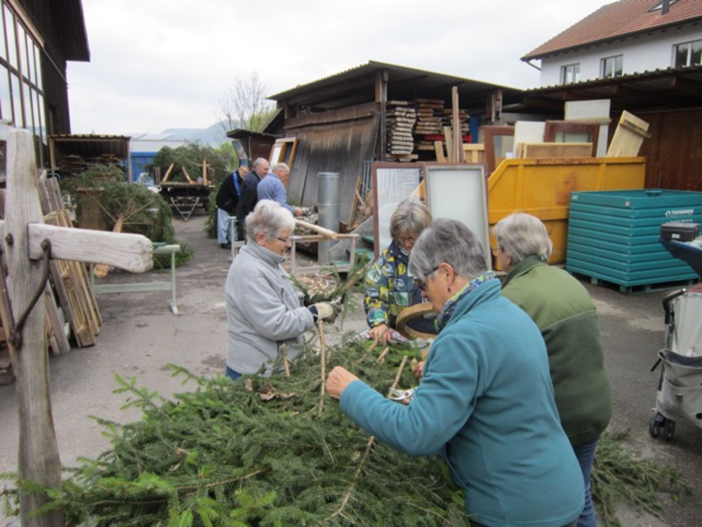 Die Trachtenfrauen machten sich daran aus den Tannenästen die 6 Eierkränze herzustellen. An jeden Kranz werden je 33 Eier mit rot/weissen Zotteln gebunden.