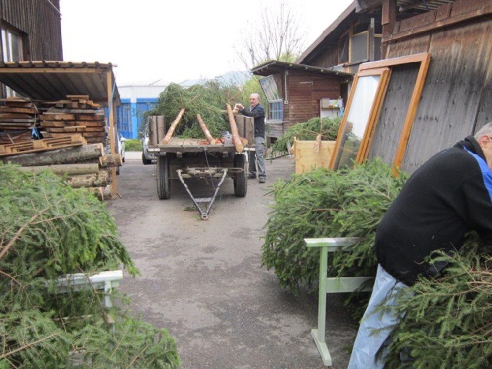 Am 30. April 2019 trafen sich 6 Trachtenfrauen und 4 Trachtenmänner um 09.30 Uhr bei der Schreinerei Häfelfinger in Sissach um 6 grosse Tannenbäume in der Länge von 7 bis 10 Meter in Maibäume zu verwandeln.
