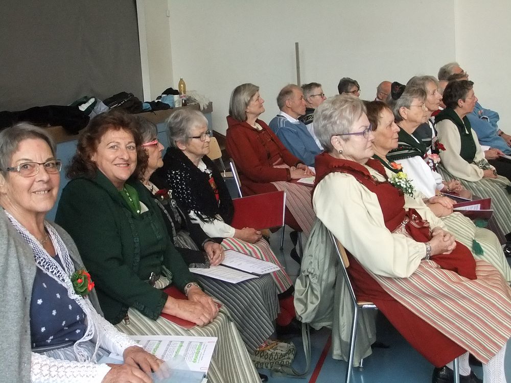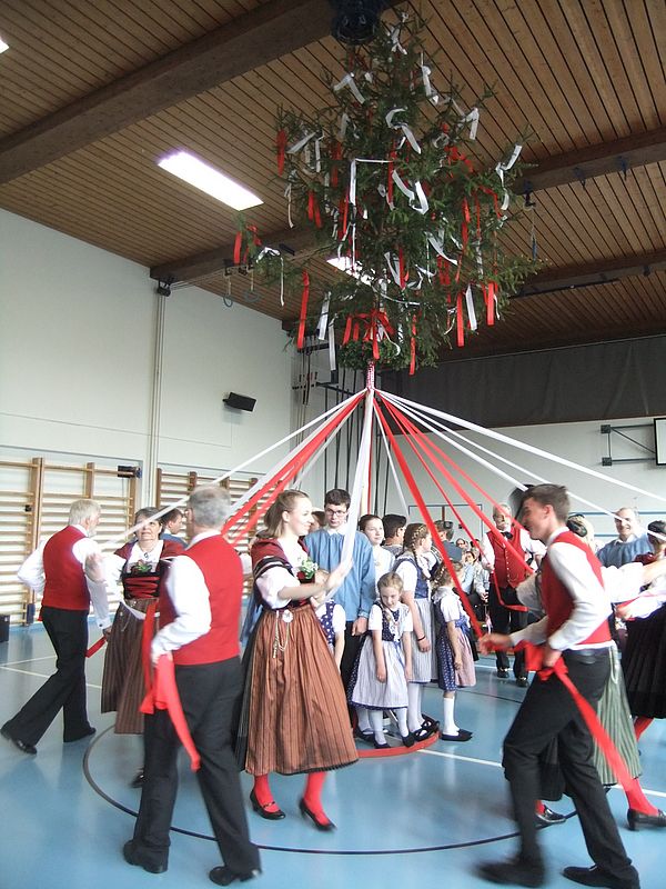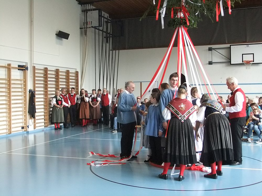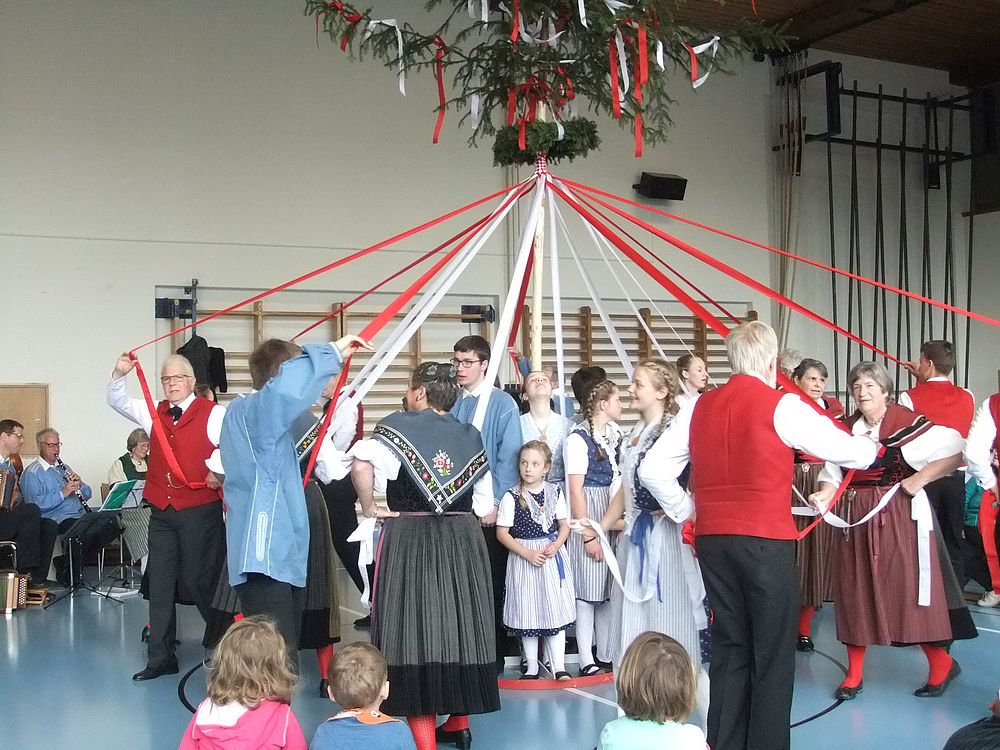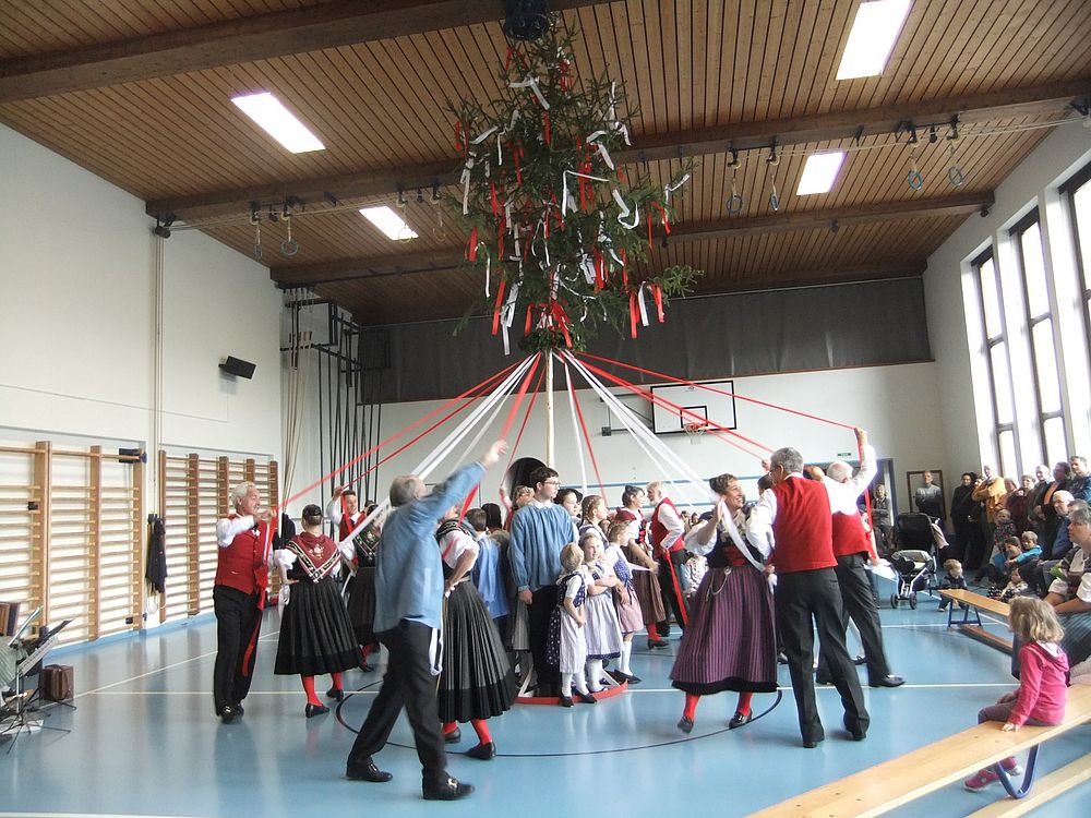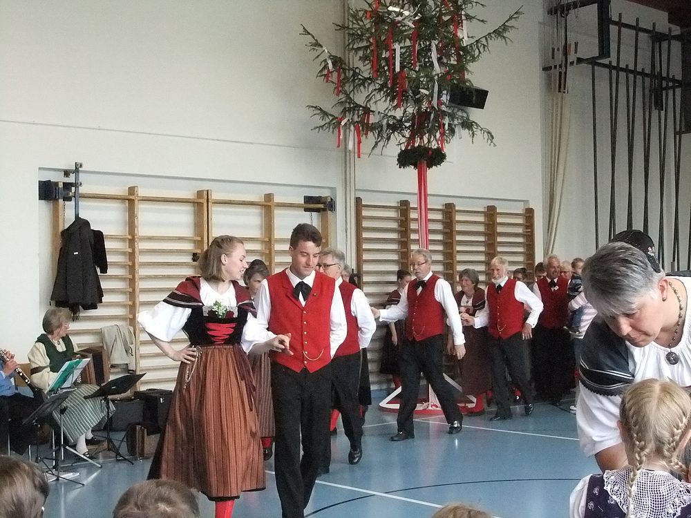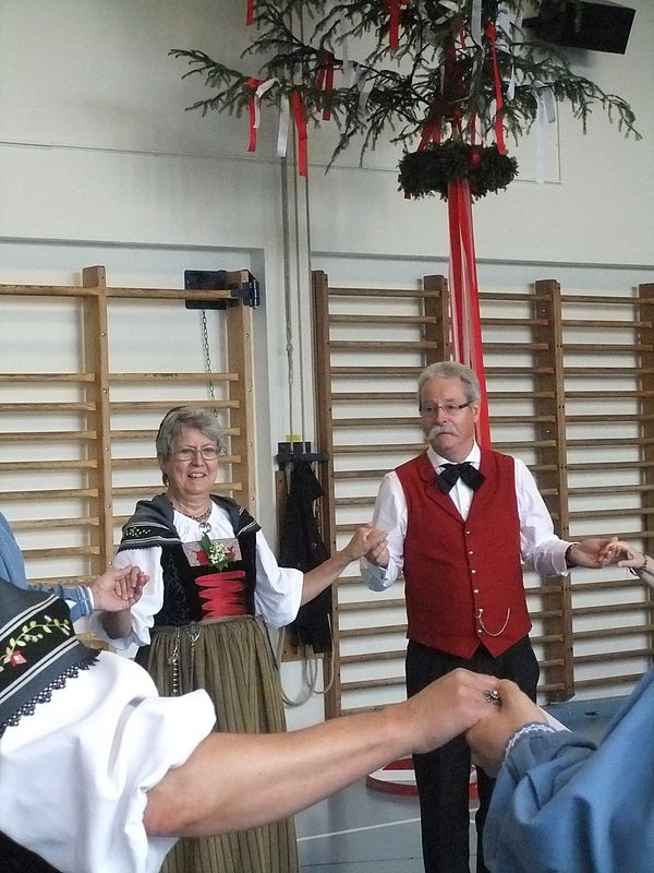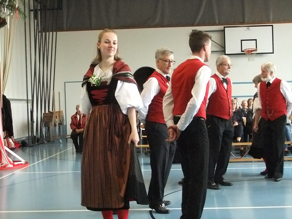 Nach der Kirchenpredigt um 10.00 Uhr, in welcher auch vier junge Erdenbürger getauft wurden und der Chor mit drei Liedern begleitete, begann um 11.15 Uhr das Maisingen und -tanzen in der Primarhalle. Übrigens selbst die Pfarrerin Frau Perret, hielt die Predigt in einer zu den Aussentemperaturen passenden Wintertracht, welche sie wie sie selber sagte mit Stolz trage, ab.