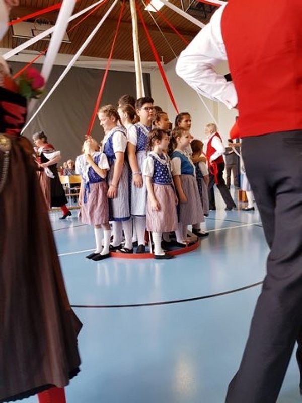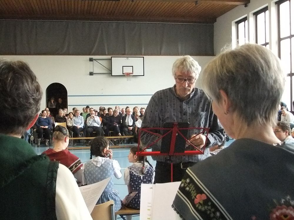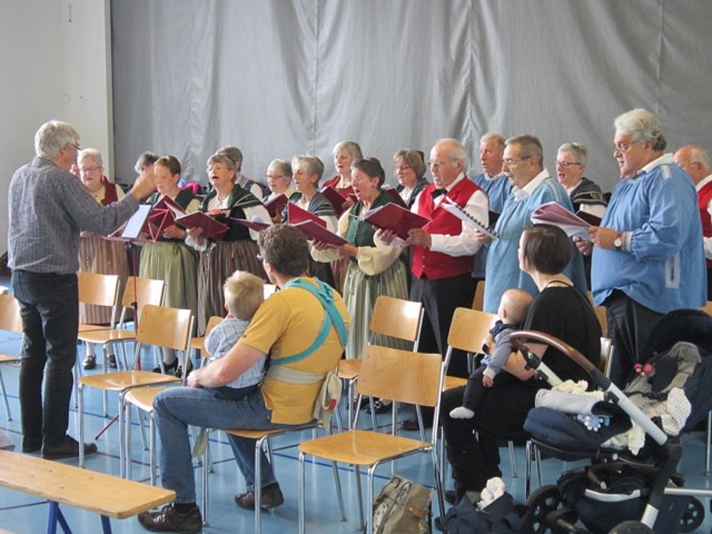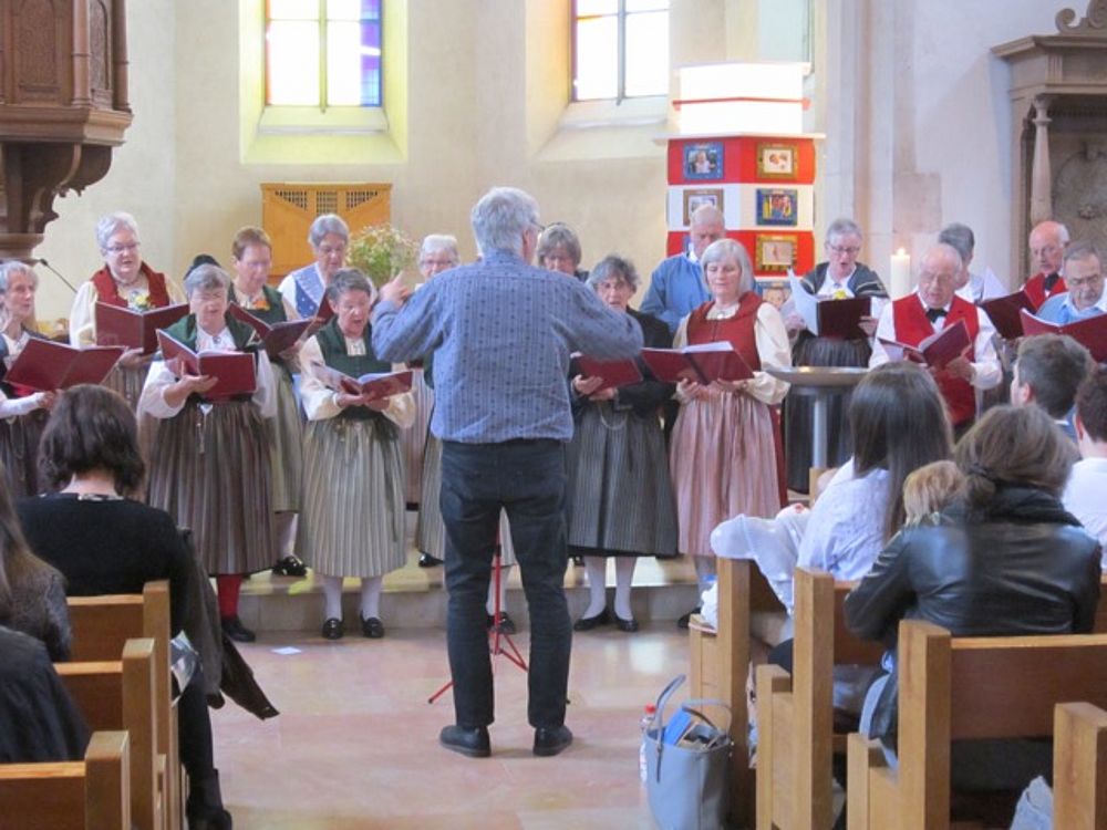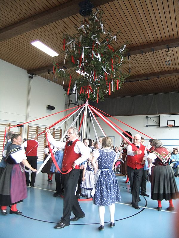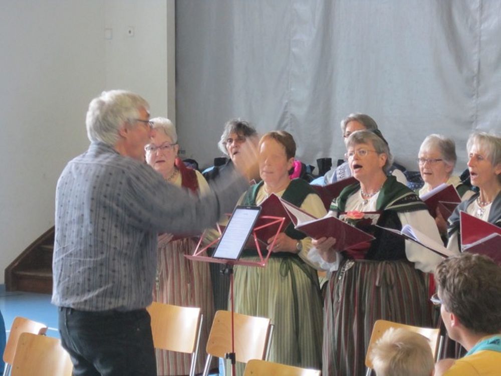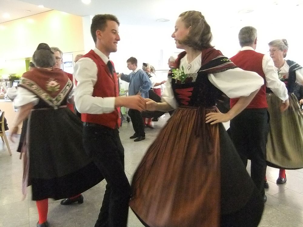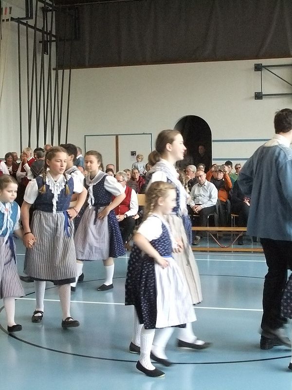 Nach der Kirchenpredigt um 10.00 Uhr, in welcher auch vier junge Erdenbürger getauft wurden und der Chor mit drei Liedern begleitete, begann um 11.15 Uhr das Maisingen und -tanzen in der Primarhalle. Übrigens selbst die Pfarrerin Frau Perret, hielt die Predigt in einer zu den Aussentemperaturen passenden Wintertracht, welche sie wie sie selber sagte mit Stolz trage, ab.