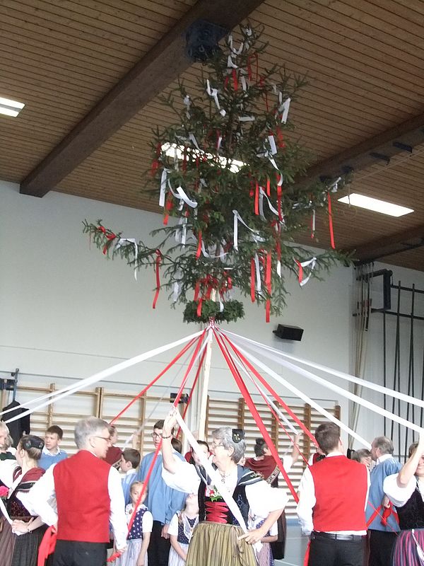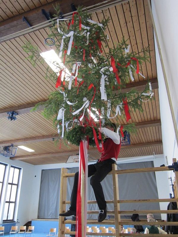 Der Winter wollte es am ersten Maisonntag vom 5. Mai nochmals wissen und beschneite am frühen Morgen die Höhenlagen rings um Sissach. Da die Temperatur an diesem Vormittag nicht über 6° anstieg, beschlossen wir das Maisingen in die für diese Fälle reservierte Primarschulhalle zu verlegen. Alsdann musste der Maibaum an die Raumhöhe angepasst werden, was Millimeter genau gemacht wurde.