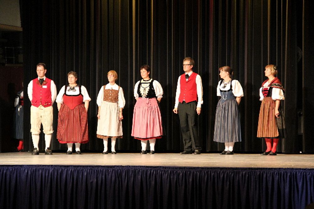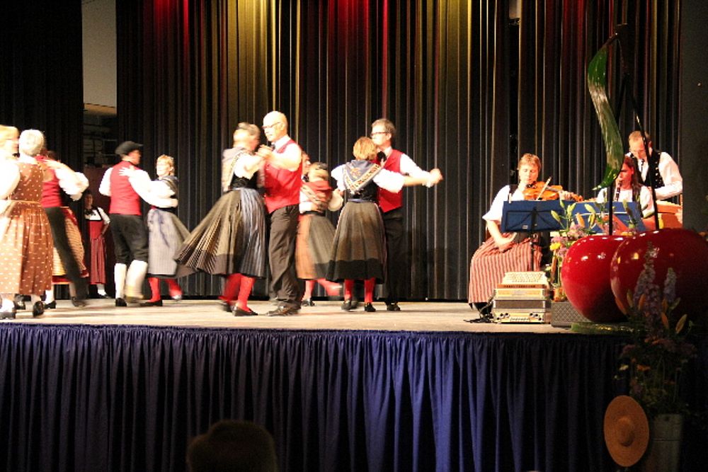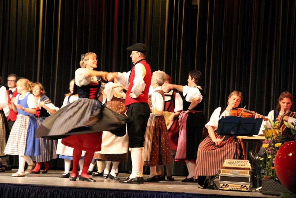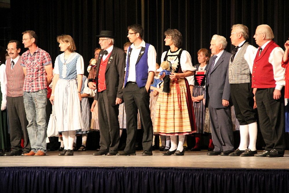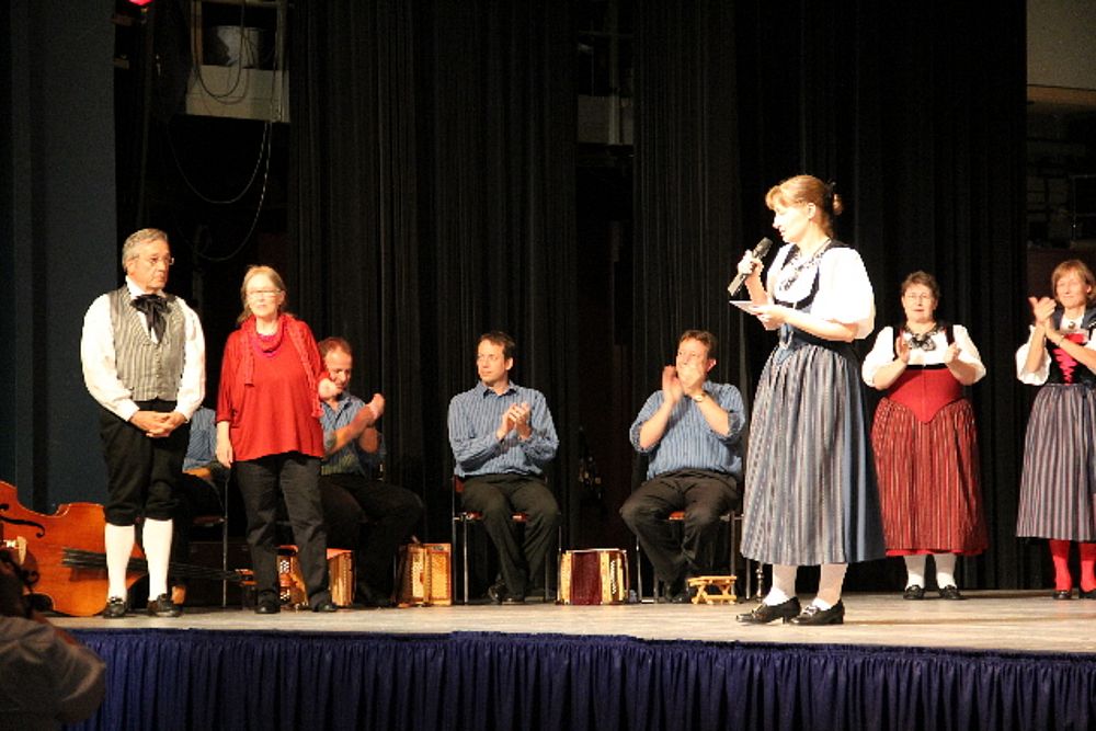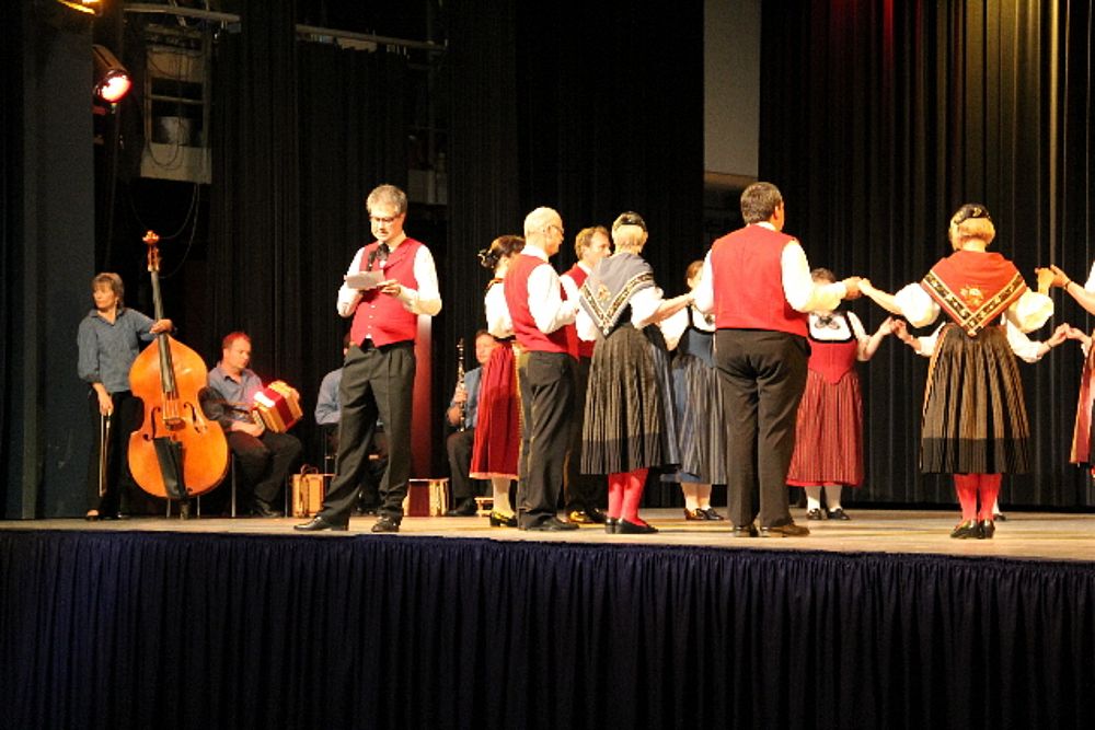 Käthi Jutzi stellt Musikkapellen und Chöre (Dirigenten Susanne Würmli und Paul Stebler) vor, Tänzer bilden Halbkreis