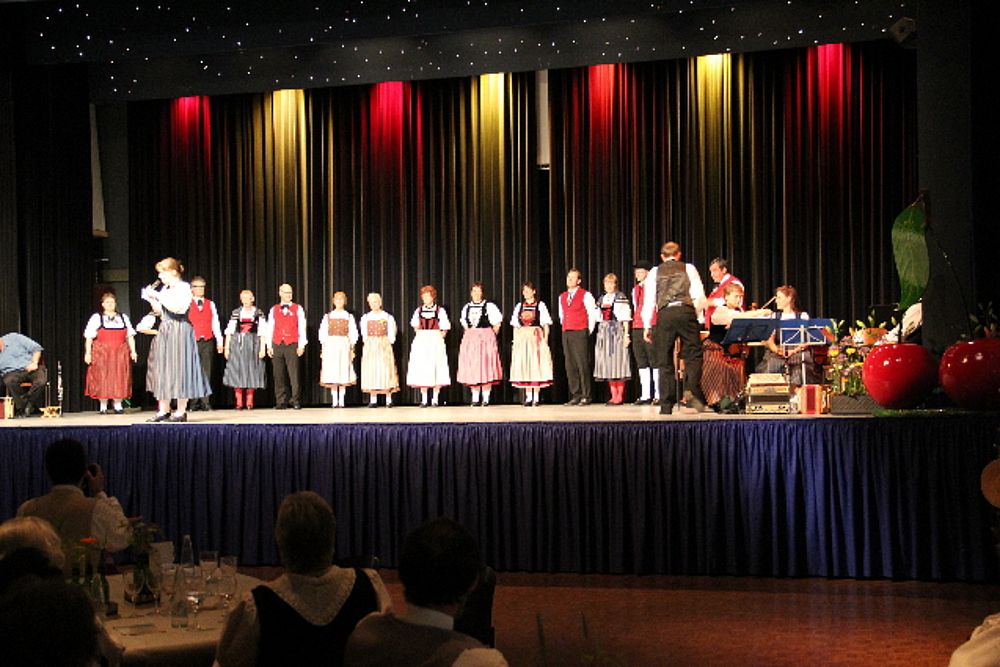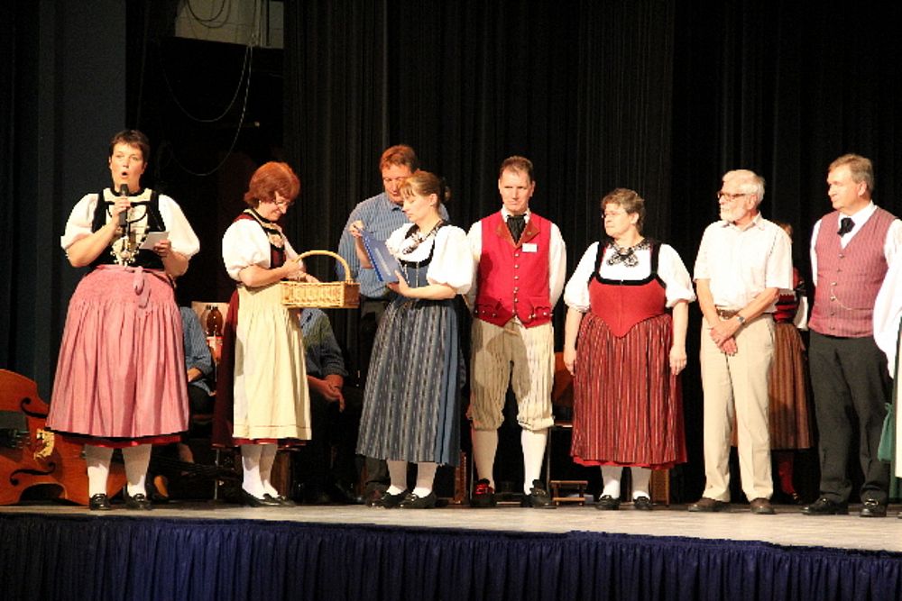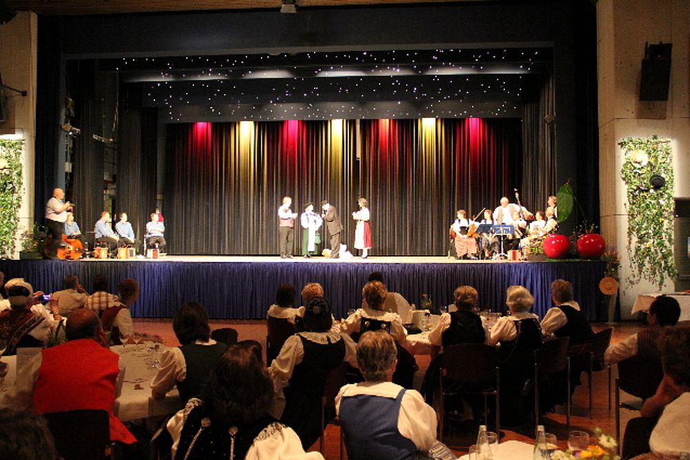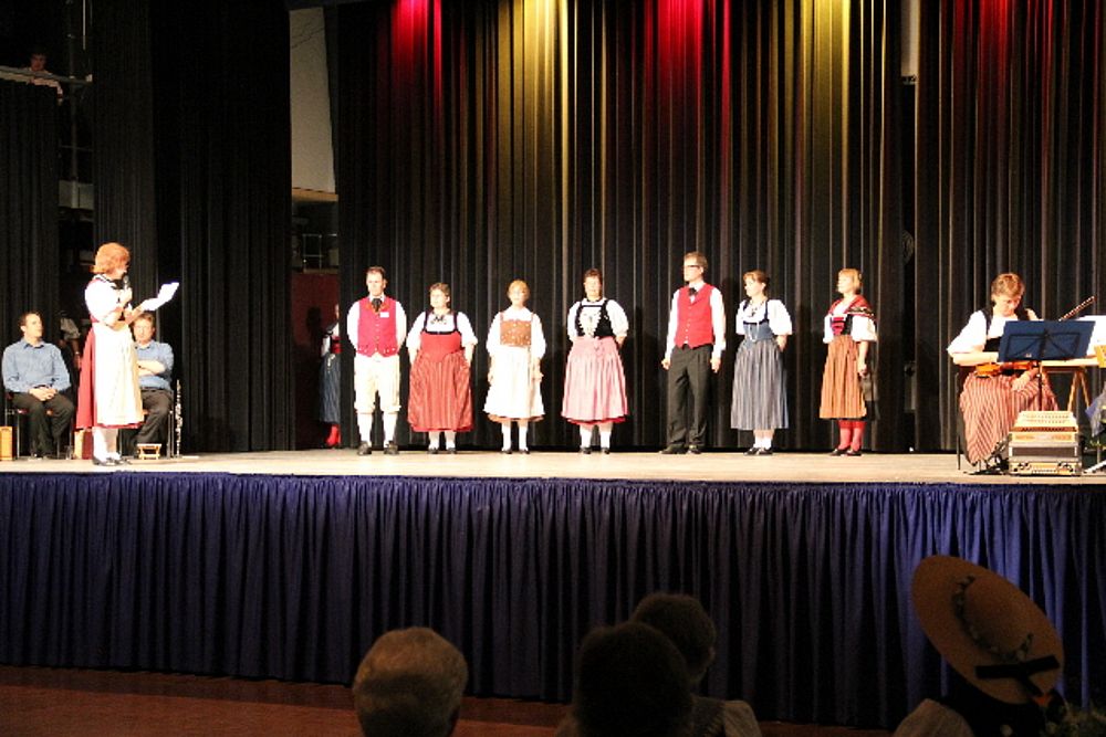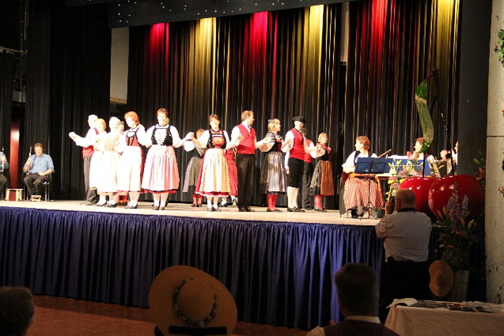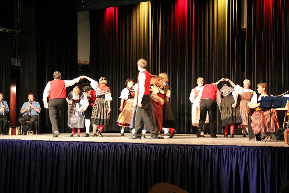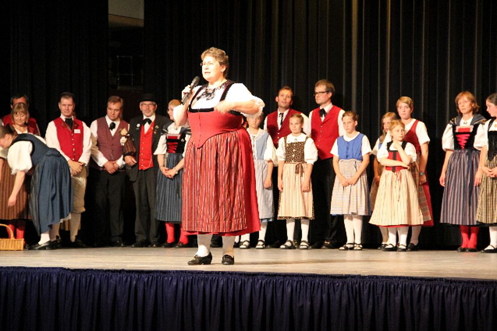 Käthi Jutzi stellt Musikkapellen und Chöre (Dirigenten Susanne Würmli und Paul Stebler) vor, Tänzer bilden Halbkreis