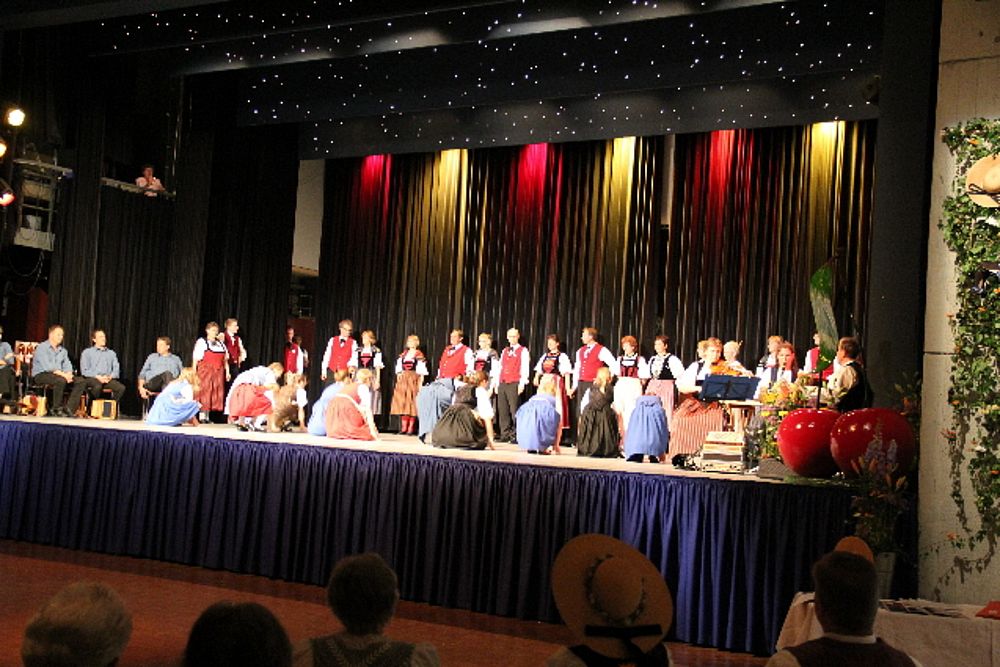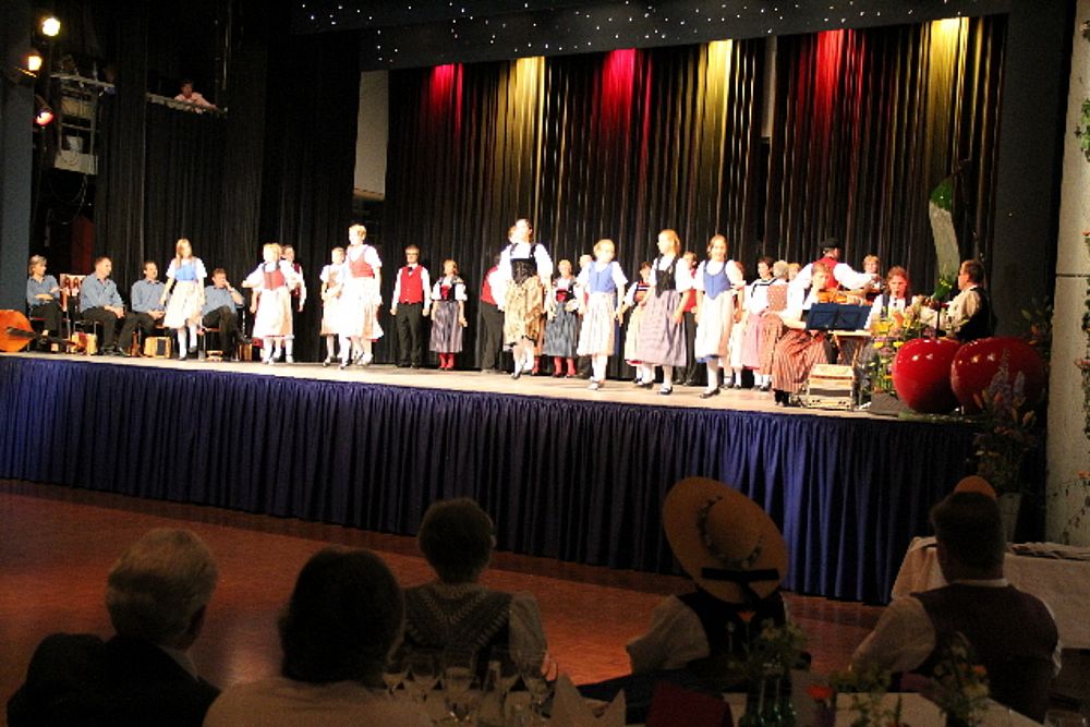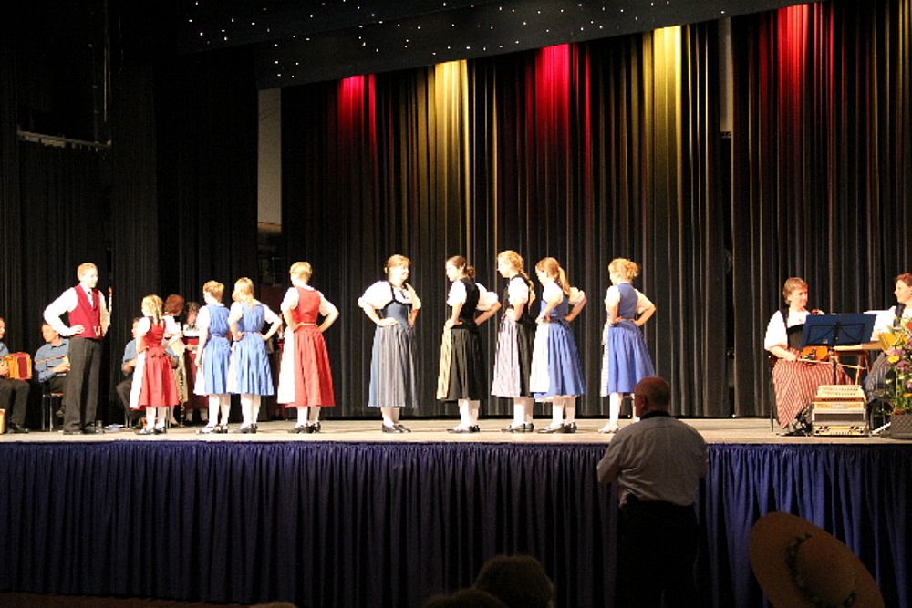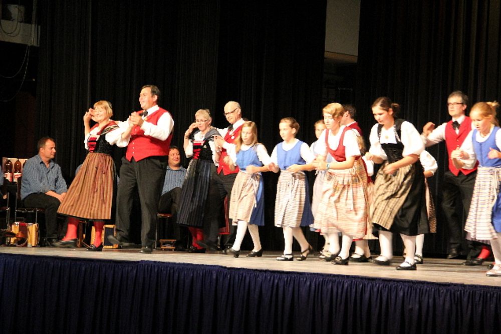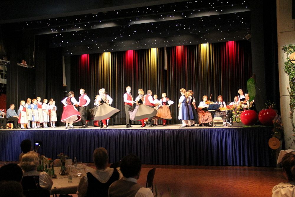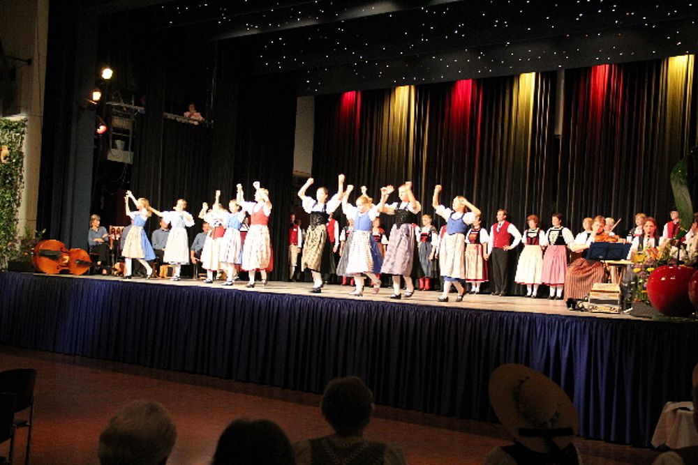 Käthi Jutzi stellt Musikkapellen und Chöre (Dirigenten Susanne Würmli und Paul Stebler) vor, Tänzer bilden Halbkreis