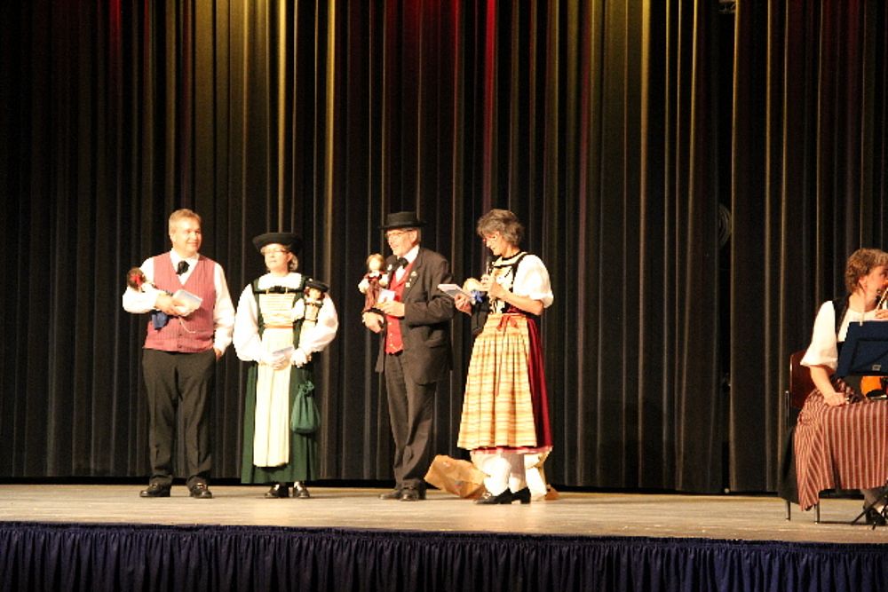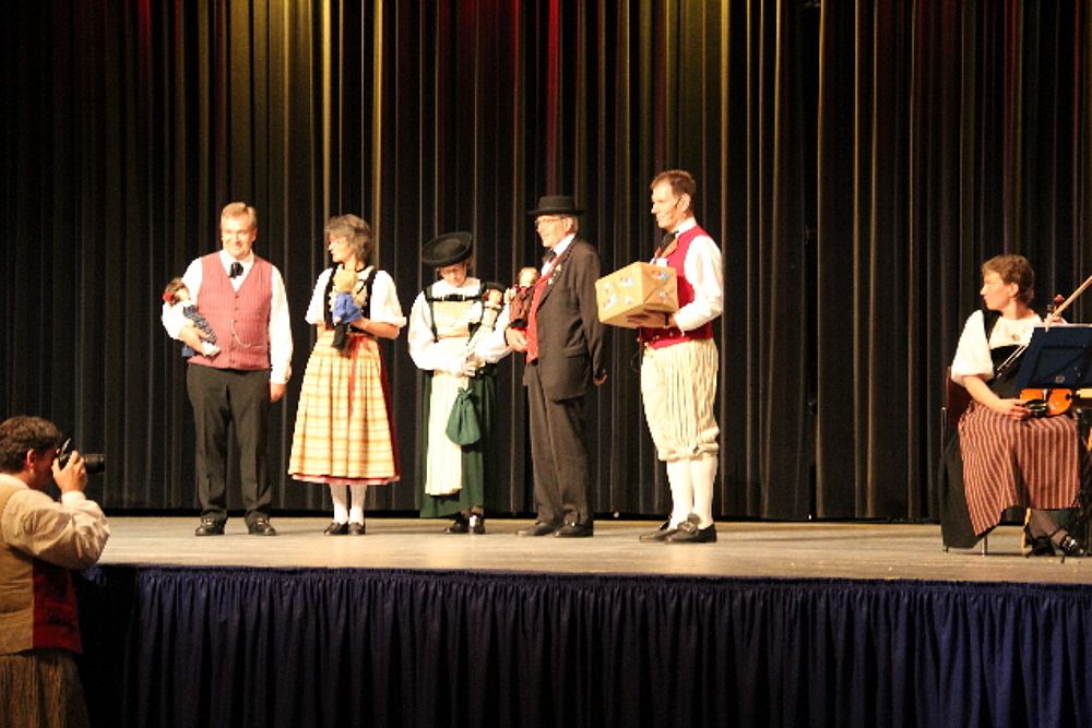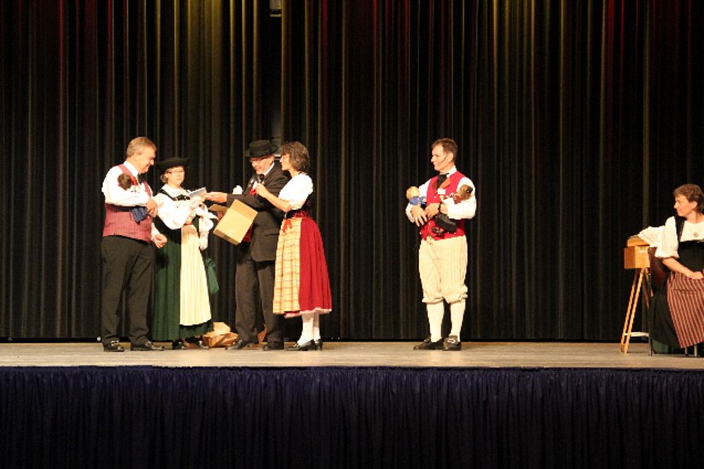 Offizielle Begrüssung durch Werni Vogel, erhält von einem Briefträger ein Expresspaket, adressiert an die Präsidenten der NWS Trachtenverbände, bittet diese auf die Bühne, Überreichung und Öffnung des Pakets.