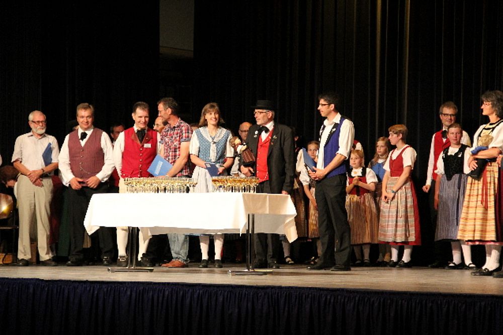 Theres Munzinger bittet alle Komponisten, Choreographen (vom Baselbiet anwesend Sabine Tschan als Vertreterin der BL-Kindertanzleiterinnen, welche „Dr Schlangen-Turbo“ choreographiert haben), Chorleiter und Produzenten auf die Bühne, verdankt die Arbeit und schenkt je eine CD