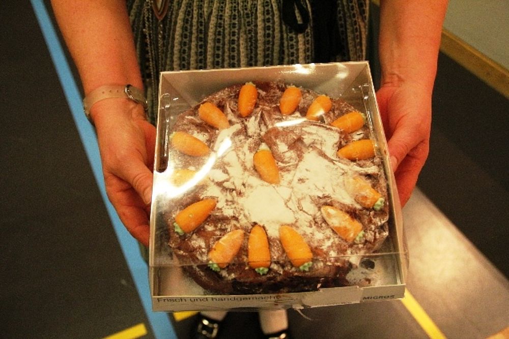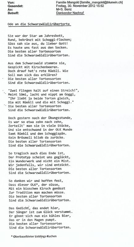 • Und auch die obligate Torte für die OLK darf nicht fehlen. Da sowohl Schwarzwälder Torte wie Rüebli Torte Favoriten sind, überreicht ihnen Sämi eine Schwarzwälder-Rüebli-Torte. Im Nachgang bedankt sich die OLK mit einer "Ode an die Schwarzwäldlirübertorte"