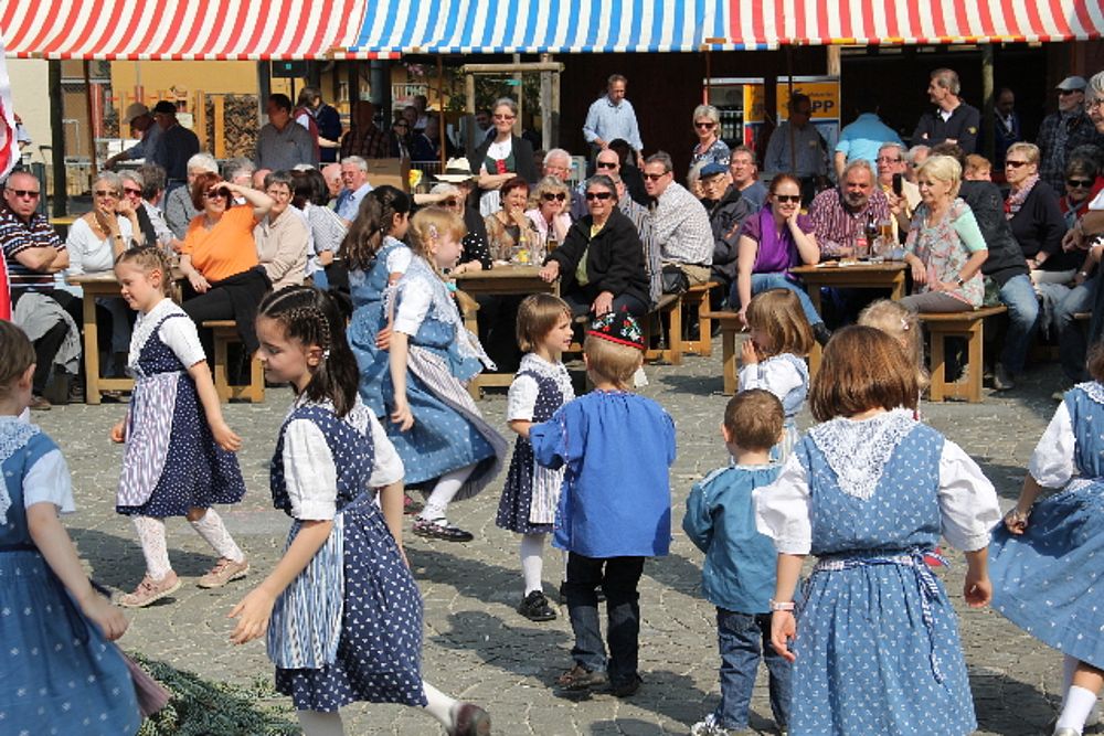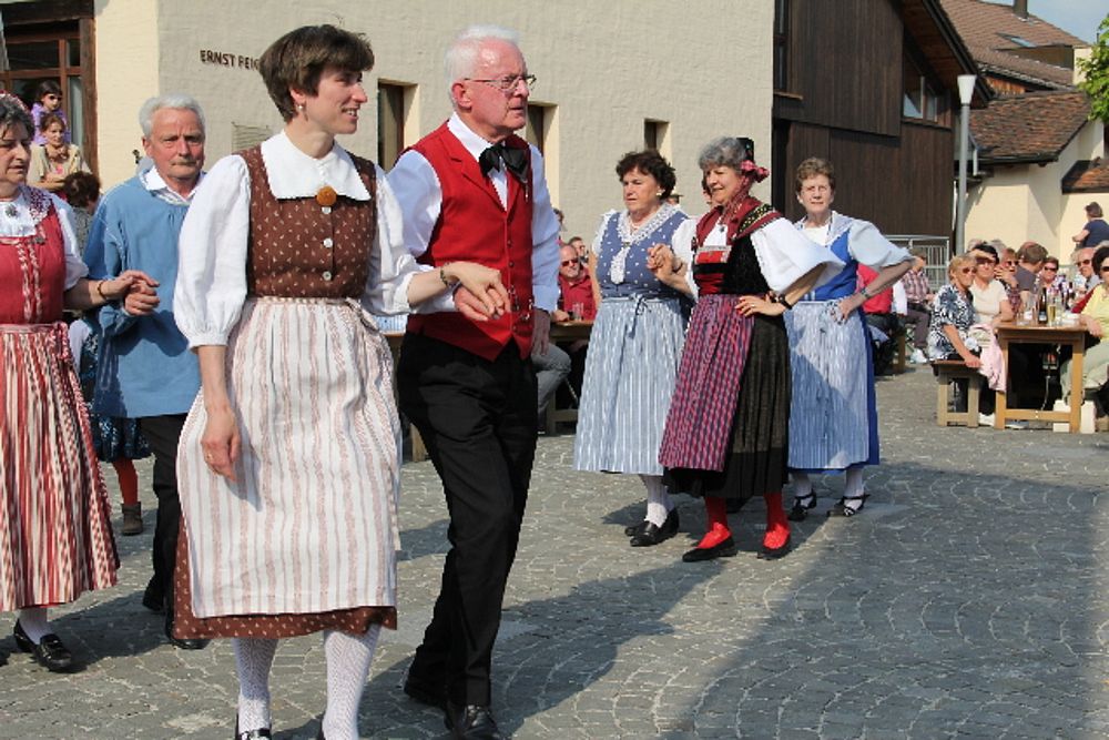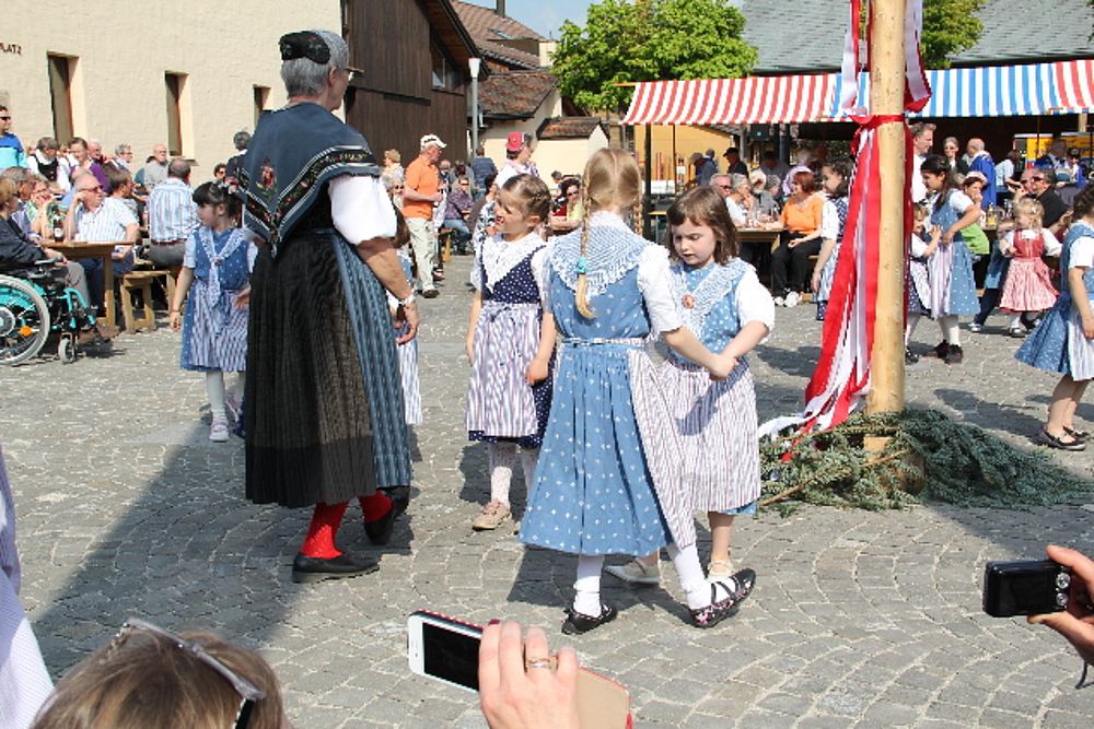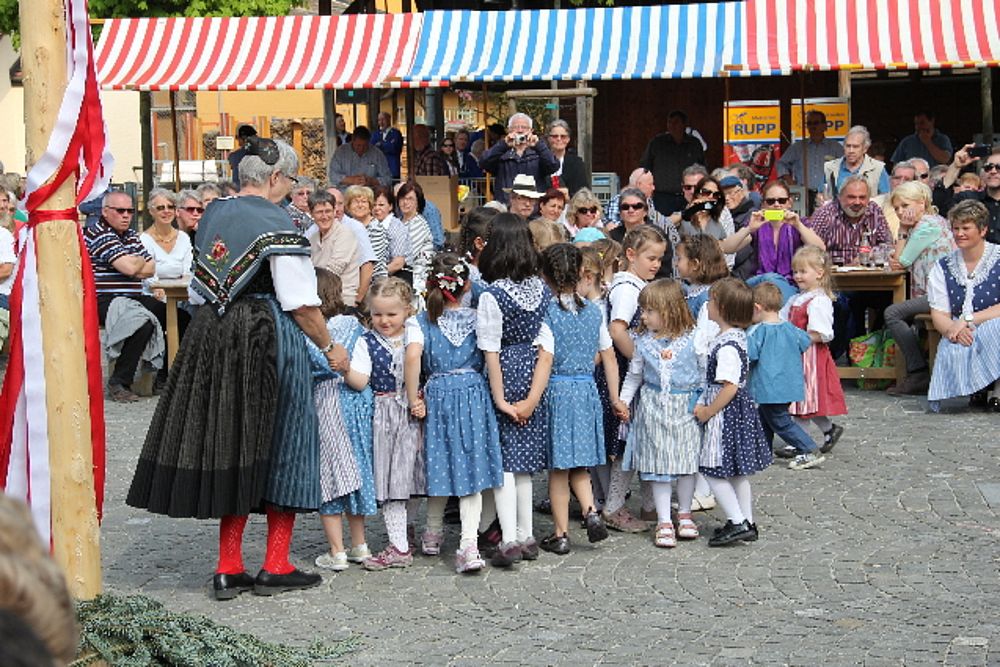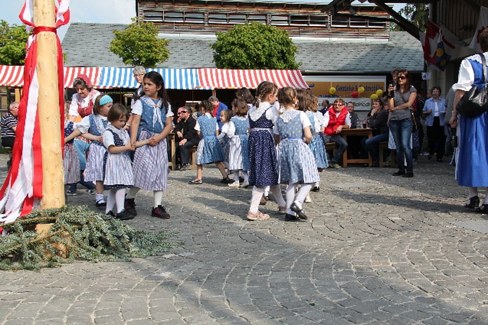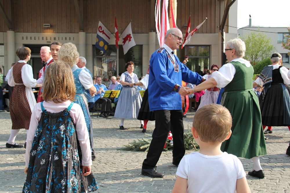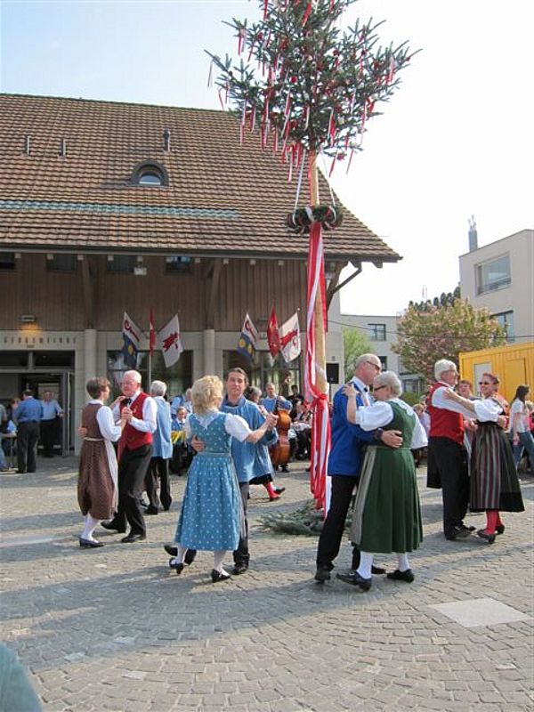 Der Ablauf wurde insofern geändert, als auf einen Besuch der beiden geschmückten Brunnen bei der Raiffeisenbank und beim Dorfplatz verzichtet wurde. Stattdessen fand alles auf dem Ernst Feigenwinter-Platz statt. Nach den Begrüssungsworten von Bürgerratspräsidenten Peter J. Meyer und der für die Kultur zuständigen Bürgerrätin Daniela Grieder lief ab 16 Uhr ein abwechslungsreiches Programm. Mitwirkende waren die Ländlerkapelle Wartebärg, die Kindertanzgruppe Birsfelden-Muttenz, der Volkstanzkreis Reinach und der Jodlerklub Reinach. Höhepunkt war traditionellerweise der Bändertanz; Geflecht und Netz glückten und liessen sich auch wieder auflösen. Die weiteren Tänze des Volkstanzkreises waren Uf der Hochwacht (mit dem Einmarsch aus mehreren Ecken), Babeligritte („Chüngelibock i gseh di“), Telefonino mio, Uf em Rösslispiel und als ausländische Tänze Lucky (USA) und Mazurka (Tschechien). Seit Beginn der Maibaumfeier hat jeweils Andrea Weber das Mitmachen des Volkstanzkreises organisiert und das Tänzerische betreut, dieses Jahr war es das letzte Mal, was der mittanzende Kantonalpräsident Sämi Benz mit einem spontanen Dankeswort würdigte.