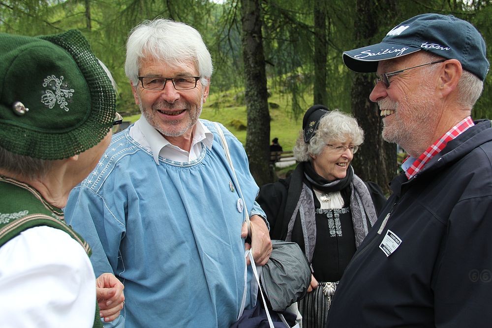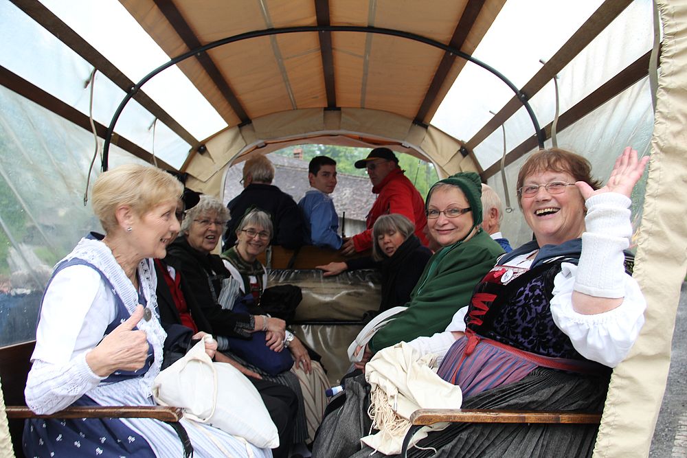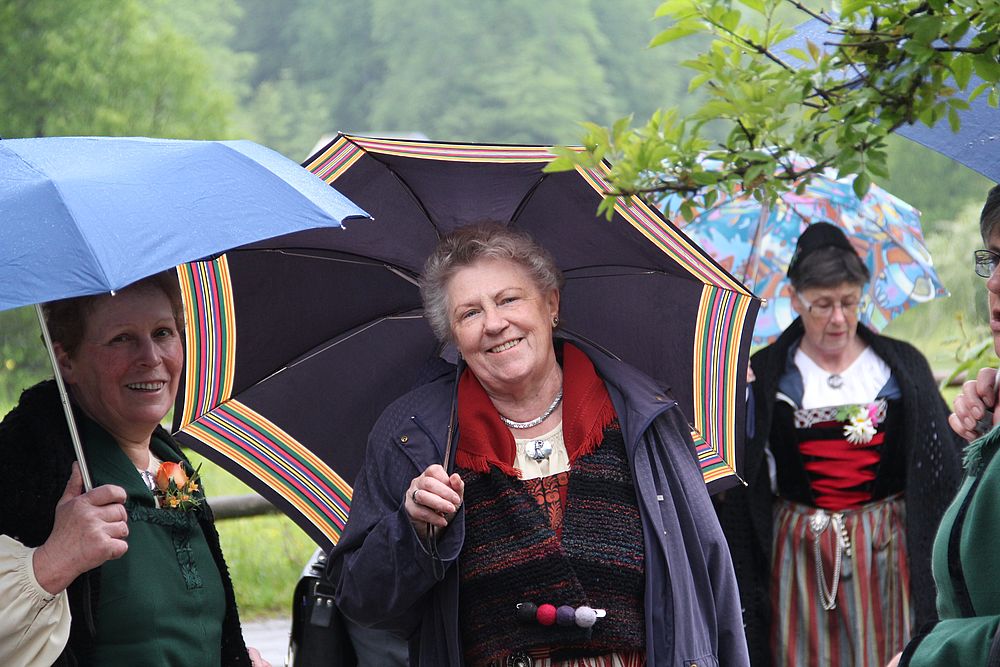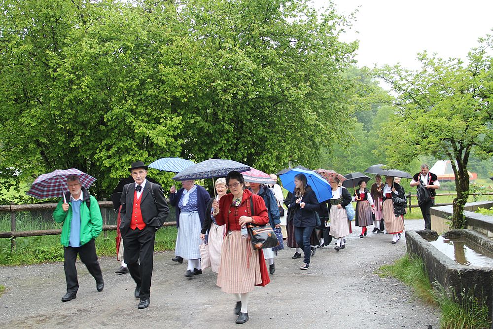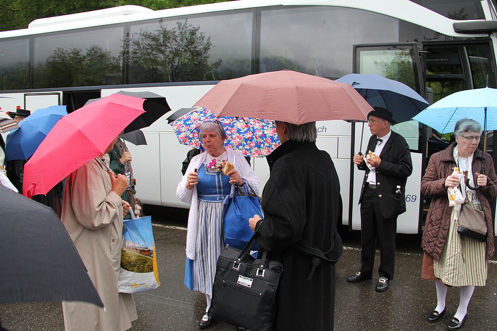 Früh morgens gab es manch besorgte Blicke zum Himmel. Was hat Petrus wohl vor für heute, lässt er die Schleusen zu? Er liess uns Trachtenleute nicht im Stich. Im Mittelland signalisierte er, dass es die Sonne noch gibt, beim Erreichen der Alpen leerte er seine letzten Kübel und bei der Ankunft um 9 Uhr nieselte es noch ein wenig, immer weniger und beim Schlussevent aller Aktiven schaute gar die Sonne zu.