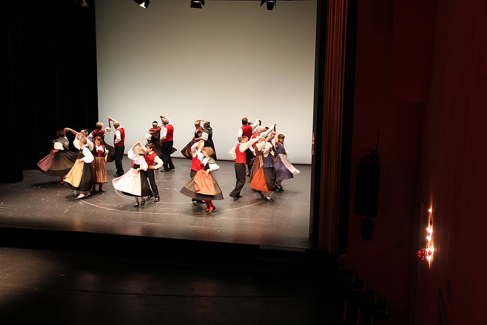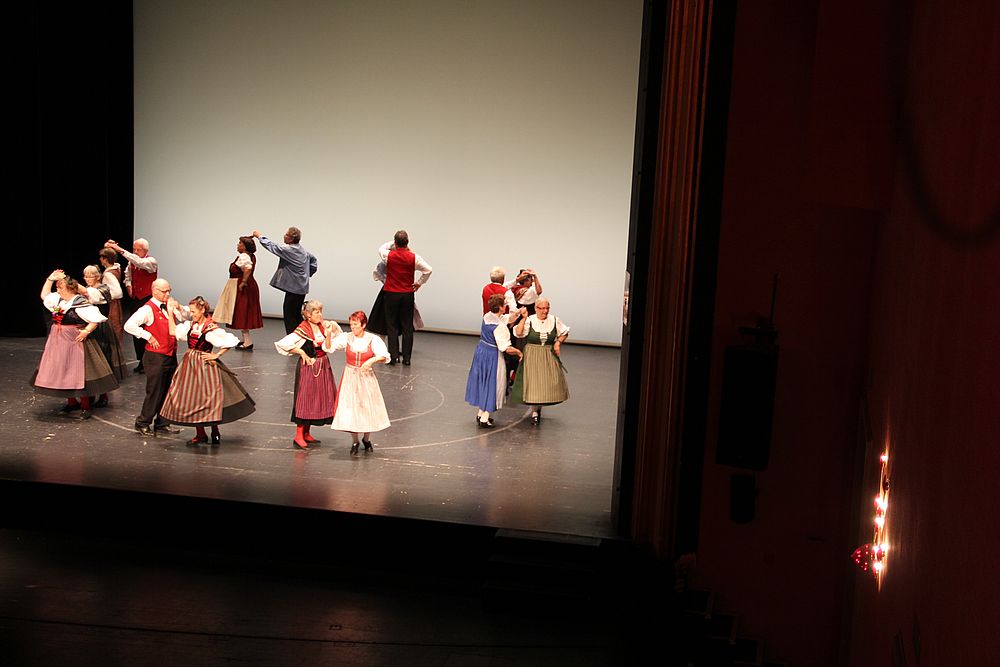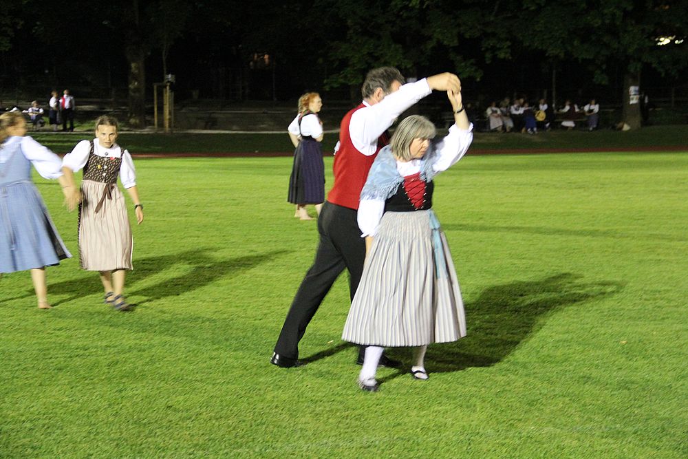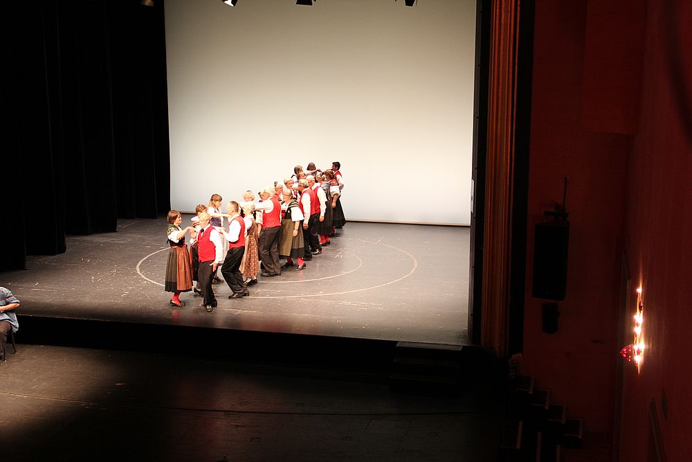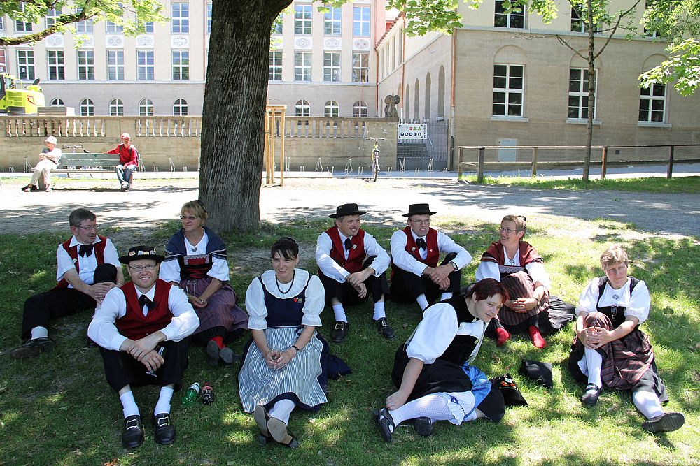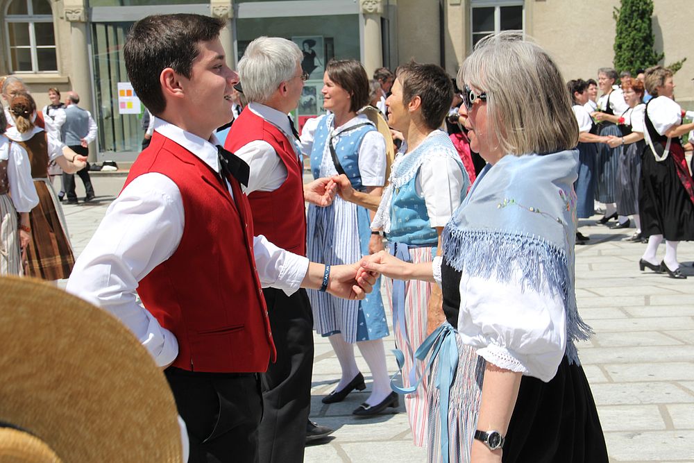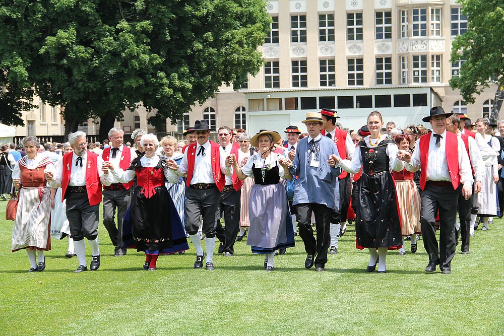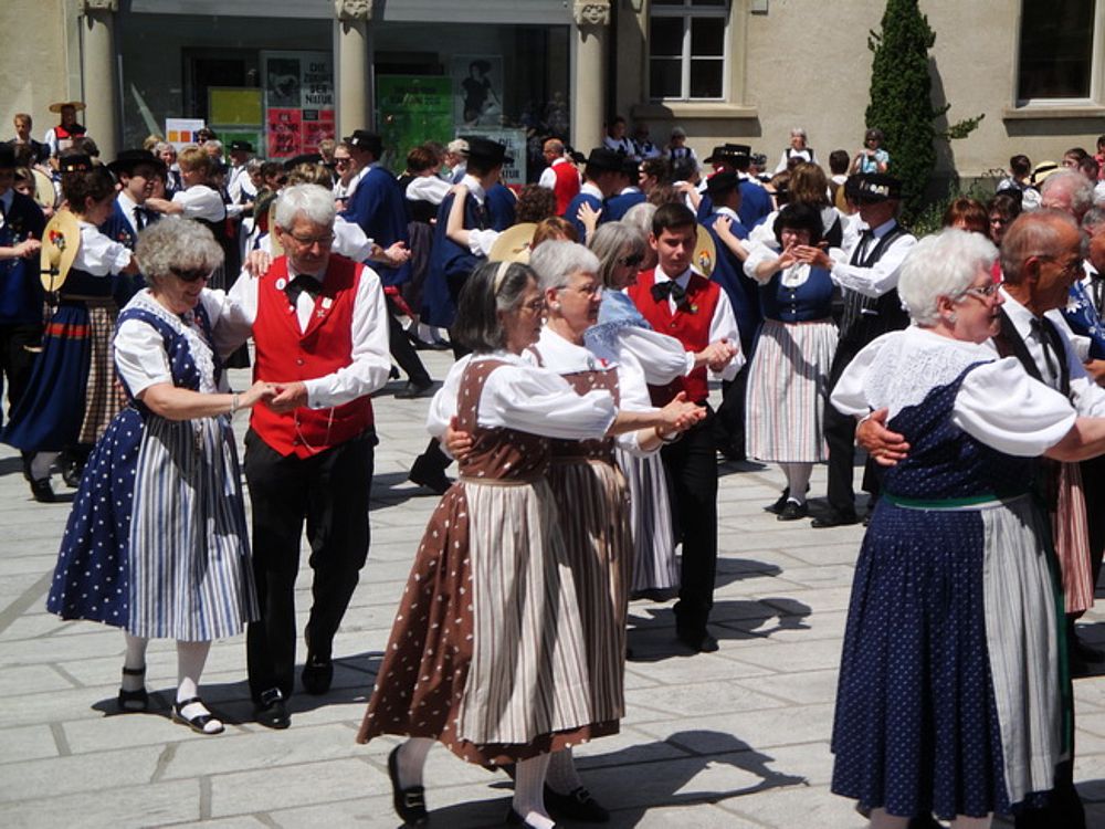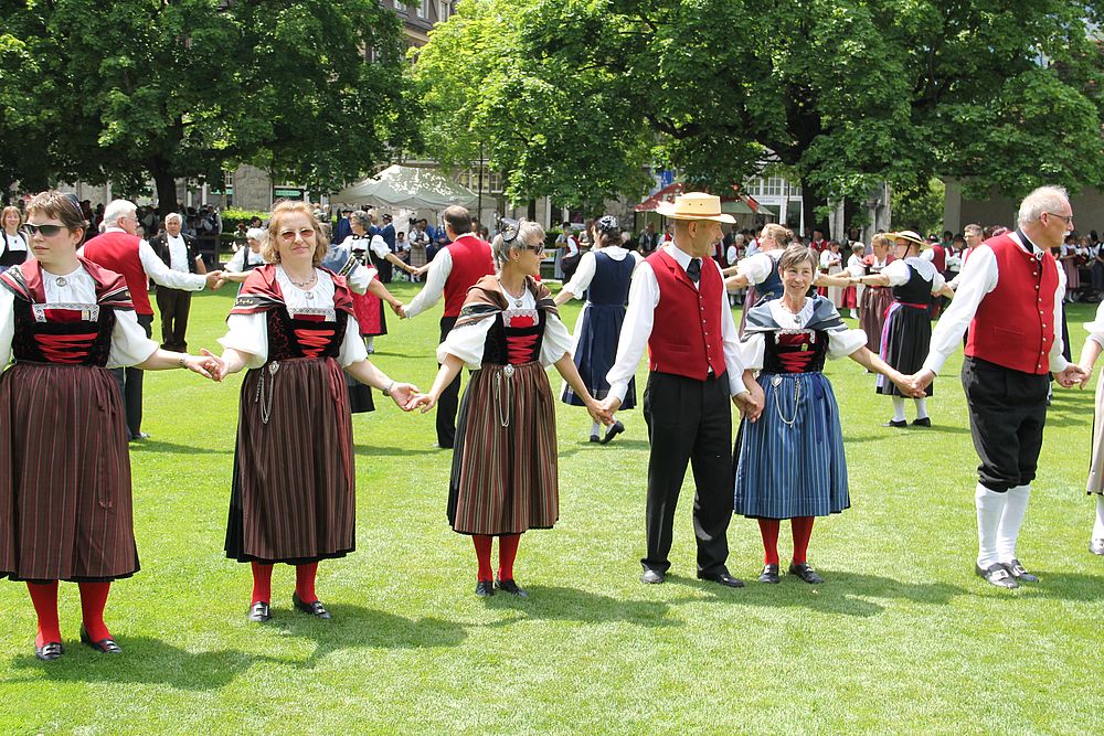 Um 13.30 Uhr begann das Volkstanzfest, sowohl auf der Quaderwiese wie auf dem Theaterplatz, jeweils mit einer Polonaise. Jene auf der Quaderwiese klappte ausgezeichnet, jene auf dem Theaterplatz litt unter Platzknappheit. Und dann folgten unzählige Blöcke an Volkstänzen und freiem Tanzen, zu den Klängen von 10 Musikkapellen. Parallel dazu fanden im Theater Tanzvorführungen statt. Vom Baselbiet wagten sich auf die Bühne, von insgesamt 26 vorführenden Gruppen, die Jugendgruppe Liestal - Stubete-Quadrille, en Änglische und Kalamajka (Böhmen); herrlich wie die Jugendlichen den Kalamajka-Schritt auf die Bühne legten und entsprechend das Ganze nach tosendem Applaus wiederholen durften -, die TG Muttenz - mit 2 Eigenchoreographien Zwanzig (20) und Nid lang gfacklet sowie als Abschluss der Letscht. Die Samstags-Vorführungen abgeschlossen hat der Volkstanzkreis Reinach mit 2 ausländischen Tänzen (Chestnut aus England und Fryksdalsdans aus Schweden), unterbrochen vom Summervogel mit seiner Mozart-Musik. Erwähnt sei auch die Gruppe Jestavo (Jungi Erwachseni tanzed Volkstänz), in welcher auch 3 Baselbieterinnen mitmachen. Alt und neu, traditionell und modern – was für Kombinationsmöglichkeiten es doch gibt!