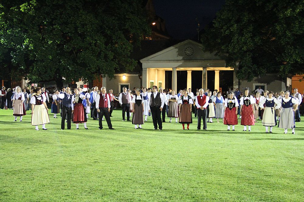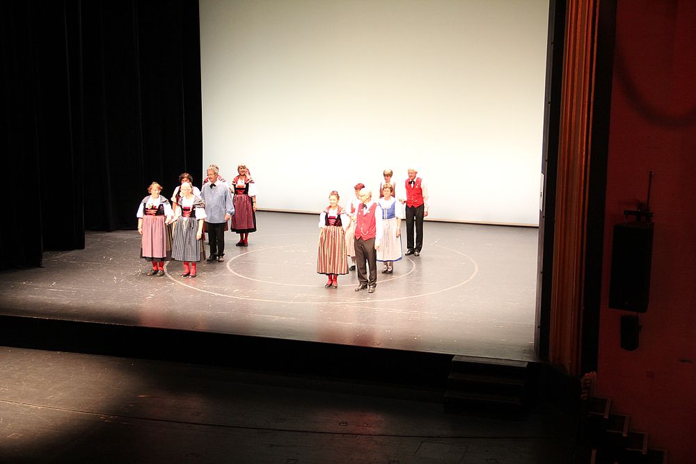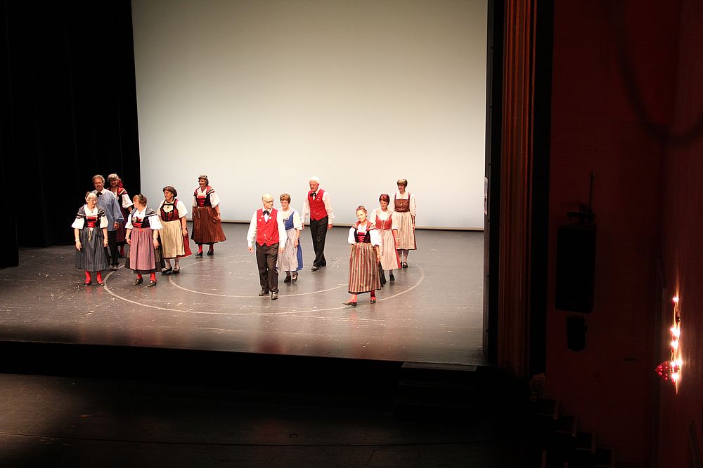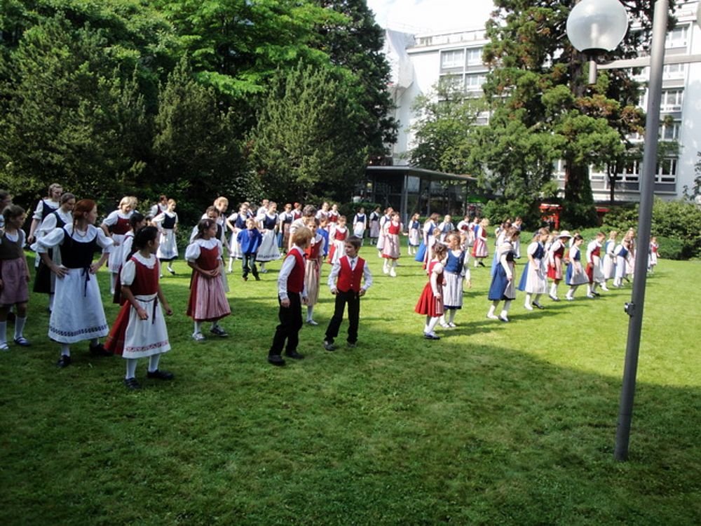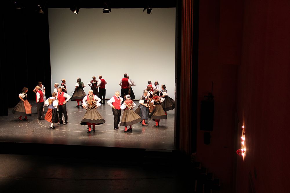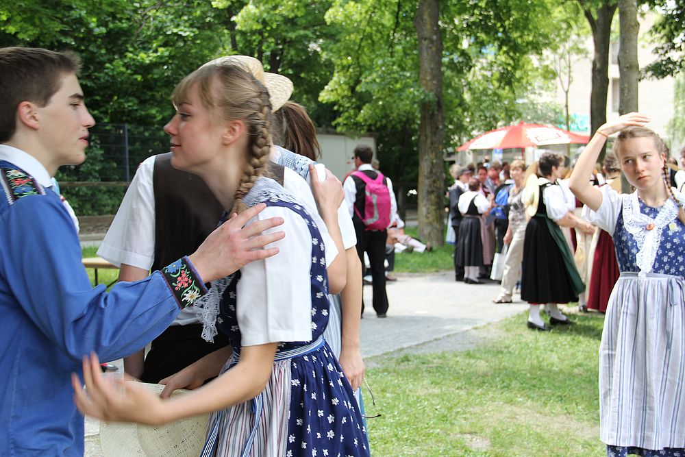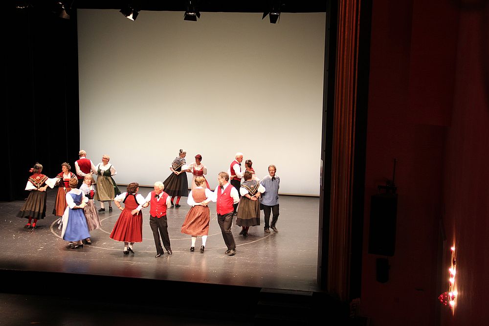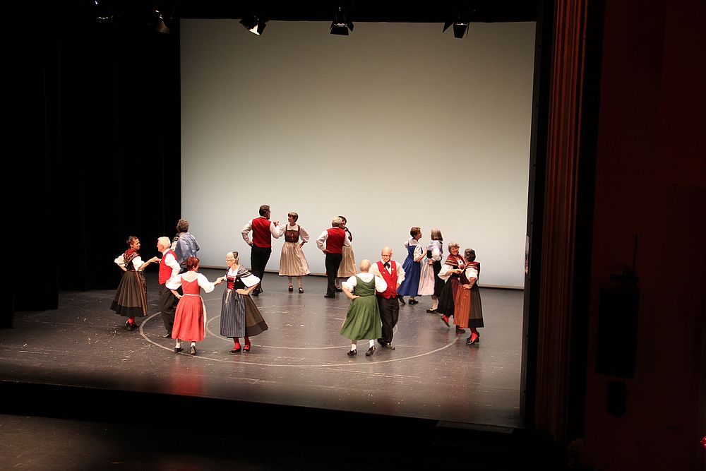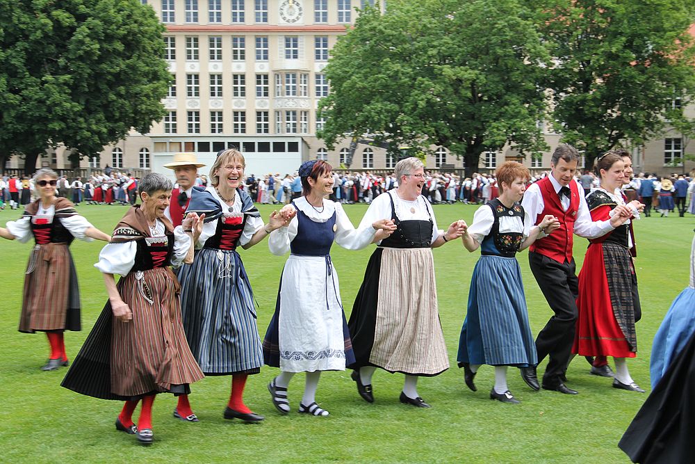 Um 13.30 Uhr begann das Volkstanzfest, sowohl auf der Quaderwiese wie auf dem Theaterplatz, jeweils mit einer Polonaise. Jene auf der Quaderwiese klappte ausgezeichnet, jene auf dem Theaterplatz litt unter Platzknappheit. Und dann folgten unzählige Blöcke an Volkstänzen und freiem Tanzen, zu den Klängen von 10 Musikkapellen. Parallel dazu fanden im Theater Tanzvorführungen statt. Vom Baselbiet wagten sich auf die Bühne, von insgesamt 26 vorführenden Gruppen, die Jugendgruppe Liestal - Stubete-Quadrille, en Änglische und Kalamajka (Böhmen); herrlich wie die Jugendlichen den Kalamajka-Schritt auf die Bühne legten und entsprechend das Ganze nach tosendem Applaus wiederholen durften -, die TG Muttenz - mit 2 Eigenchoreographien Zwanzig (20) und Nid lang gfacklet sowie als Abschluss der Letscht. Die Samstags-Vorführungen abgeschlossen hat der Volkstanzkreis Reinach mit 2 ausländischen Tänzen (Chestnut aus England und Fryksdalsdans aus Schweden), unterbrochen vom Summervogel mit seiner Mozart-Musik. Erwähnt sei auch die Gruppe Jestavo (Jungi Erwachseni tanzed Volkstänz), in welcher auch 3 Baselbieterinnen mitmachen. Alt und neu, traditionell und modern – was für Kombinationsmöglichkeiten es doch gibt!