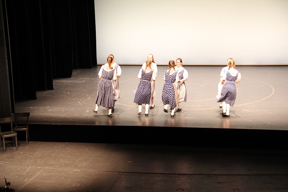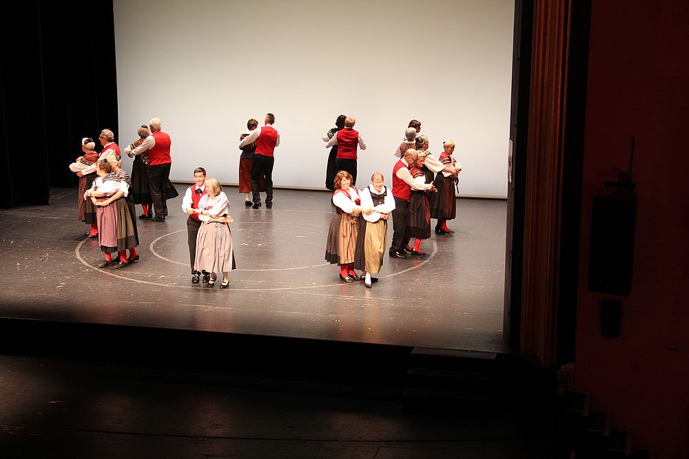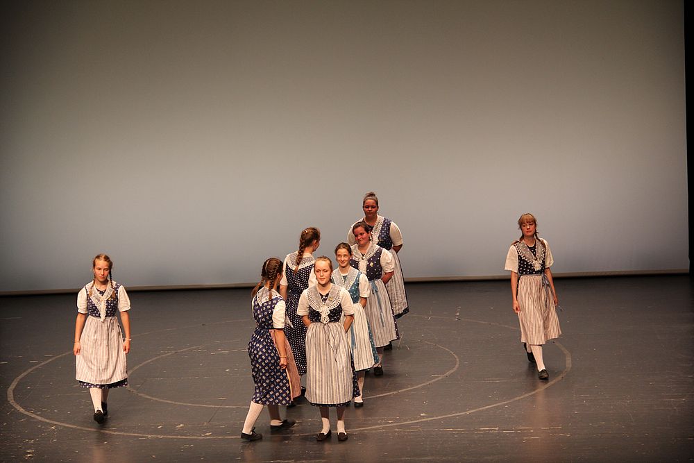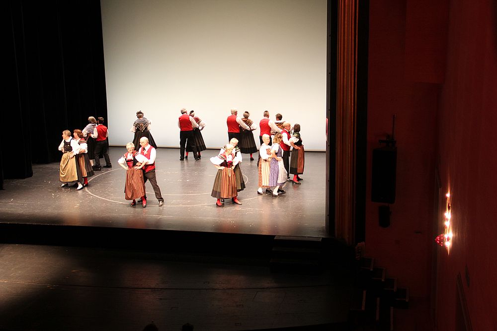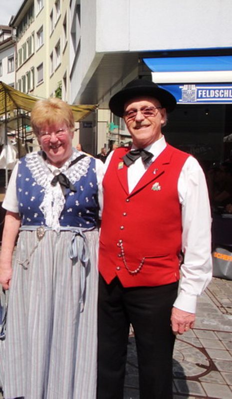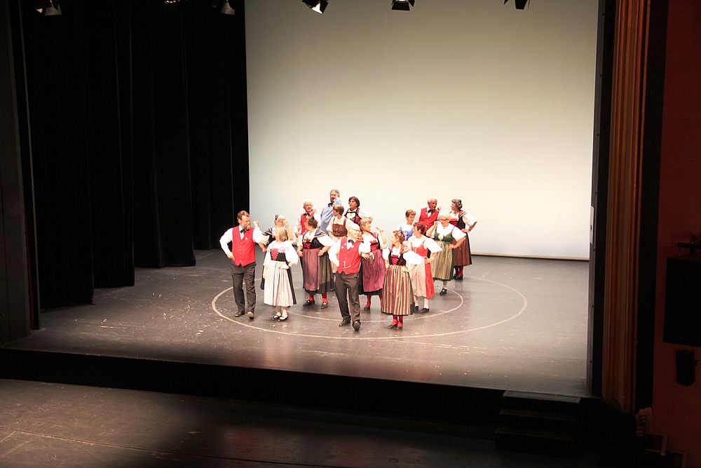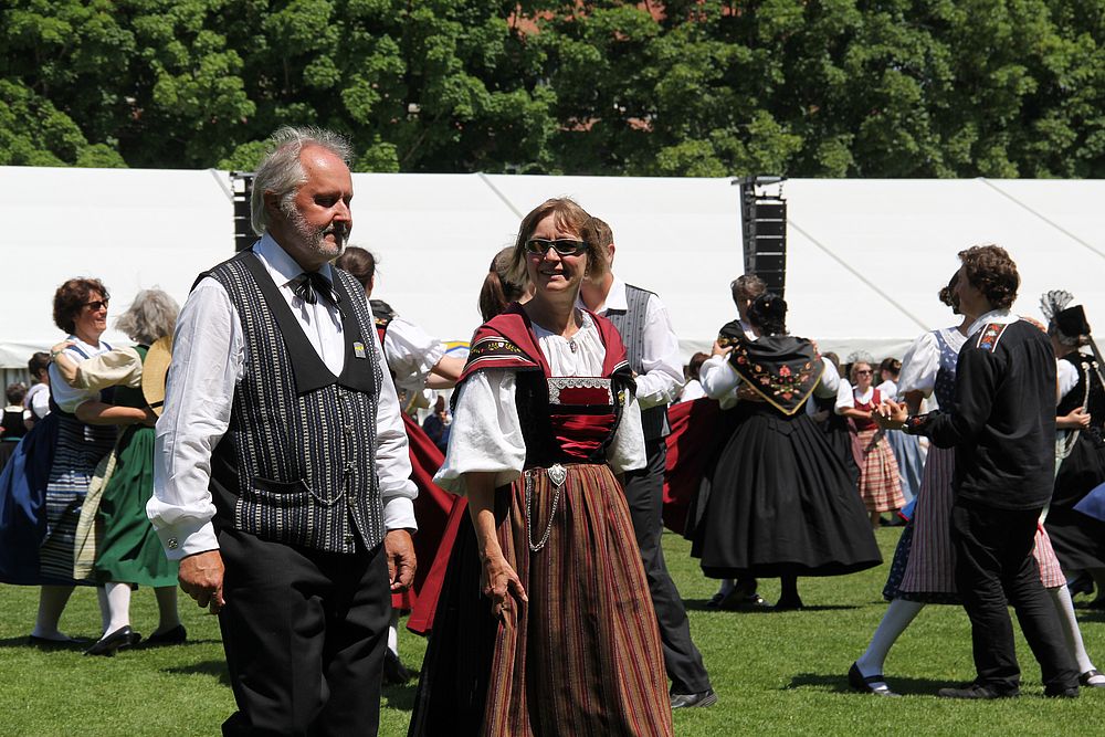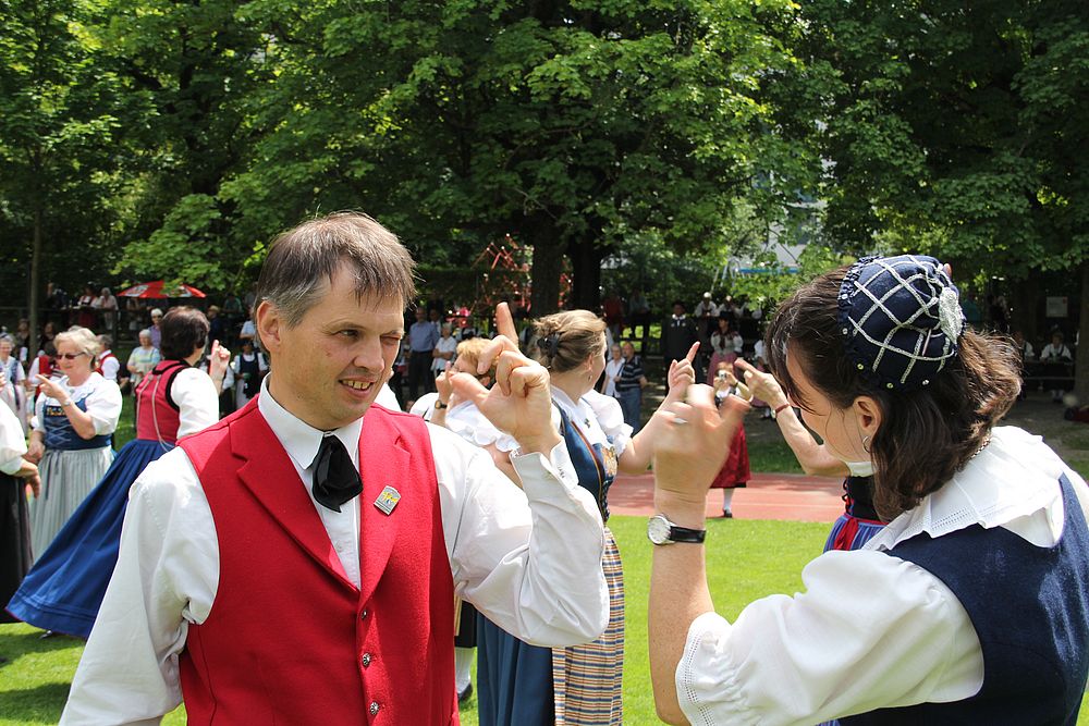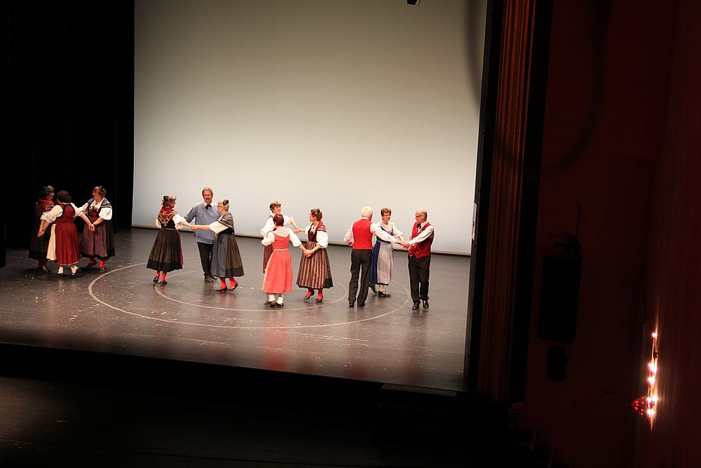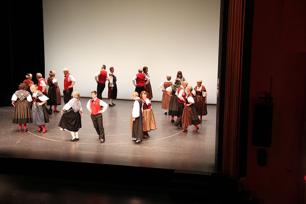 Um 13.30 Uhr begann das Volkstanzfest, sowohl auf der Quaderwiese wie auf dem Theaterplatz, jeweils mit einer Polonaise. Jene auf der Quaderwiese klappte ausgezeichnet, jene auf dem Theaterplatz litt unter Platzknappheit. Und dann folgten unzählige Blöcke an Volkstänzen und freiem Tanzen, zu den Klängen von 10 Musikkapellen. Parallel dazu fanden im Theater Tanzvorführungen statt. Vom Baselbiet wagten sich auf die Bühne, von insgesamt 26 vorführenden Gruppen, die Jugendgruppe Liestal - Stubete-Quadrille, en Änglische und Kalamajka (Böhmen); herrlich wie die Jugendlichen den Kalamajka-Schritt auf die Bühne legten und entsprechend das Ganze nach tosendem Applaus wiederholen durften -, die TG Muttenz - mit 2 Eigenchoreographien Zwanzig (20) und Nid lang gfacklet sowie als Abschluss der Letscht. Die Samstags-Vorführungen abgeschlossen hat der Volkstanzkreis Reinach mit 2 ausländischen Tänzen (Chestnut aus England und Fryksdalsdans aus Schweden), unterbrochen vom Summervogel mit seiner Mozart-Musik. Erwähnt sei auch die Gruppe Jestavo (Jungi Erwachseni tanzed Volkstänz), in welcher auch 3 Baselbieterinnen mitmachen. Alt und neu, traditionell und modern – was für Kombinationsmöglichkeiten es doch gibt!