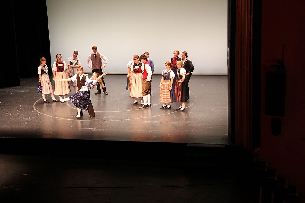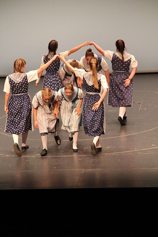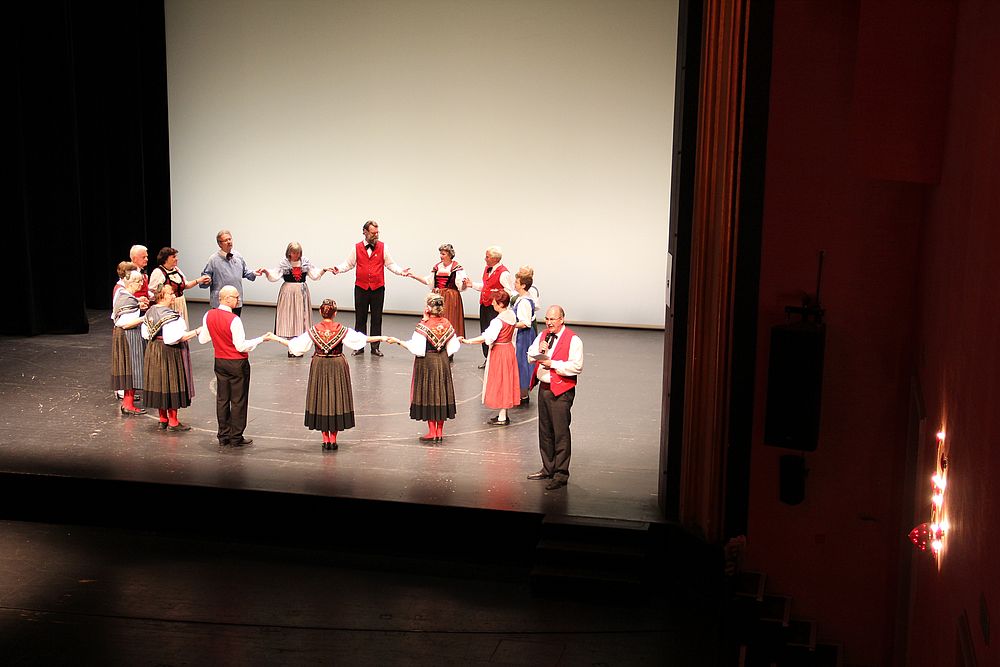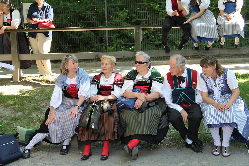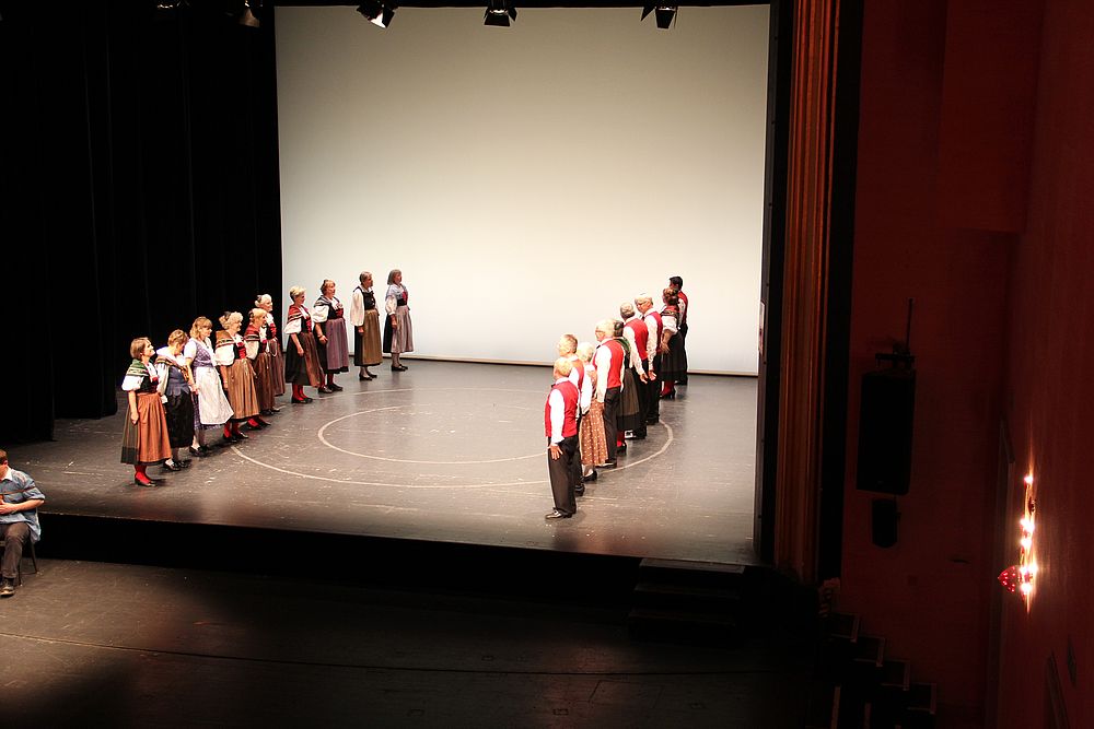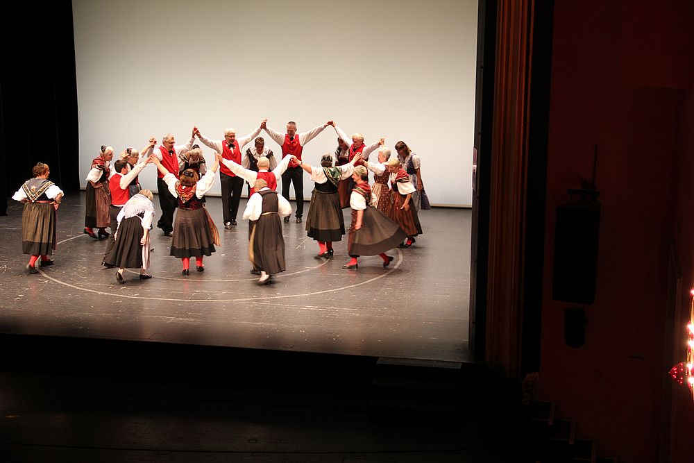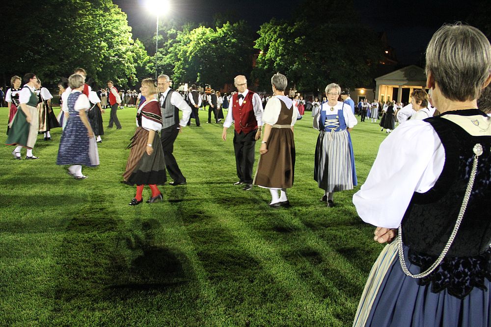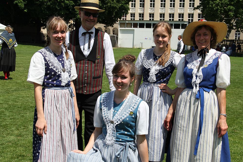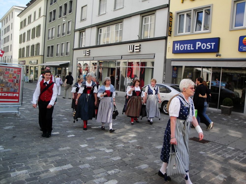 Um 13.30 Uhr begann das Volkstanzfest, sowohl auf der Quaderwiese wie auf dem Theaterplatz, jeweils mit einer Polonaise. Jene auf der Quaderwiese klappte ausgezeichnet, jene auf dem Theaterplatz litt unter Platzknappheit. Und dann folgten unzählige Blöcke an Volkstänzen und freiem Tanzen, zu den Klängen von 10 Musikkapellen. Parallel dazu fanden im Theater Tanzvorführungen statt. Vom Baselbiet wagten sich auf die Bühne, von insgesamt 26 vorführenden Gruppen, die Jugendgruppe Liestal - Stubete-Quadrille, en Änglische und Kalamajka (Böhmen); herrlich wie die Jugendlichen den Kalamajka-Schritt auf die Bühne legten und entsprechend das Ganze nach tosendem Applaus wiederholen durften -, die TG Muttenz - mit 2 Eigenchoreographien Zwanzig (20) und Nid lang gfacklet sowie als Abschluss der Letscht. Die Samstags-Vorführungen abgeschlossen hat der Volkstanzkreis Reinach mit 2 ausländischen Tänzen (Chestnut aus England und Fryksdalsdans aus Schweden), unterbrochen vom Summervogel mit seiner Mozart-Musik. Erwähnt sei auch die Gruppe Jestavo (Jungi Erwachseni tanzed Volkstänz), in welcher auch 3 Baselbieterinnen mitmachen. Alt und neu, traditionell und modern – was für Kombinationsmöglichkeiten es doch gibt!