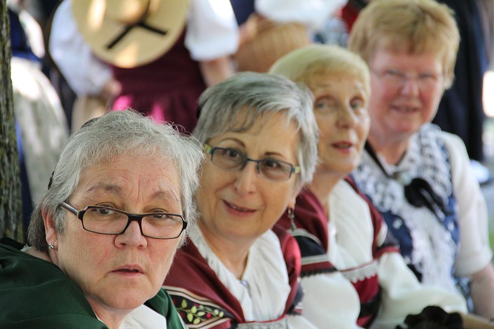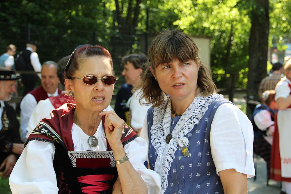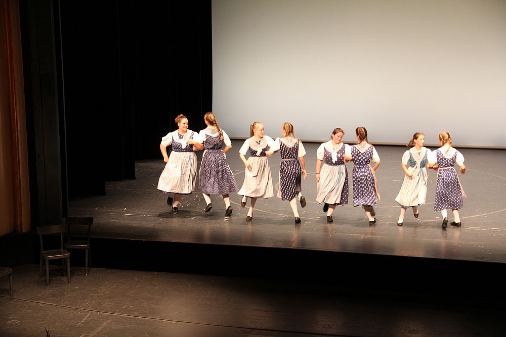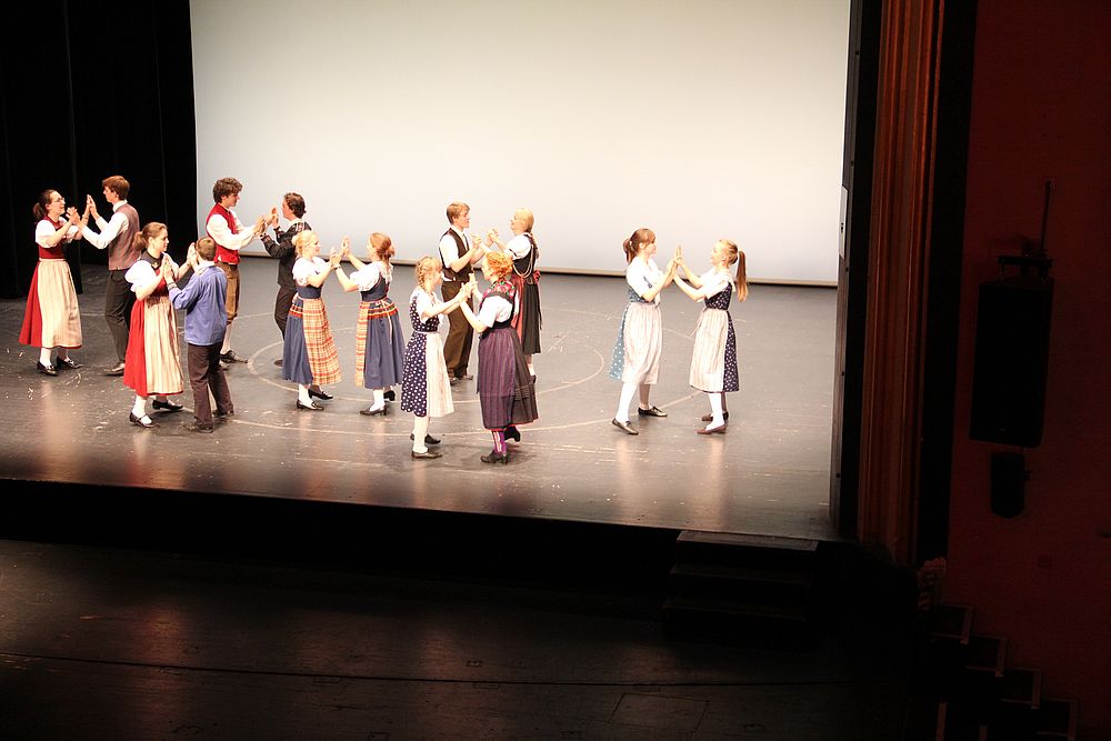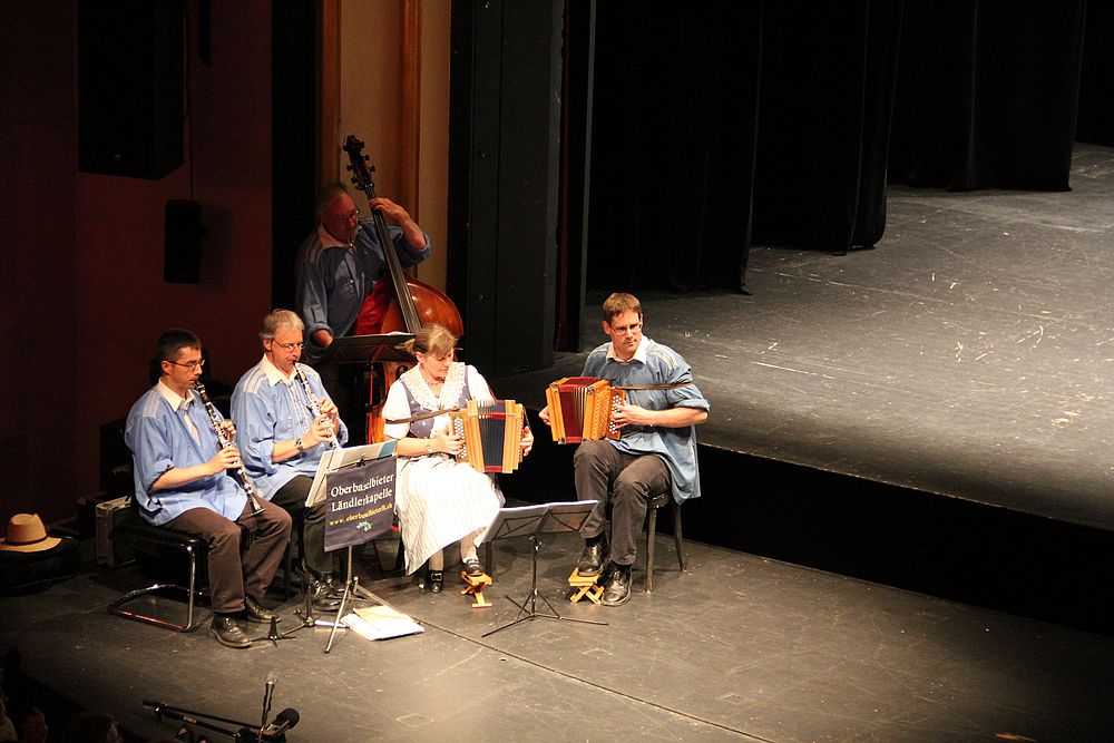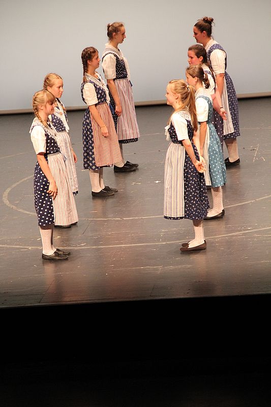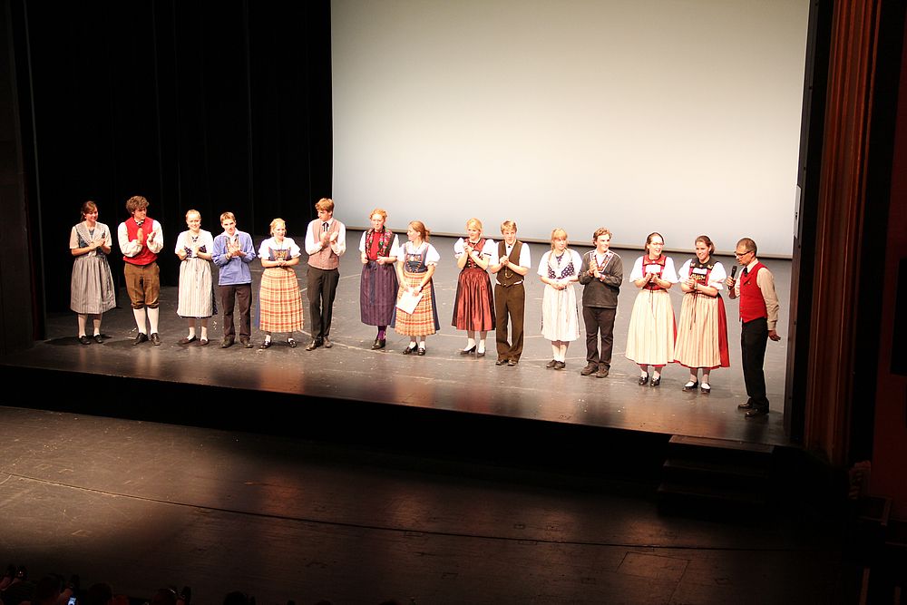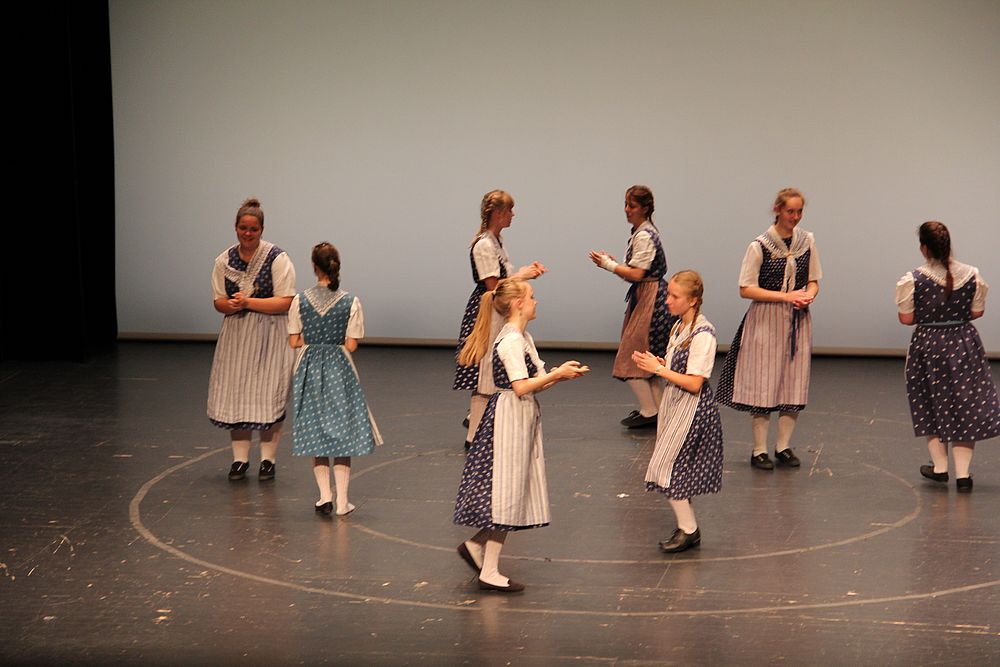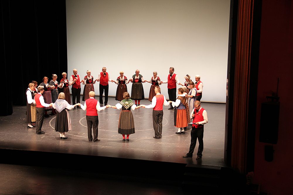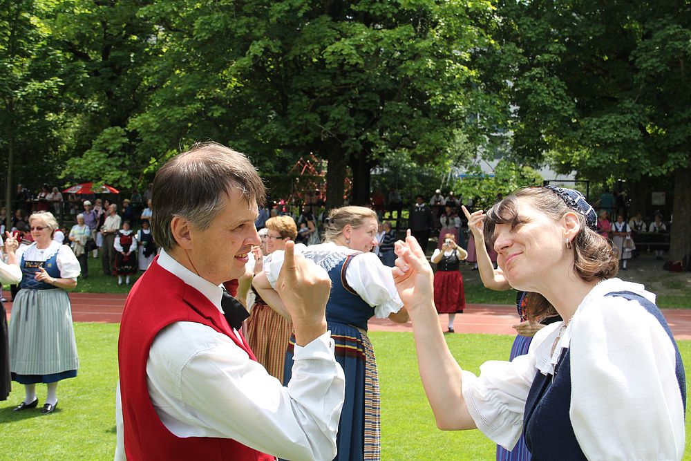 Um 13.30 Uhr begann das Volkstanzfest, sowohl auf der Quaderwiese wie auf dem Theaterplatz, jeweils mit einer Polonaise. Jene auf der Quaderwiese klappte ausgezeichnet, jene auf dem Theaterplatz litt unter Platzknappheit. Und dann folgten unzählige Blöcke an Volkstänzen und freiem Tanzen, zu den Klängen von 10 Musikkapellen. Parallel dazu fanden im Theater Tanzvorführungen statt. Vom Baselbiet wagten sich auf die Bühne, von insgesamt 26 vorführenden Gruppen, die Jugendgruppe Liestal - Stubete-Quadrille, en Änglische und Kalamajka (Böhmen); herrlich wie die Jugendlichen den Kalamajka-Schritt auf die Bühne legten und entsprechend das Ganze nach tosendem Applaus wiederholen durften -, die TG Muttenz - mit 2 Eigenchoreographien Zwanzig (20) und Nid lang gfacklet sowie als Abschluss der Letscht. Die Samstags-Vorführungen abgeschlossen hat der Volkstanzkreis Reinach mit 2 ausländischen Tänzen (Chestnut aus England und Fryksdalsdans aus Schweden), unterbrochen vom Summervogel mit seiner Mozart-Musik. Erwähnt sei auch die Gruppe Jestavo (Jungi Erwachseni tanzed Volkstänz), in welcher auch 3 Baselbieterinnen mitmachen. Alt und neu, traditionell und modern – was für Kombinationsmöglichkeiten es doch gibt!