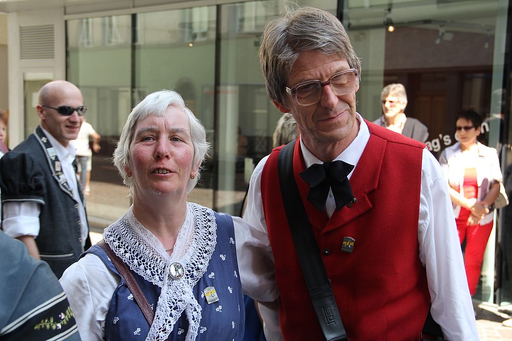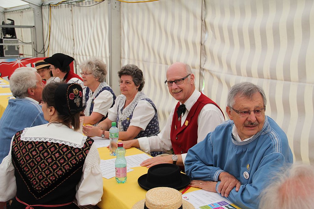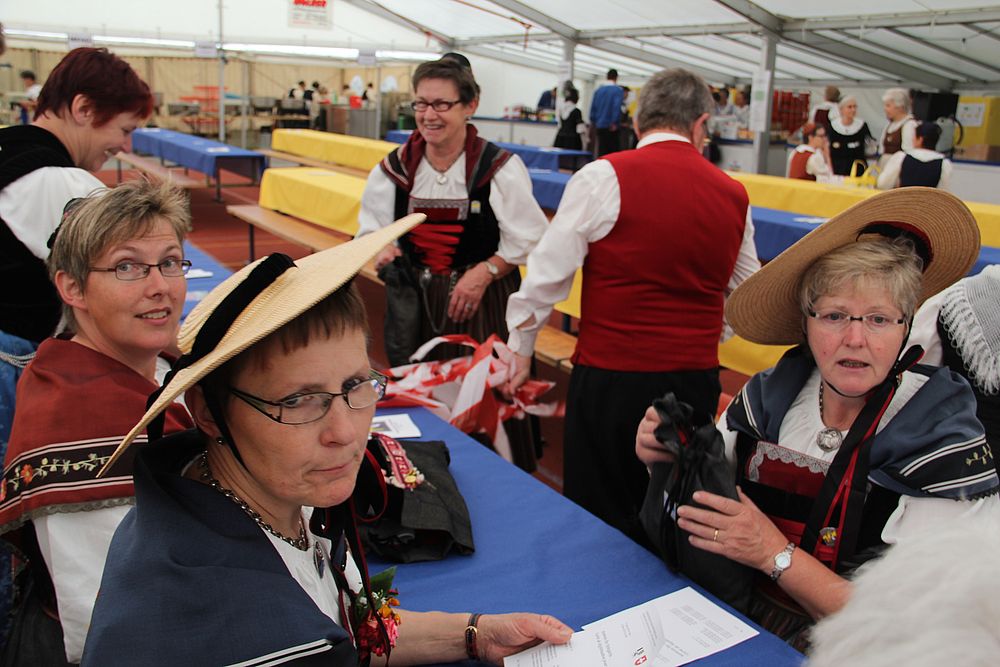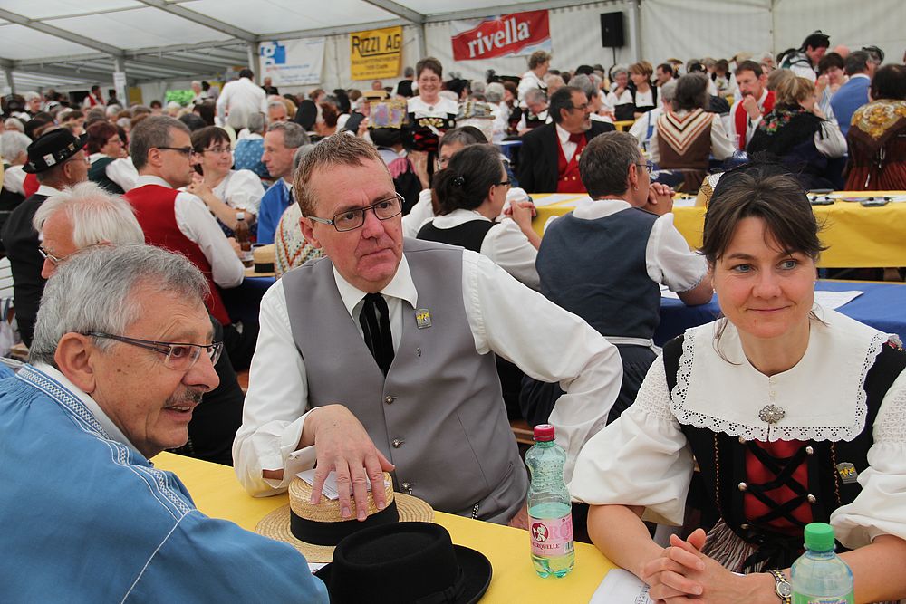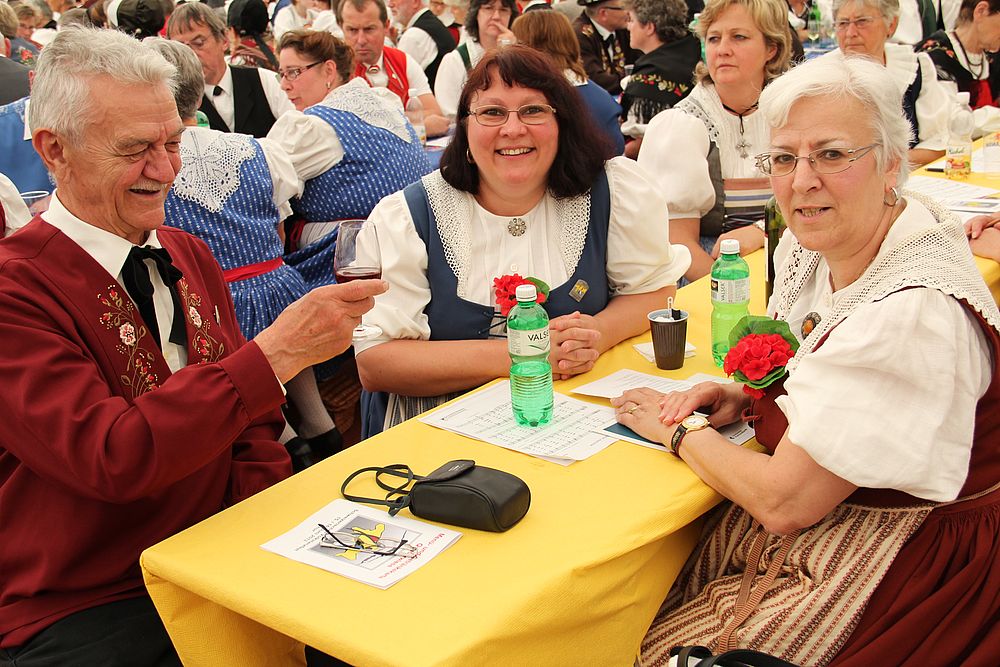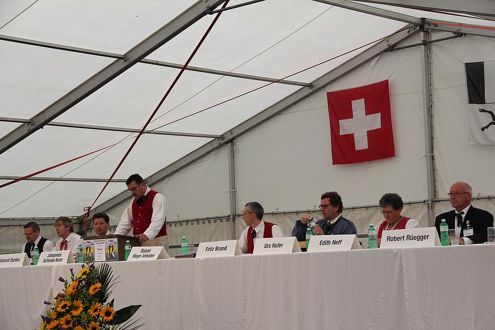 An der um 9.45 Uhr beginnenden Delegiertenversammlung im Festzelt auf der Quaderwiese waren auch Vertretungen zahlreicher Baselbieter Gruppen anwesend. So entdeckte der Schreibende Mitglieder der TG Sissach, der TG Waldenburgertal, der TG Liestal, der TG Muttenz, vom VTK Reinach und der TG Laufental. Roland Meyer-Imboden als Präsident der Schweiz. Trachtenvereinigung durfte als spezielle Gäste Regierungsrat Martin Jäger (Erziehung, Kultur und Umweltschutz) und Bundesrätin Eveline Widmer-Schlumpf begrüssen, beide in Tracht. Martin Jäger, aktiver Jodler, nahm die Buchstaben des Wortes „TRACHT“ unter die Lupe, und hielt fest: