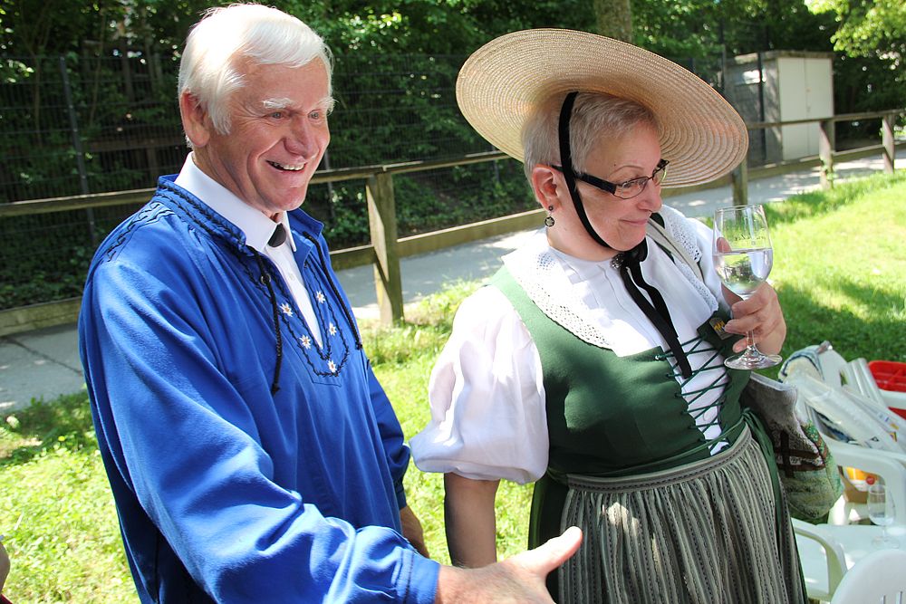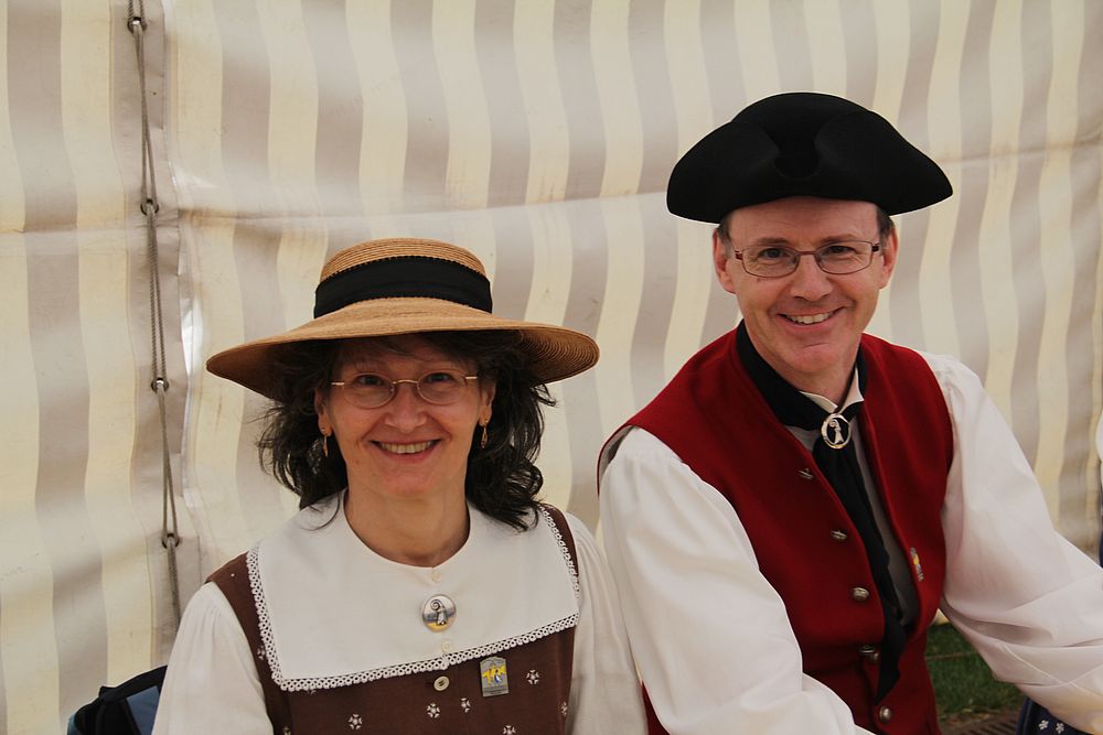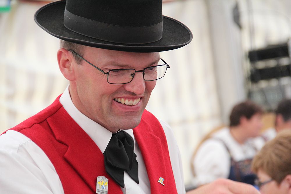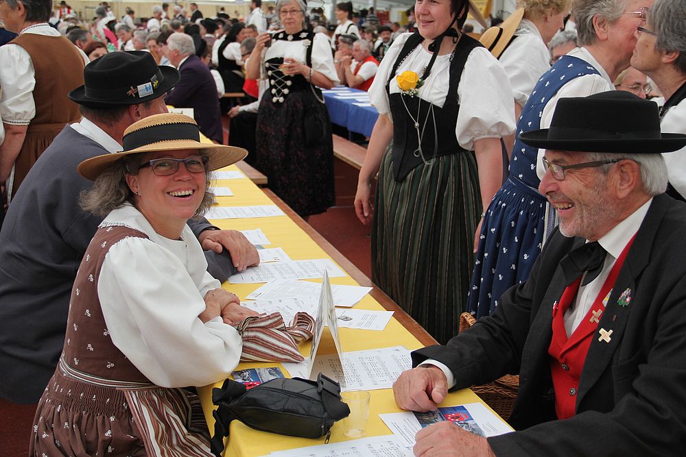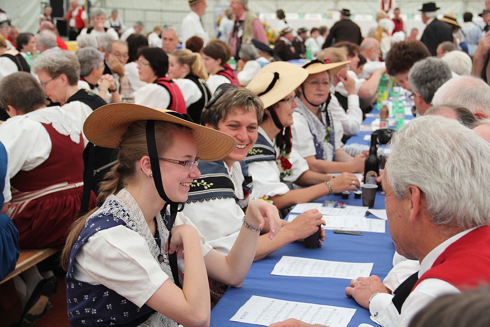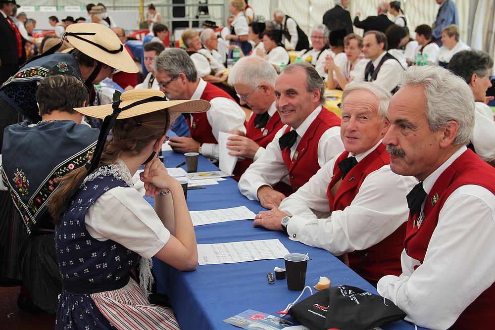 An der um 9.45 Uhr beginnenden Delegiertenversammlung im Festzelt auf der Quaderwiese waren auch Vertretungen zahlreicher Baselbieter Gruppen anwesend. So entdeckte der Schreibende Mitglieder der TG Sissach, der TG Waldenburgertal, der TG Liestal, der TG Muttenz, vom VTK Reinach und der TG Laufental. Roland Meyer-Imboden als Präsident der Schweiz. Trachtenvereinigung durfte als spezielle Gäste Regierungsrat Martin Jäger (Erziehung, Kultur und Umweltschutz) und Bundesrätin Eveline Widmer-Schlumpf begrüssen, beide in Tracht. Martin Jäger, aktiver Jodler, nahm die Buchstaben des Wortes „TRACHT“ unter die Lupe, und hielt fest: