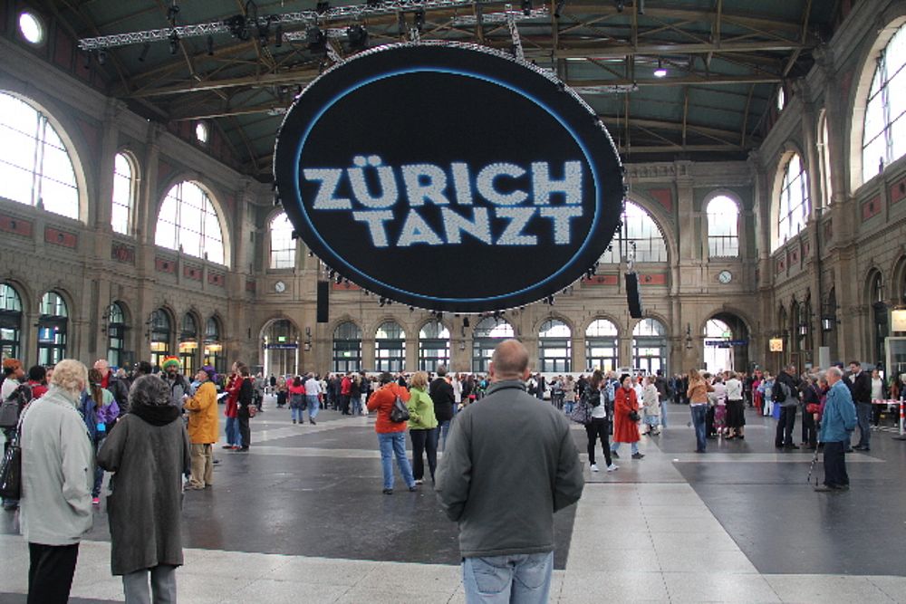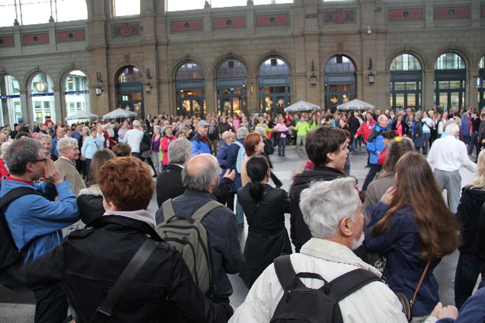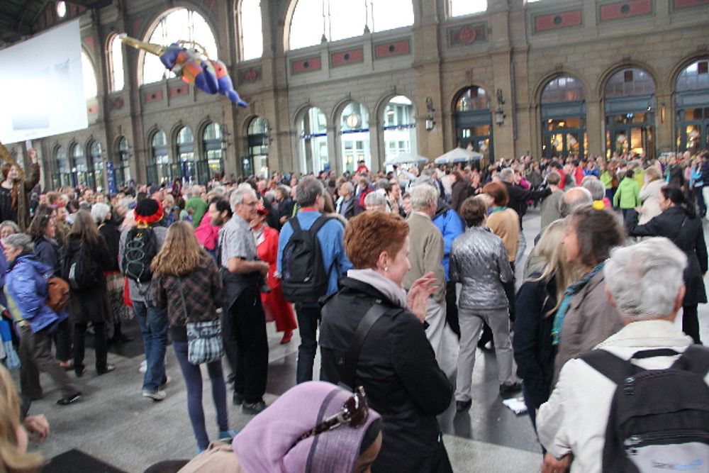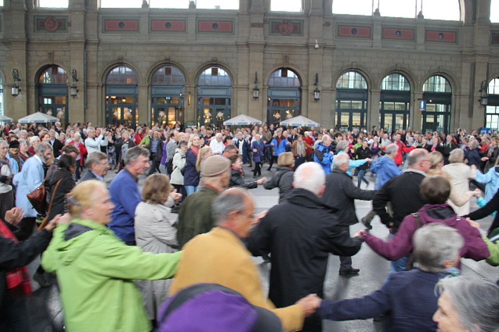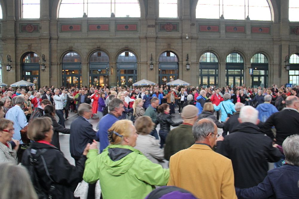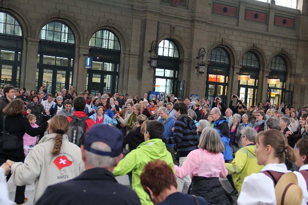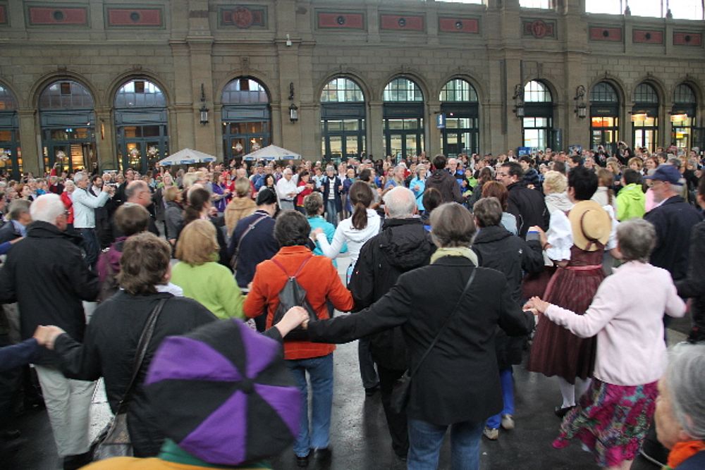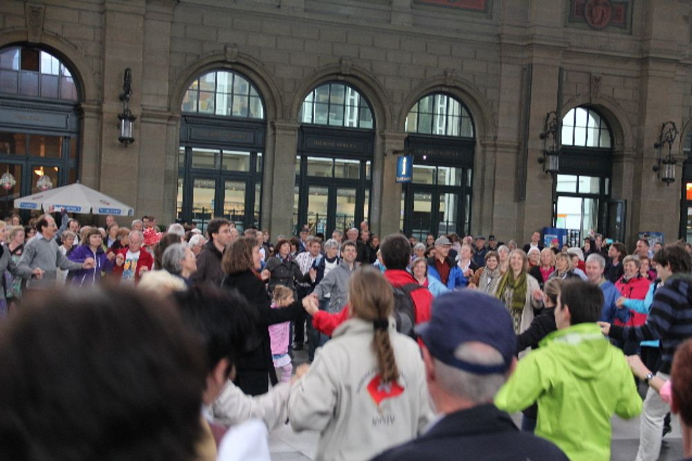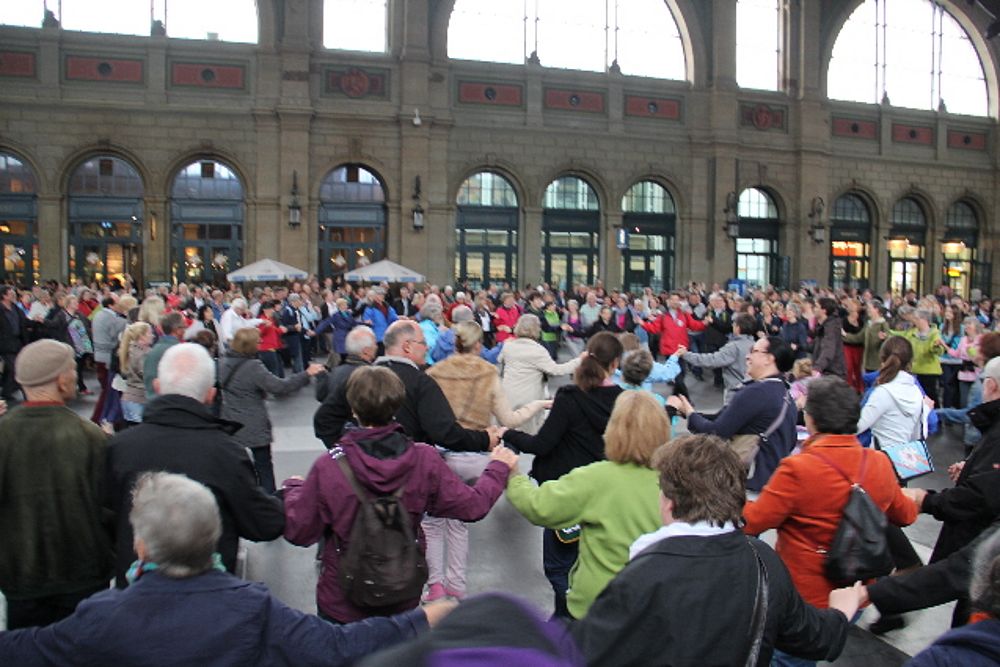 us Anlass seines 75-jährigen Bestehens organisierte der Volkstanzkreis Zürich im Rahmen von „Zürich tanzt 2013“ (3.-5. Mai) einen Flashmob zum Tanz Maitlischottisch von Annelis Aenis. Beginn war um 18 Uhr mitten in der Rush Hour in der grossen Bahnhofshalle.
