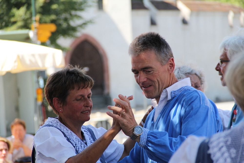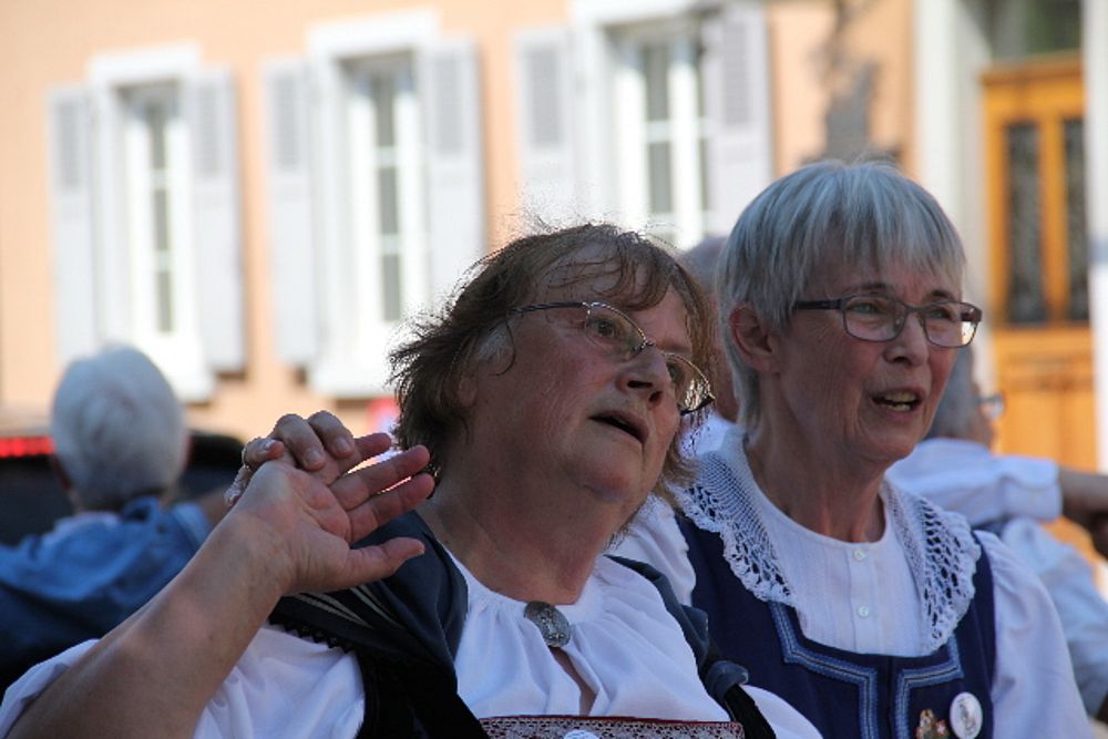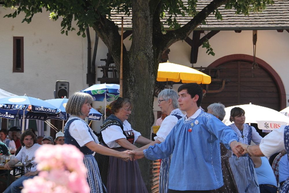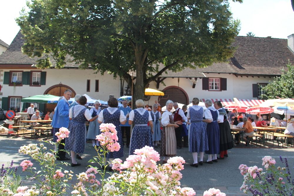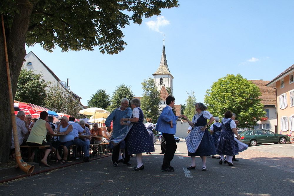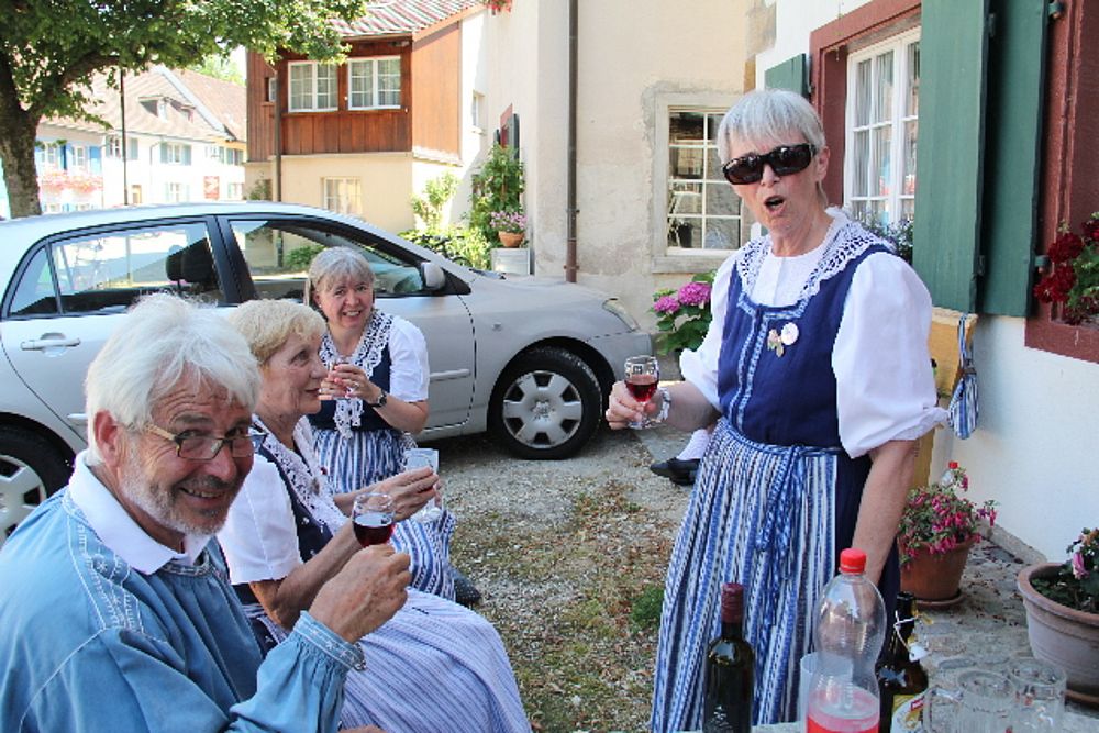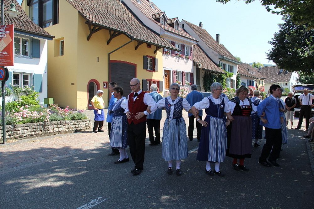 Mit dabei waren auch 8 Tanzpaare der TG Muttenz. Da die Ländlerkapelle Wartebärg, unsere „Hausmusik“, ebenfalls unter den mitmachenden Formationen war, konnten wir unsere 2 Dreier-Tanzblöcke zu Livemusik vorführen. Entsprechend dem Wetter - prächtiger Sonnenschein und rund 30 Grad im Schatten – wählten wir mehrheitlich etwas gemütlichere Tänze: Melodypolka, La fine goutte de Dézaley und Rägeschottisch zuerst, und rund eine Stunde später Achtung fertig los, Hobbysenn und … Krawall im Stall. Trotz Probepause im Sommer gelangen die Auftritte und wir genossen den Applaus. Nass und durchgeschwitzt waren wir alle, aber die Getränke und Leckereien vom Buffet, das gemütliche Zusammensitzen im Schatten wie auch das Geniessen der Vorträge der andern Formationen liessen uns langsam wieder trocknen. Den Abschluss des Programms machte der Jodlerklub Muttenz mit dem „Steimandli-Jutz“ von André Moos. Schon beim Anstimmen merkten zahlreiche Besucher was nun folgt und jubelten…