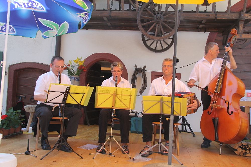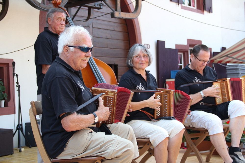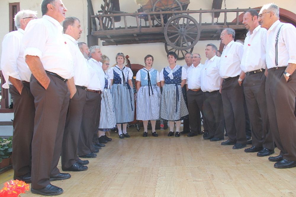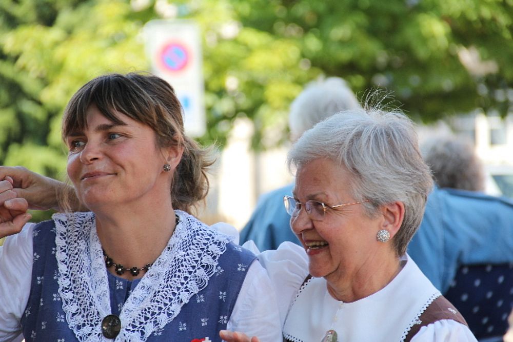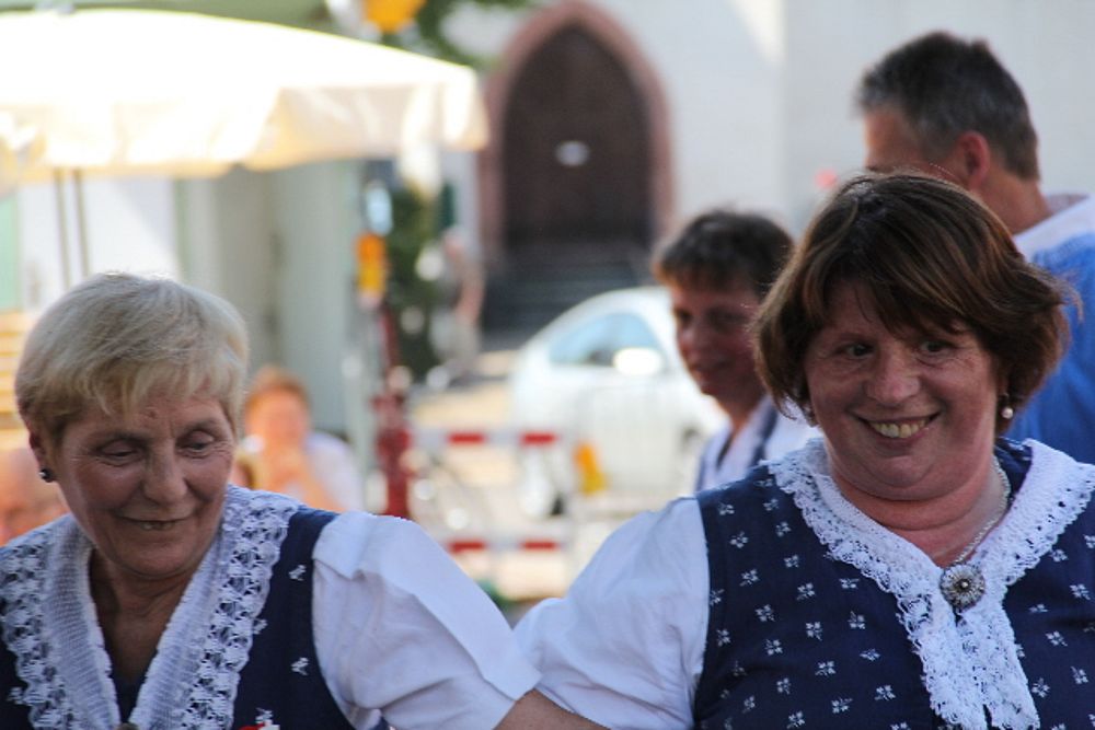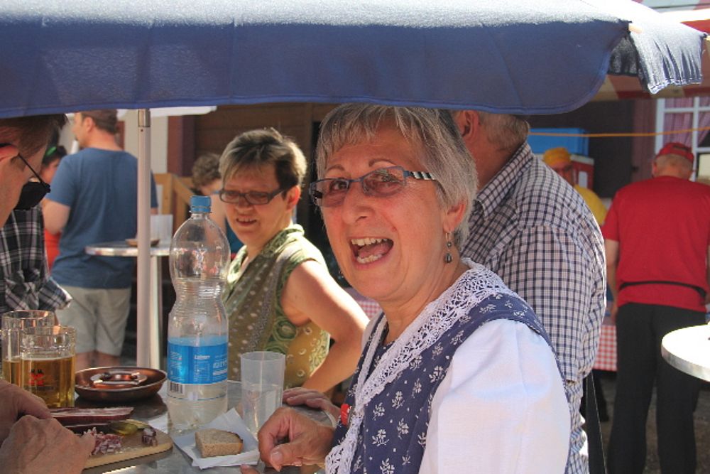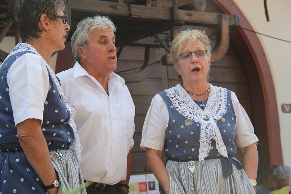 Mit dabei waren auch 8 Tanzpaare der TG Muttenz. Da die Ländlerkapelle Wartebärg, unsere „Hausmusik“, ebenfalls unter den mitmachenden Formationen war, konnten wir unsere 2 Dreier-Tanzblöcke zu Livemusik vorführen. Entsprechend dem Wetter - prächtiger Sonnenschein und rund 30 Grad im Schatten – wählten wir mehrheitlich etwas gemütlichere Tänze: Melodypolka, La fine goutte de Dézaley und Rägeschottisch zuerst, und rund eine Stunde später Achtung fertig los, Hobbysenn und … Krawall im Stall. Trotz Probepause im Sommer gelangen die Auftritte und wir genossen den Applaus. Nass und durchgeschwitzt waren wir alle, aber die Getränke und Leckereien vom Buffet, das gemütliche Zusammensitzen im Schatten wie auch das Geniessen der Vorträge der andern Formationen liessen uns langsam wieder trocknen. Den Abschluss des Programms machte der Jodlerklub Muttenz mit dem „Steimandli-Jutz“ von André Moos. Schon beim Anstimmen merkten zahlreiche Besucher was nun folgt und jubelten…