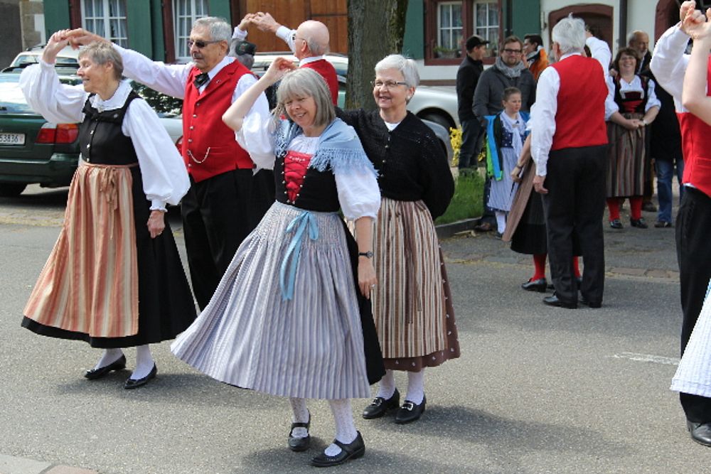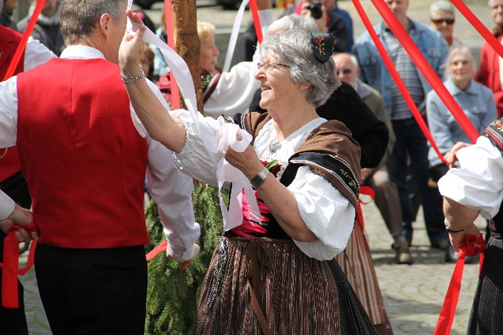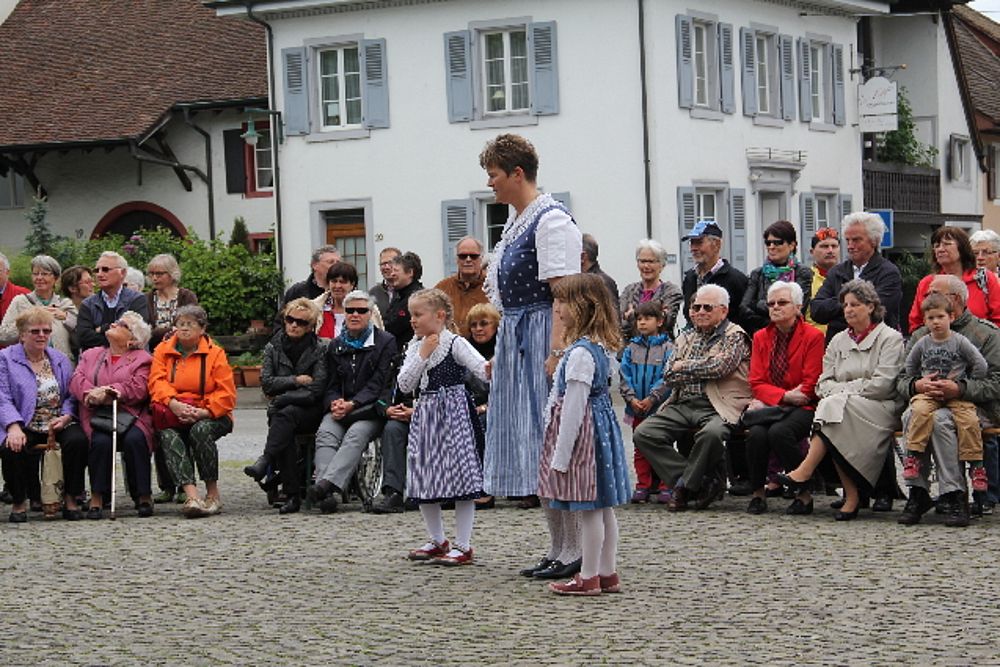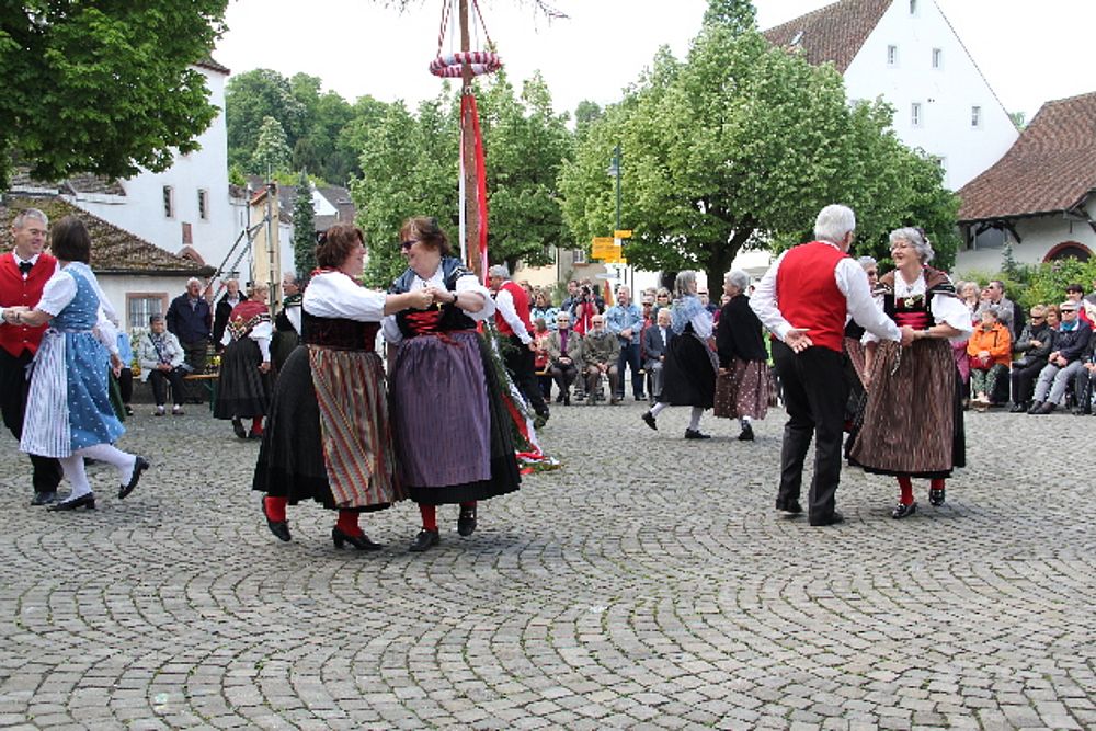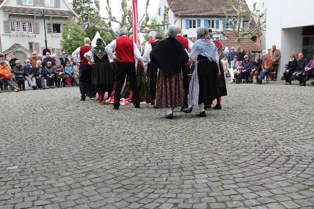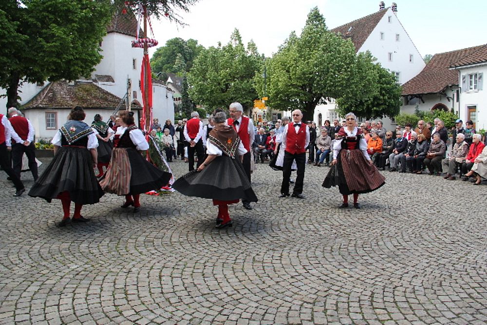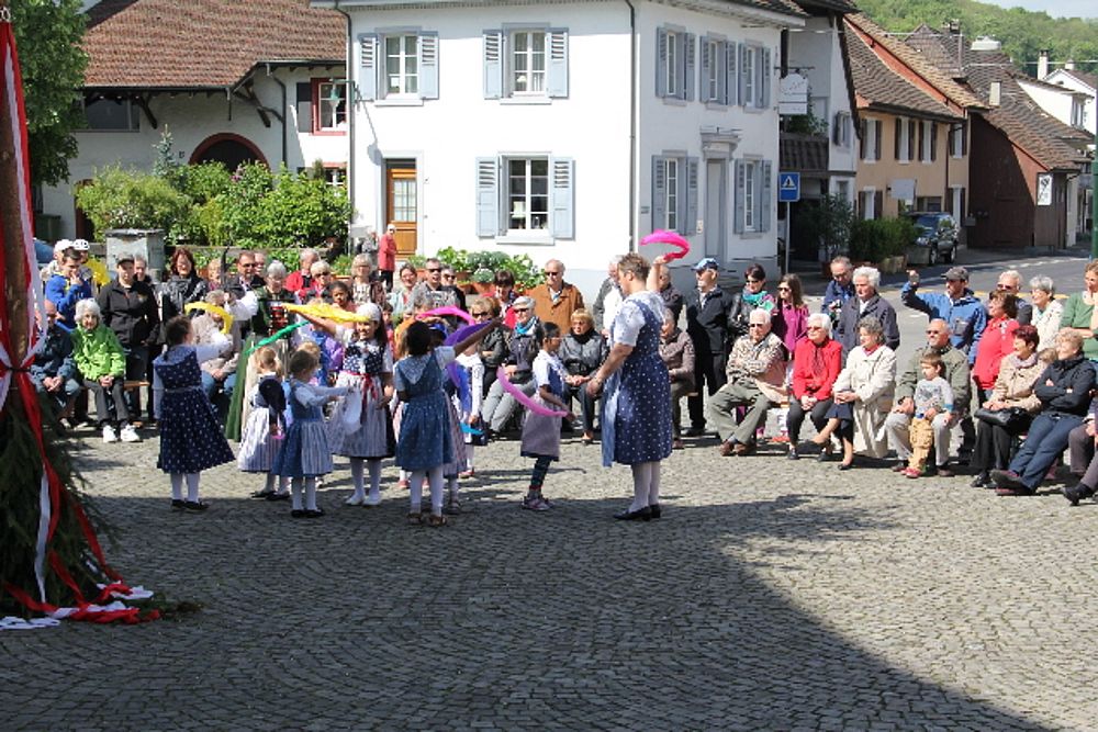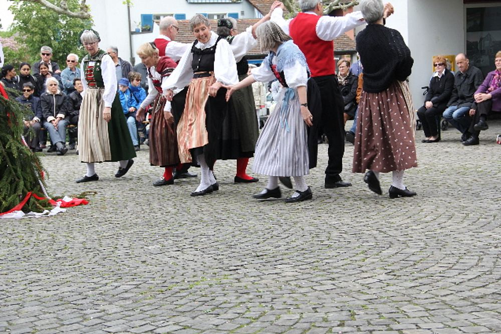 «Uf de Bsetzisteine z Murte» hiess der Tanz, bei dem sich die Paare der Trachtengruppe unter Leitung von Andrea Weber um den Maibaum drehten. «Wir wollen zeigen, dass man auch auf den Dorfplatzsteinen in Muttenz ohne zu stolpern tanzen kann», teilte Samuel Benz mit. Anspruchsvoll für die Tanzpaare war die Vorführung «La marche des Bûcherons». Dieser Volkstanz beginnt im Kreis und kommt wegen der speziellen Choreographie beim Publikum gut an. Gesungen wurde wieder beim Kindertanz «s Rössli Sina». Herrlich, wie die Kinder mit ihren Steckenpferden herumhüpften.