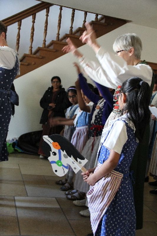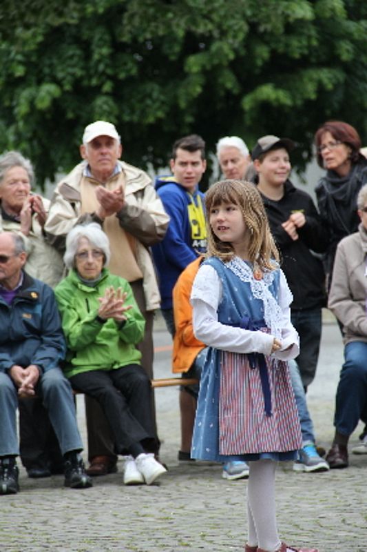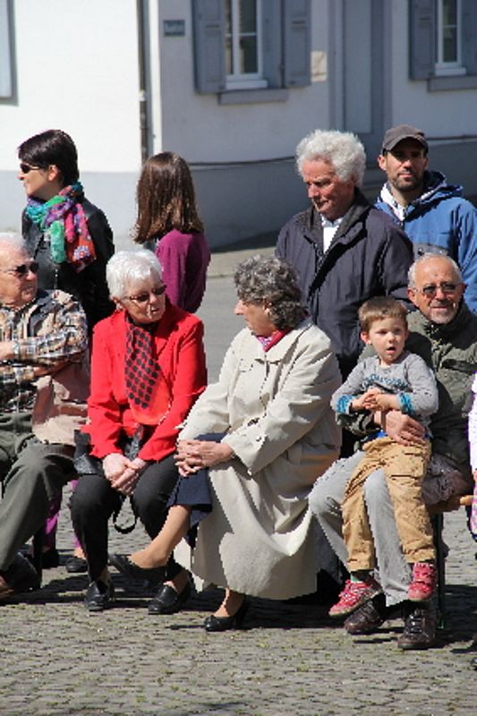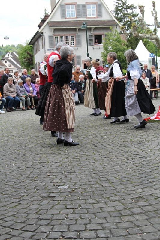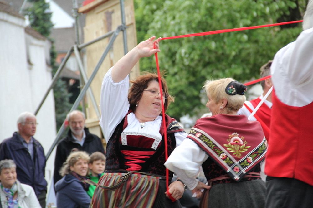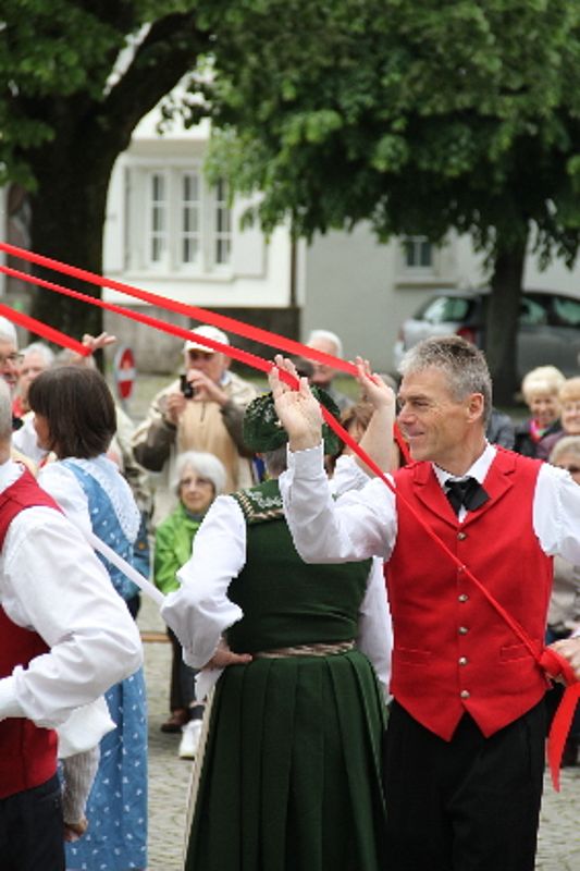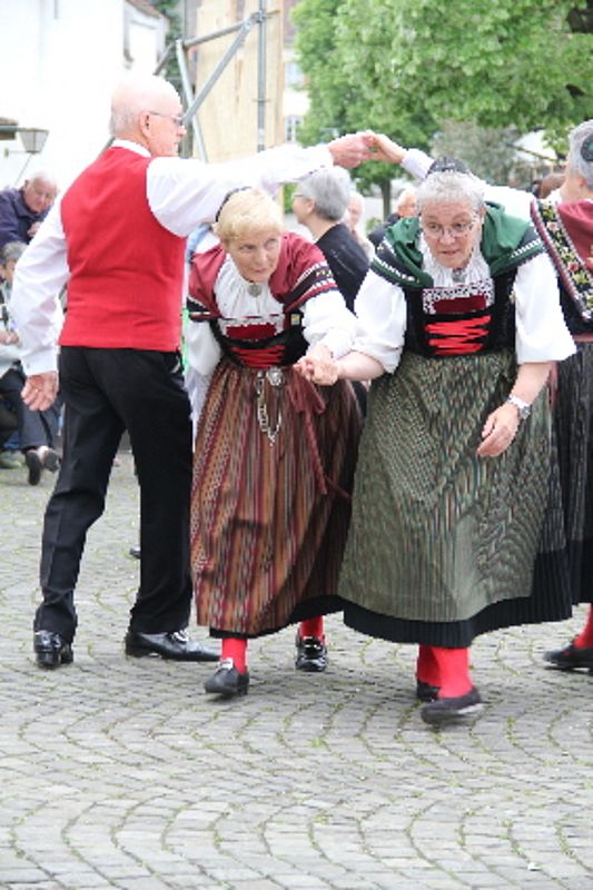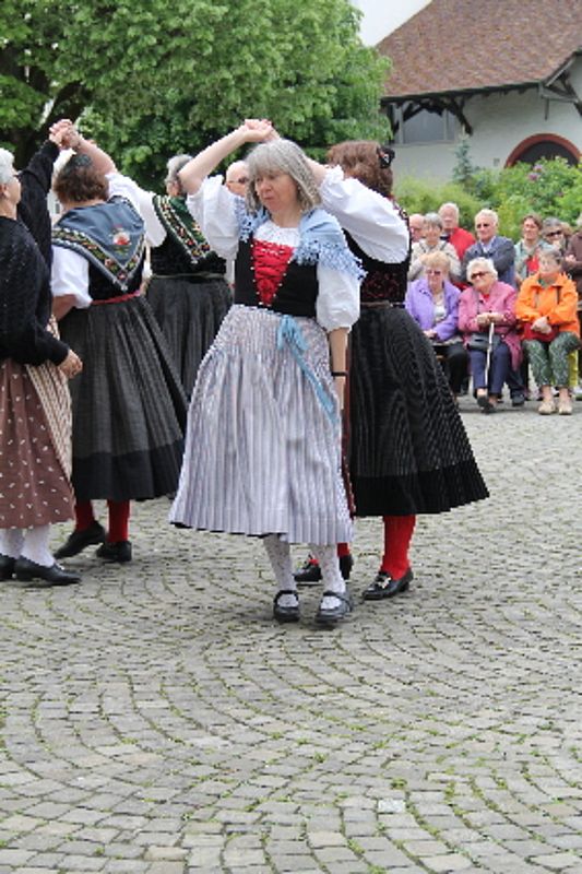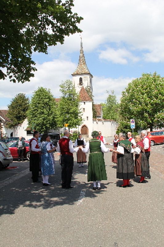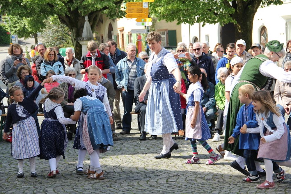 «Uf de Bsetzisteine z Murte» hiess der Tanz, bei dem sich die Paare der Trachtengruppe unter Leitung von Andrea Weber um den Maibaum drehten. «Wir wollen zeigen, dass man auch auf den Dorfplatzsteinen in Muttenz ohne zu stolpern tanzen kann», teilte Samuel Benz mit. Anspruchsvoll für die Tanzpaare war die Vorführung «La marche des Bûcherons». Dieser Volkstanz beginnt im Kreis und kommt wegen der speziellen Choreographie beim Publikum gut an. Gesungen wurde wieder beim Kindertanz «s Rössli Sina». Herrlich, wie die Kinder mit ihren Steckenpferden herumhüpften.