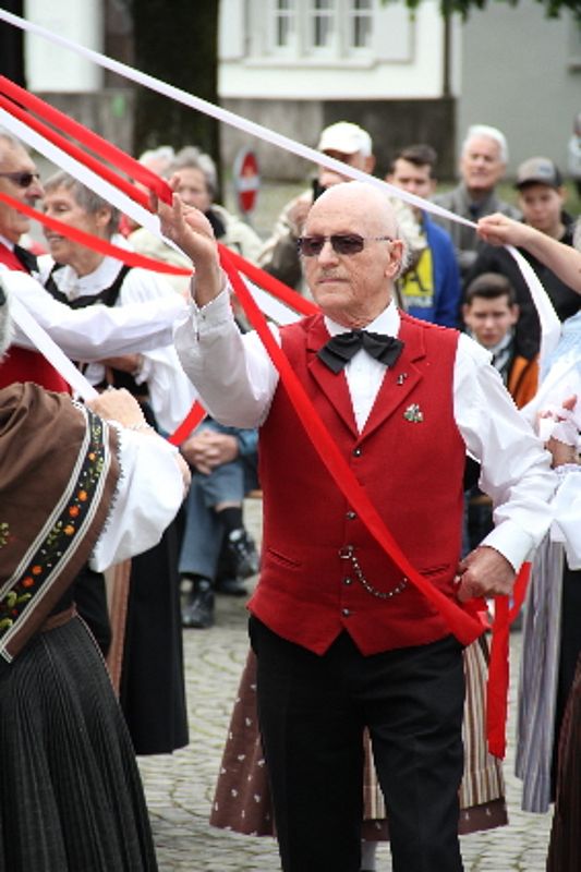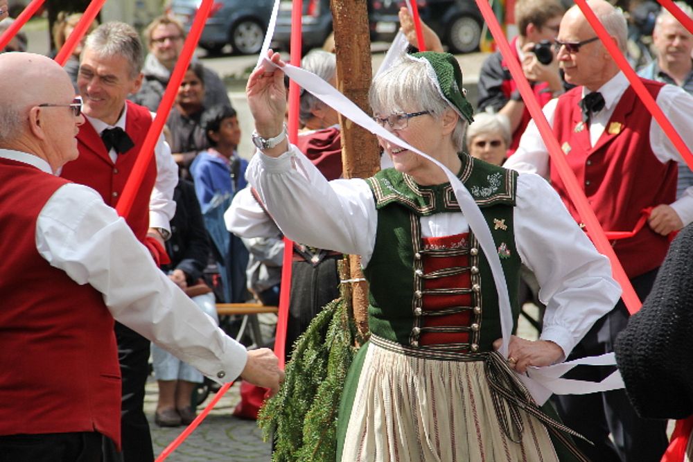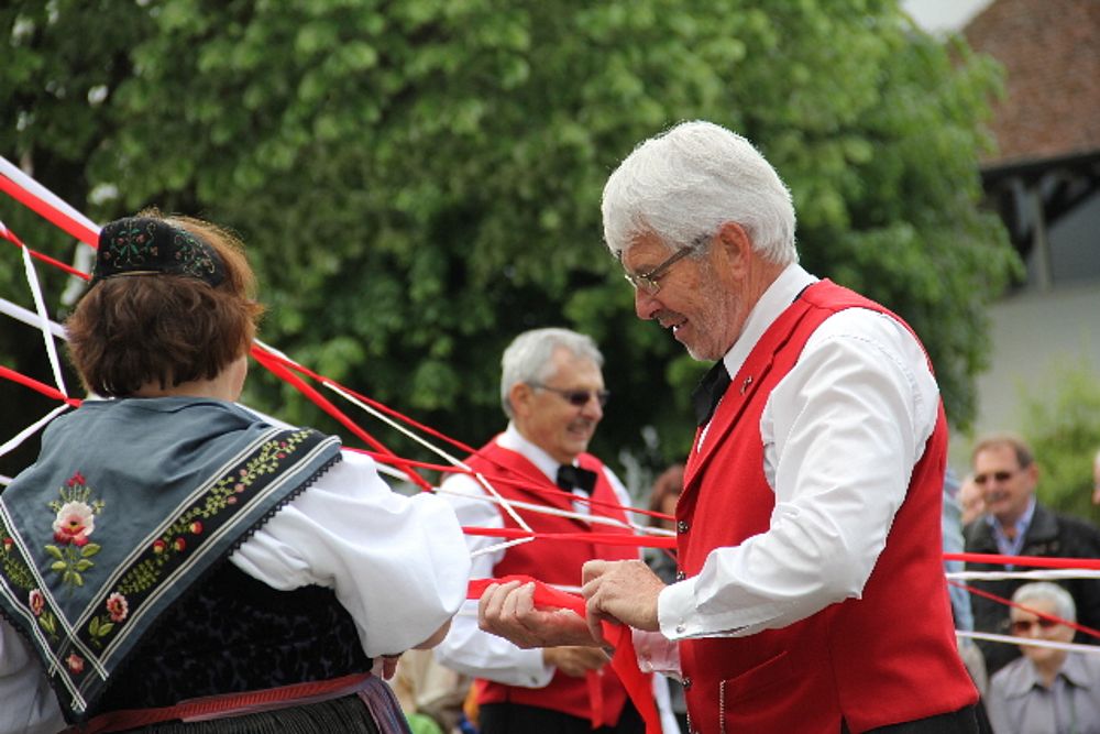 Das Finale der Veranstaltung ist der Bändeltanz. Da steht der Maibaum mit den an einer Krone befestigten rot-weissen Bändeln im Zentrum der Tänzerinnen und Tänzer. Mit sichtlicher Freude an der Sache wurde der Baumstamm tänzerisch mit einem schönen Geflecht «eingepackt». Das Publikum honorierte den kunstvollen Effort sowie den Einsatz aller mit einem herzlichen Applaus. Beim Bändeltanz kamen noch einmal wohltuende Heimatgefühle auf.