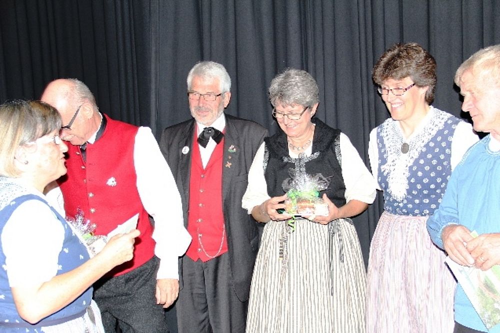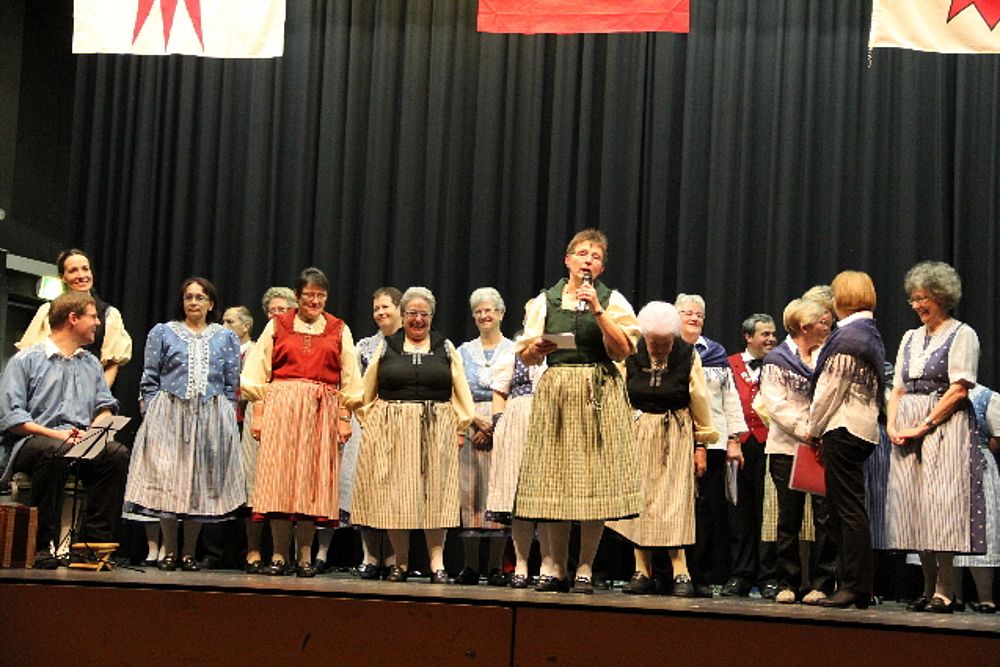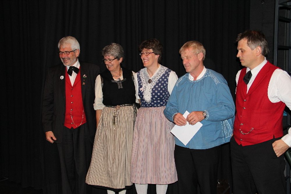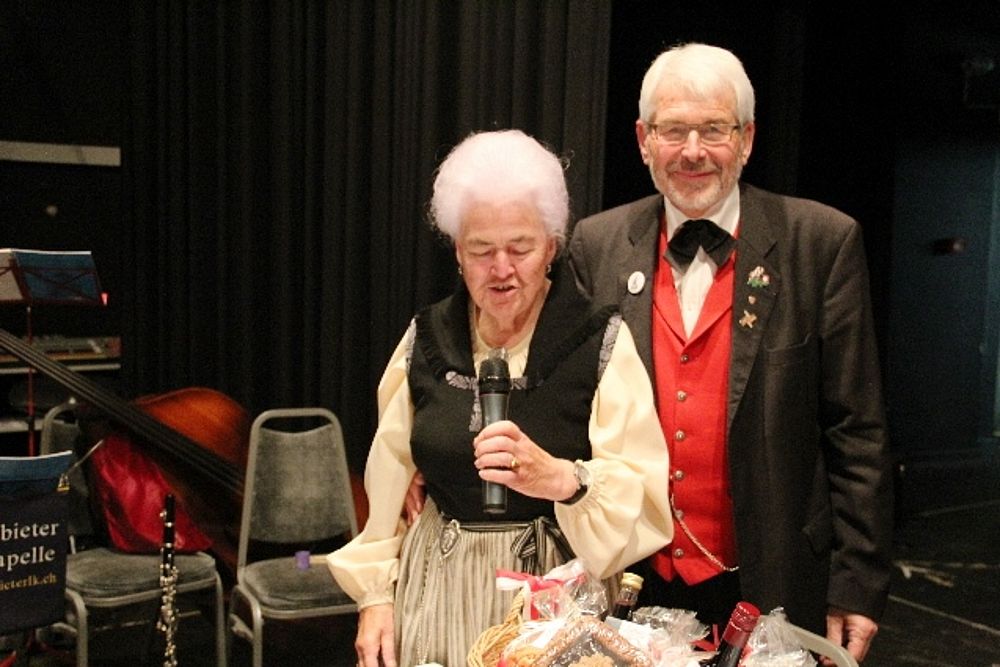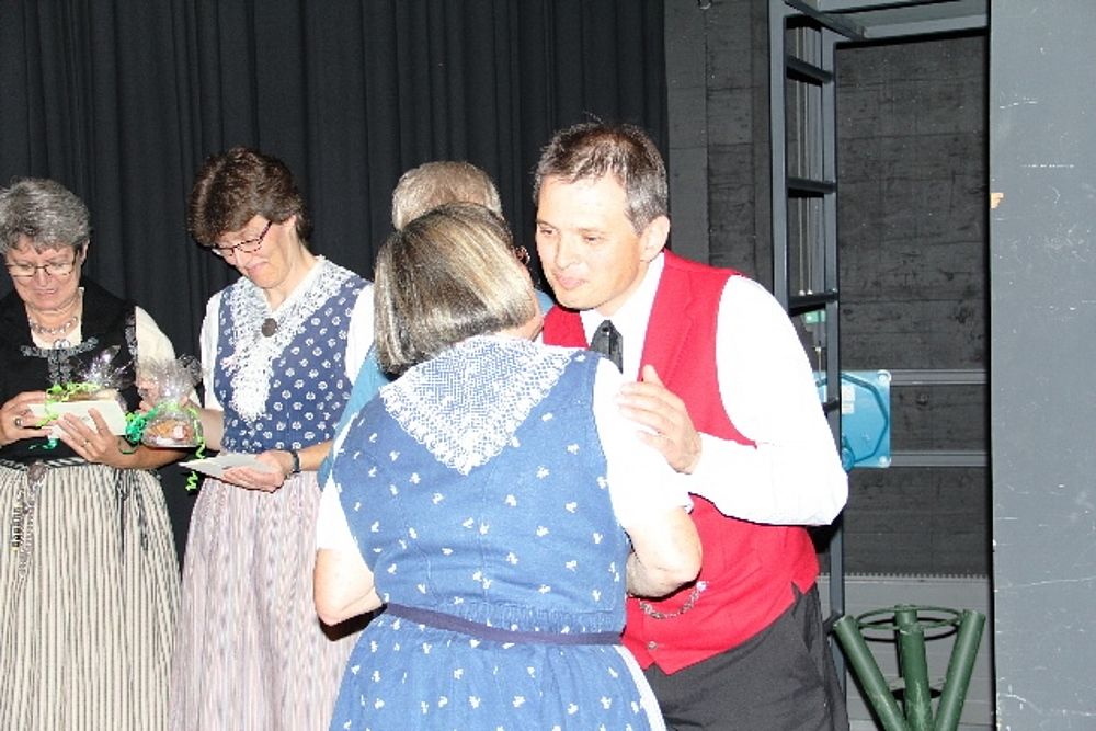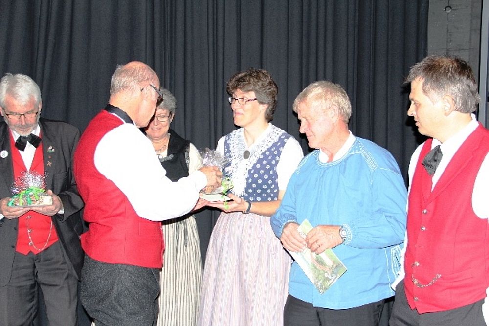 Der Rückblick auf das 75-Jahr Jubiläum auf der Sichtern vom 31. August widerspiegelte viel Positives, aber auch unser Pech: Eine super Organisation durch das OK und viel freiwillige Mithilfe beim Auf- und Abbau im Sonnenschein und ein total „verschiffter“ Nachmittag am Jubiläumstag. Schade vor allem, dass die Kinder ihren Höhepunkt – 2 Tänze (Häxetanz/Chatzewadel-Polka und Dr Seppel) zusammen mit den Erwachsenen mit je unterschiedlichen Choreographien nicht vorführen konnten. Ganz speziell dankte Sämi Benz Peter Breu. Was Peter an Arbeit leistete, ist kaum in Worte zu fassen, ebenso wenig seine Grosszügigkeit. Mit einem speziellen Geschenk würdigte Sämi Peters Einsatz. Seitens der Baselbieter Trachtenleute überreichten Marianne Hauswirth und Ruedy Weber jedem OK-Mitglied ein „Messpäckli“; für den verhinderten OK-Präsidenten Hanspeter Misteli sprang seine Frau Hanni ein.