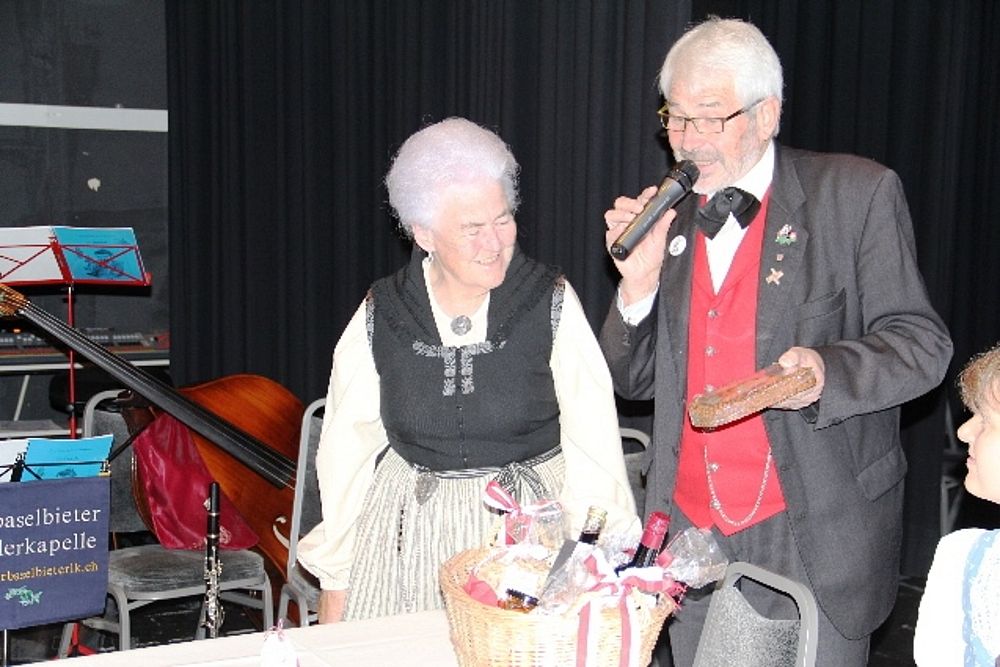 Ein weiteres Jubiläum sprach Sämi Benz unter dem Traktandum Ehrungen an – 50 Jahre Trachtenkommission. Und eine Person war von Anfang an bis heute aktiv mit dabei: Annarös Schell. Die Ehrenmitgliedschaft besitzt sie schon lange, also wie soll dieses Jubiläum gewürdigt werden? Die Antwort fand sich in einem grossen Korb mit lauter Baselbieter Leckereien, gekrönt von einer Linzertorte mit Baselbieterstab.