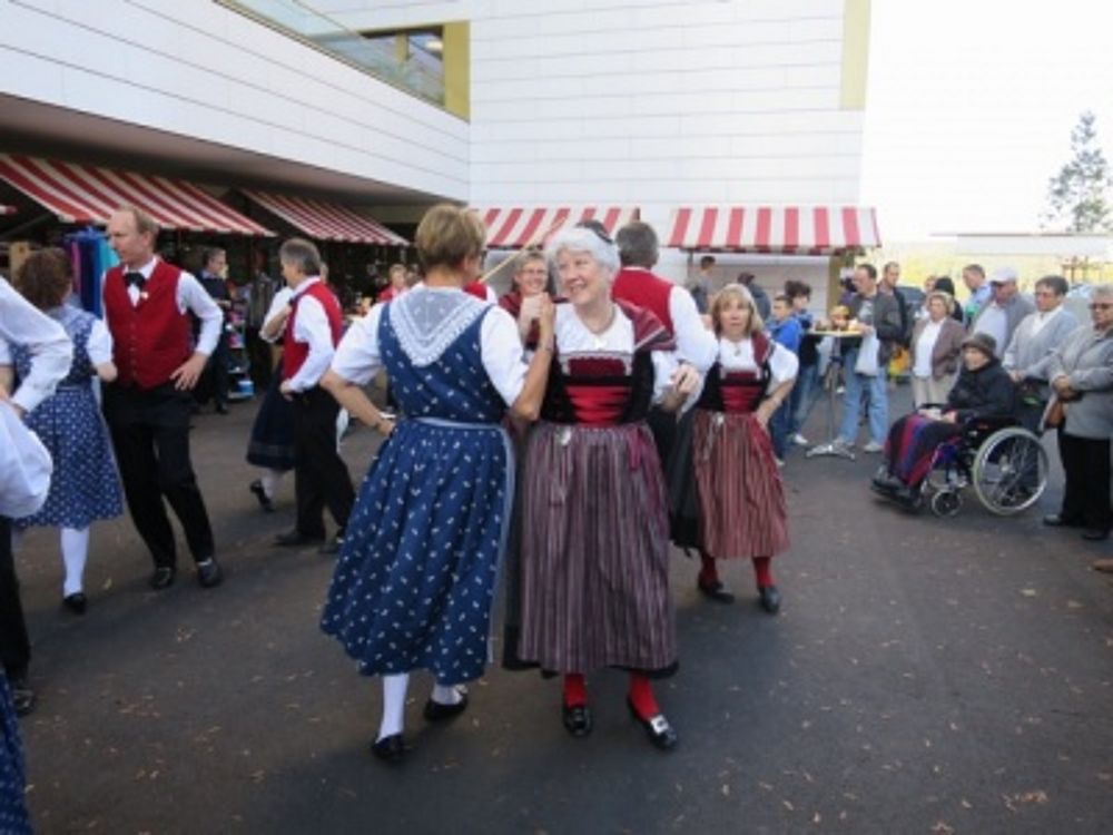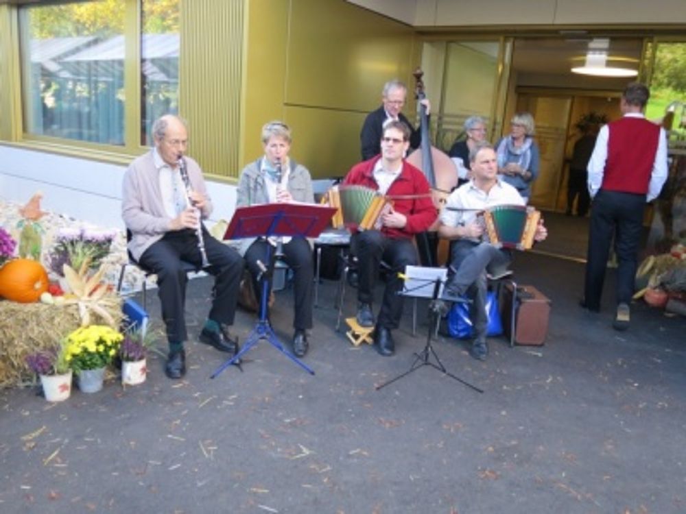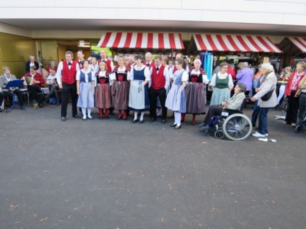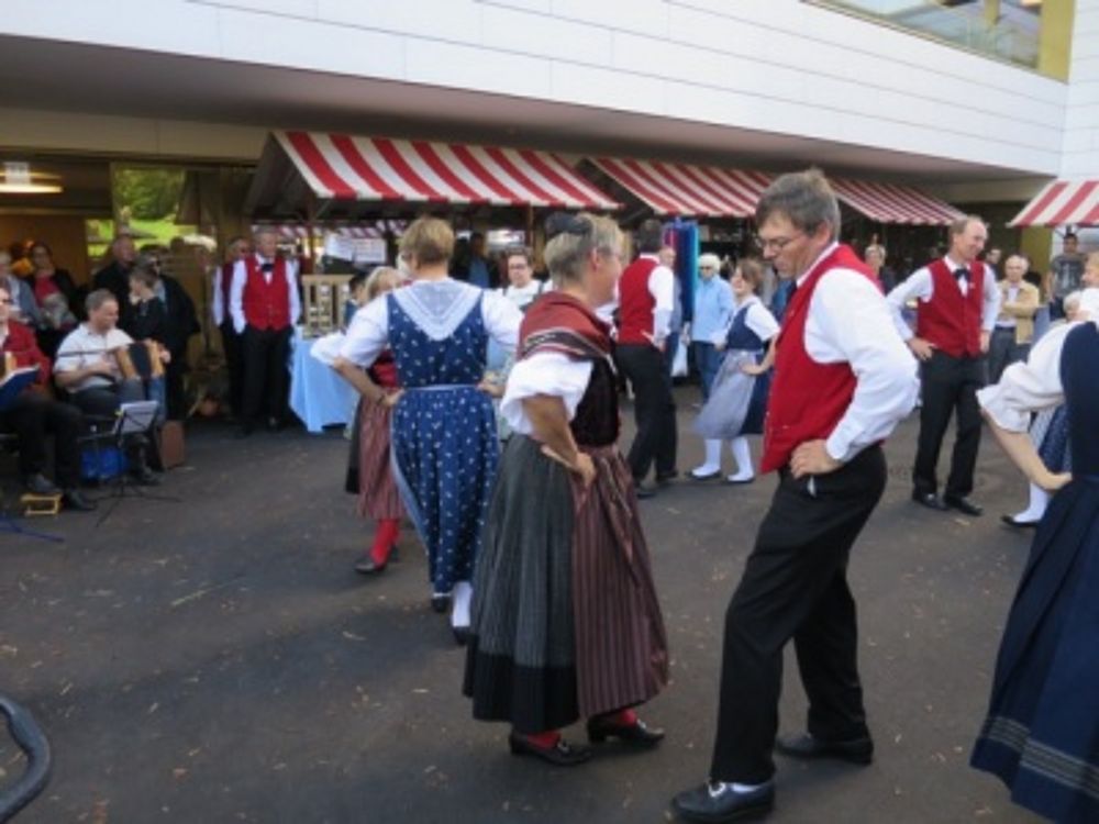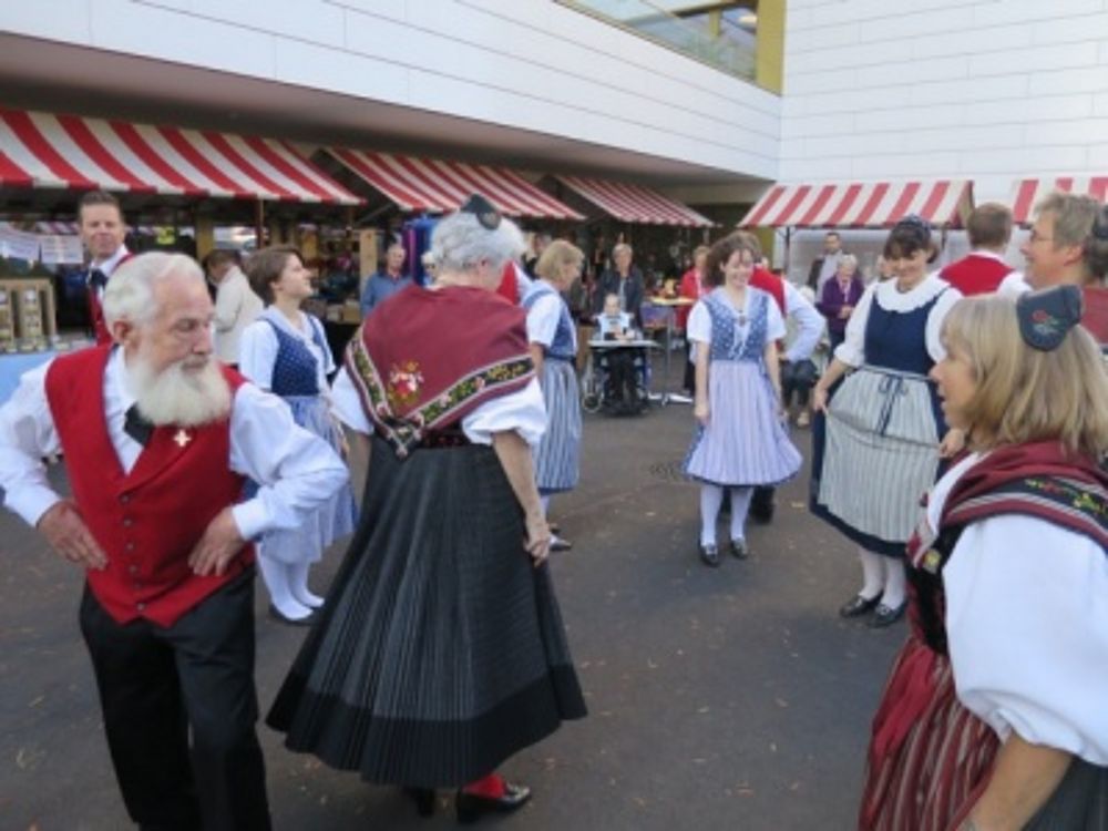 | Wie in den vergangenen Jahren auf Allerheiligen hat die Trachtengruppe Waldenburgertal das Markttreiben mit zwei Auftritten, auf dem "Marktplatz" und auf der Terrasse, mit Singen und Tanzen ergänzt. Die Oedenburger Holzmusik begleitete die Tänze. Zur Einleitung stimmte sie mit fröhlichen Stücken das Publikum auf die Darbietungen ein. Ein Querschnitt durch altbekannte Tänze wie "dr Seppl", "s'Bölchegschpängscht" sowie Lieder "Mues juchzge", "Am Morge" und "Dr Alltag", um nur einige zu nennen, fanden bei den zahlreichen Besucherinnen und Besuchern gute Aufnahme. Mit dem gemeinsam gesungenen Baselbieter-Lied schloss das Programm. Einige Anwesende benutzten auch die Gelegenheit, das neue Haus, das im August 2014 eröffnet wurde, zu besichtigen. |