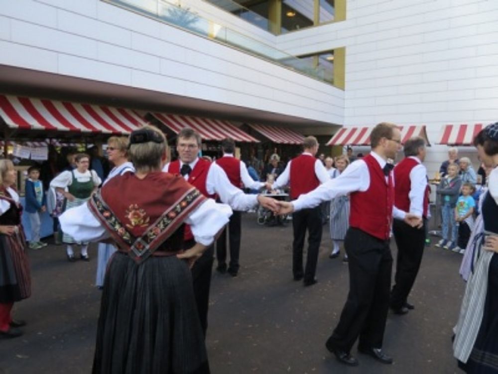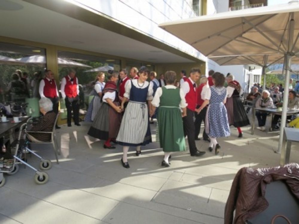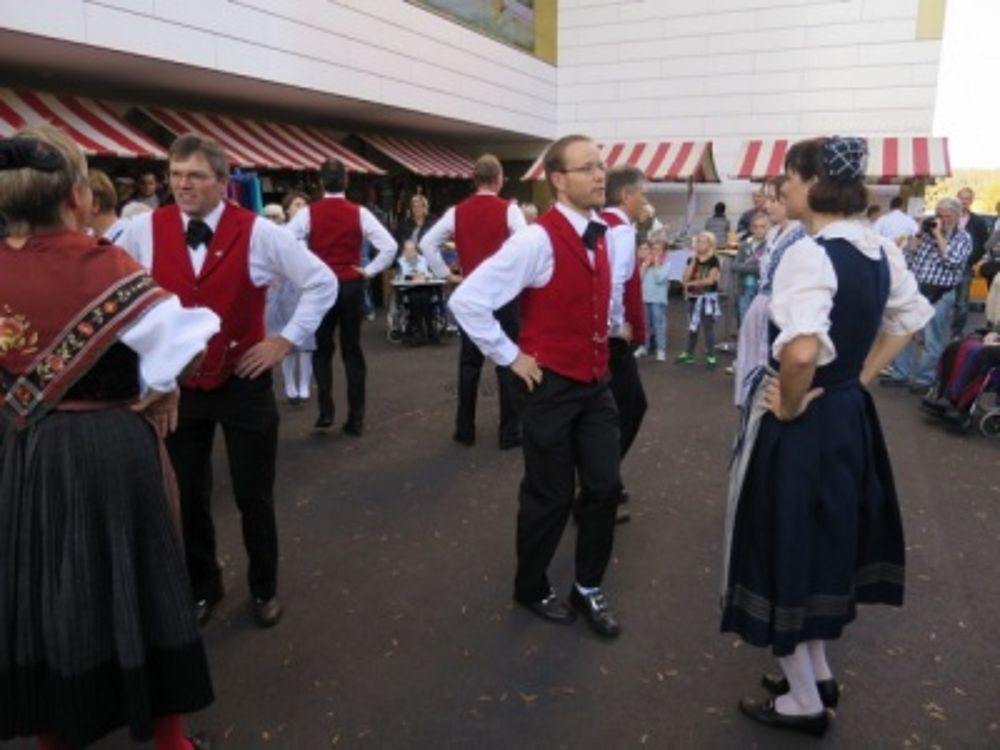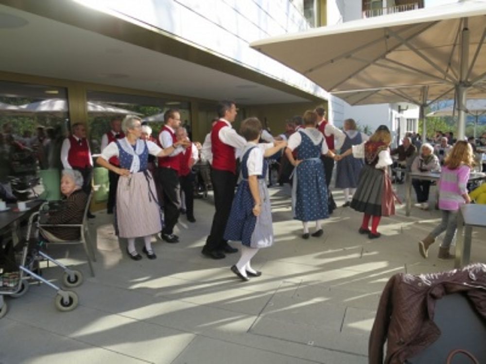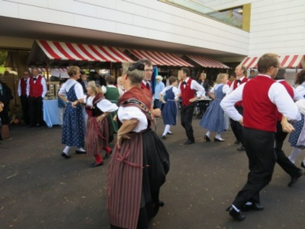 | Wie in den vergangenen Jahren auf Allerheiligen hat die Trachtengruppe Waldenburgertal das Markttreiben mit zwei Auftritten, auf dem "Marktplatz" und auf der Terrasse, mit Singen und Tanzen ergänzt. Die Oedenburger Holzmusik begleitete die Tänze. Zur Einleitung stimmte sie mit fröhlichen Stücken das Publikum auf die Darbietungen ein. Ein Querschnitt durch altbekannte Tänze wie "dr Seppl", "s'Bölchegschpängscht" sowie Lieder "Mues juchzge", "Am Morge" und "Dr Alltag", um nur einige zu nennen, fanden bei den zahlreichen Besucherinnen und Besuchern gute Aufnahme. Mit dem gemeinsam gesungenen Baselbieter-Lied schloss das Programm. Einige Anwesende benutzten auch die Gelegenheit, das neue Haus, das im August 2014 eröffnet wurde, zu besichtigen. |