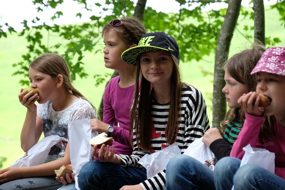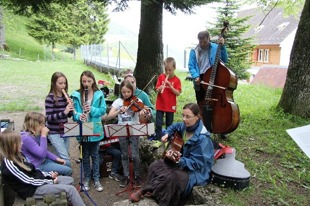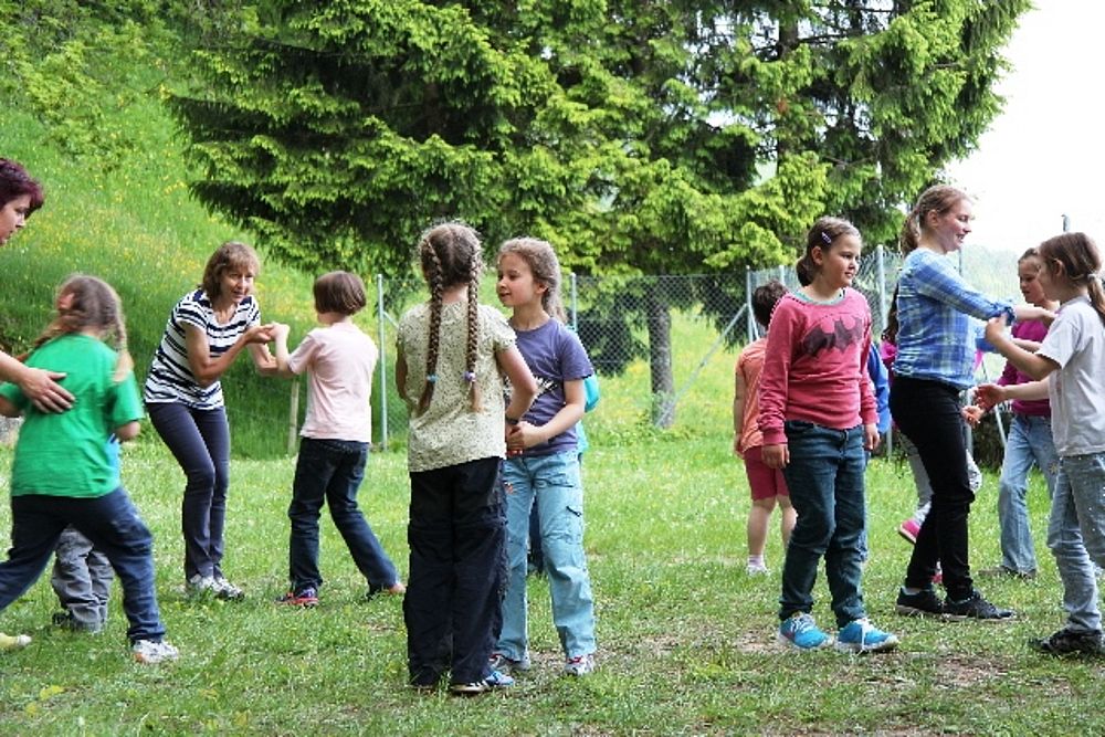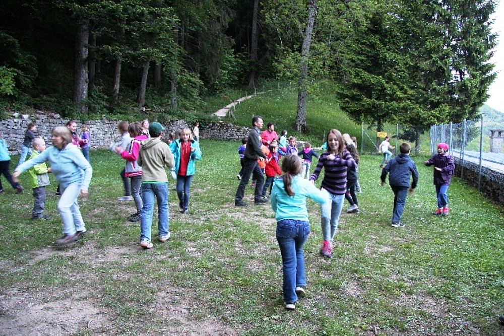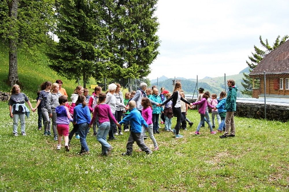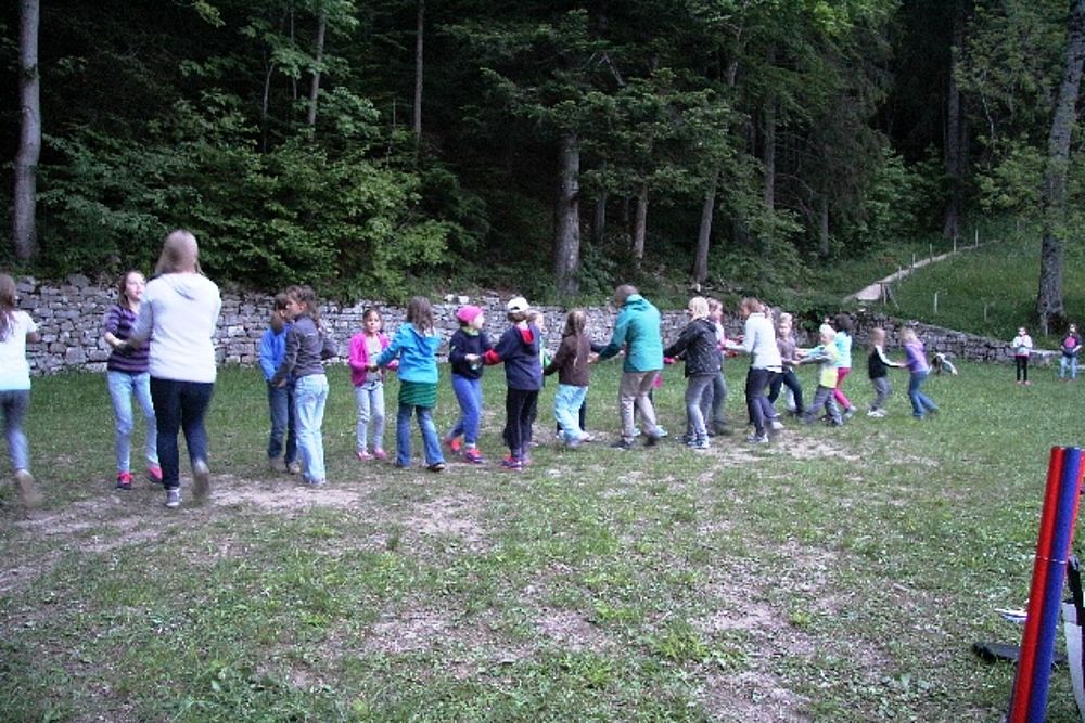 An einem lauschigen Waldplätzchen genossen alle ihr Picknick und freuten sich über den leichter gewordenen Rucksack. Am Ziel angelangt fanden alle ohne grosse Diskussionen in einem der vorbereiteten Zimmer eine Schlafgelegenheit im Kreise ihrer Tanzfreunde und -freundinnen. Nach dem Beziehen der Zimmer waren alle für eine erste Tanzrunde bereit. Die Polonaise auf der Spielwiese mit Live-Musik durch Örgeli und Bass war eine unbeschwerte Eröffnung unserer gemeinsamen Wochenendstunden. In zwei Altersgruppen mit 18 sieben bis neun jährigen Kindern und 17 Jugendlichen im Alter von zehn bis siebzehn Jahren tanzten wir draussen auf zwei Plätzen weiter in den Nachmittag hinein.