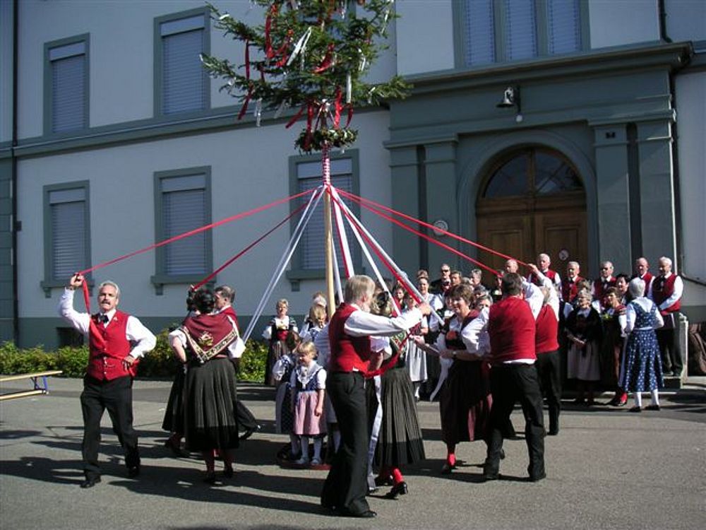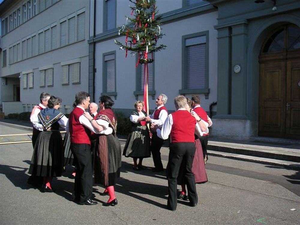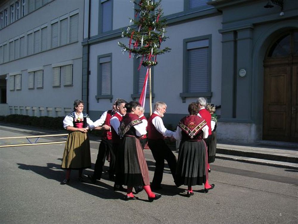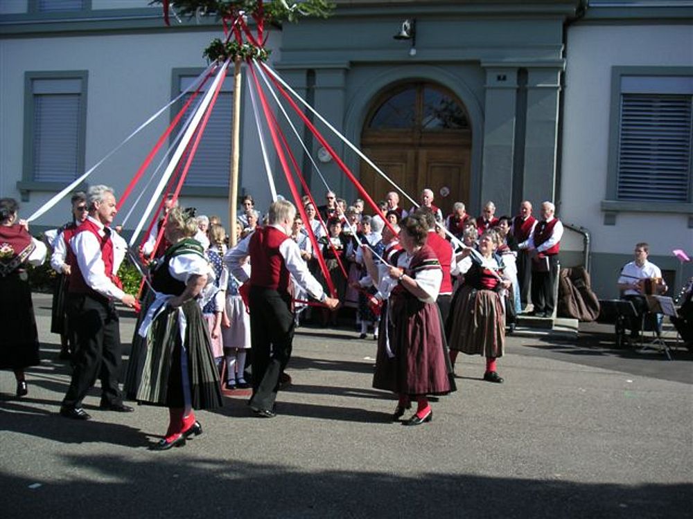 Um 11.00 Uhr konnten wir dann mit unserem Maitanzen und Singen beginnen. Eine grosse Anzahl Zuschauer warteten bereits, zum Teil im Schatten der Bäume stehend, auf dem Pausenplatz des Primarschulhauses auf unsere Darbietungen. Zur musikalischen Begleitung der Oberbaselbieter Ländlerkapelle tanzten zuerst unsere Kleinsten. Die Tanzgruppe tanzte „Anni im Glück“, „Chirsipfäffer“, „Schwedentanz“ und den „Bändertanz“. Der Chor sang die Lieder „Sing mit mir ein fröhliches Lied“, „Mir singe eis im Maie“, „Singe“ und „Alperosezyt“.