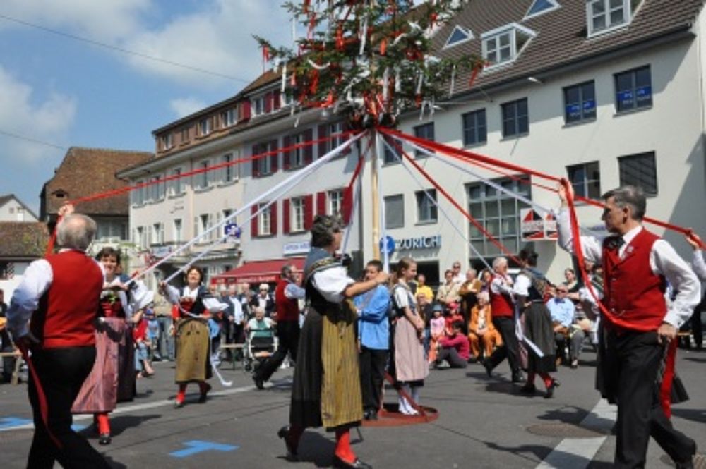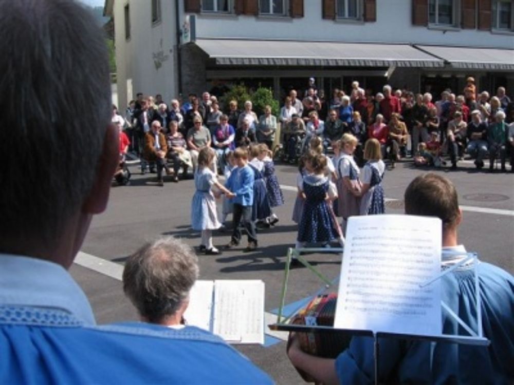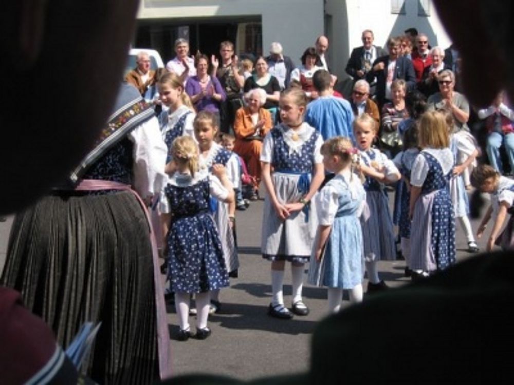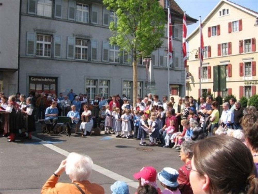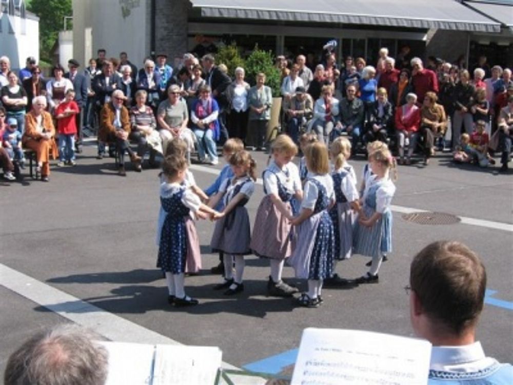 Gemeinsam ging es in die Begegnungszone wo uns die OLK schon erwartete. Erstmals trat die Trachtengruppe beim, mit einem Maibaum geschmückten, Gausibrunnen vor dem Gemeindehaus auf. Dort ging es mit lüpfigen Tänzen wie „Heidiland“ und „Au Tzale i mèdze“ weiter. Der Chor besang blühende Schneeballen und stimmte des Finken Frühlingslied an. Dazwischen trat die Kindertanzgruppe mit fröhlichen Tänzen auf. Höhepunkt war dabei das „Dreiertänzli“ zusammen mit den Grossen. Wie immer waren alle gespannt auf den abschliessenden Bändertanz und er gelang ein weiteres Mal gut. Der Chor durfte mit dem Baselbieterlied die Tanzenden dazu begleiten. Der grossen Publikumschar hat es gefallen, sie bedankte sich mit viel Applaus.