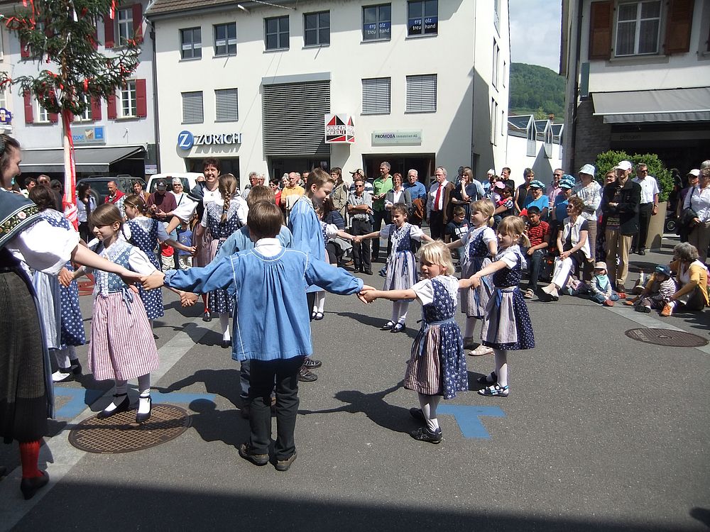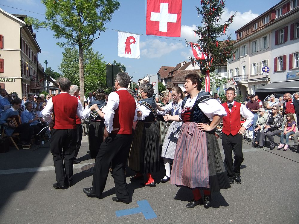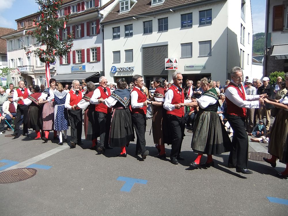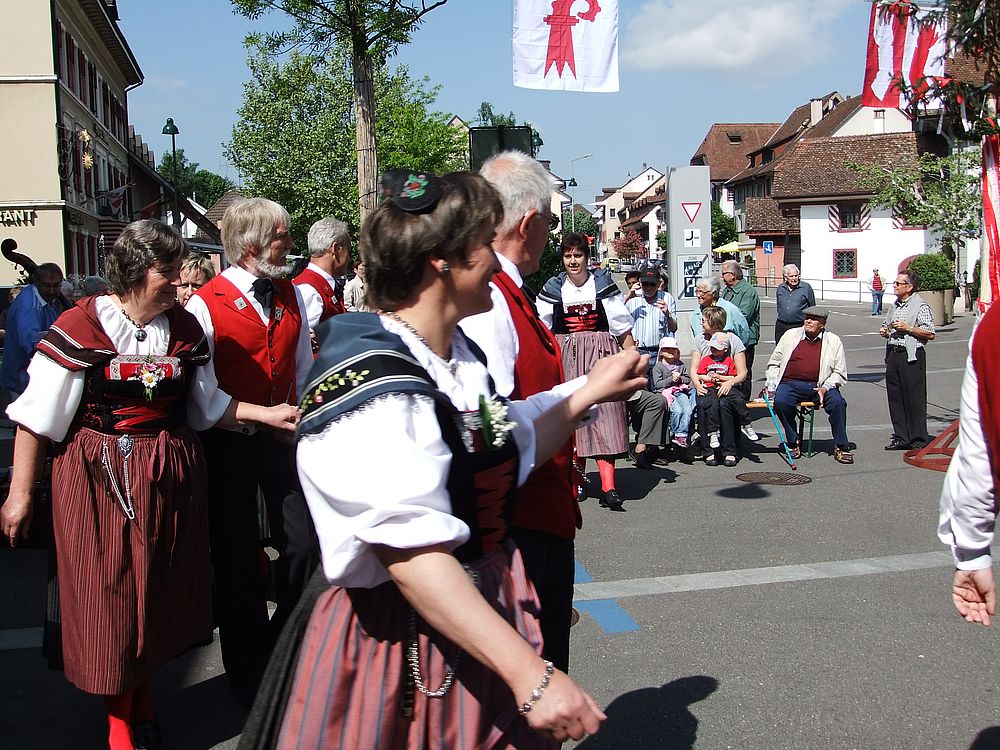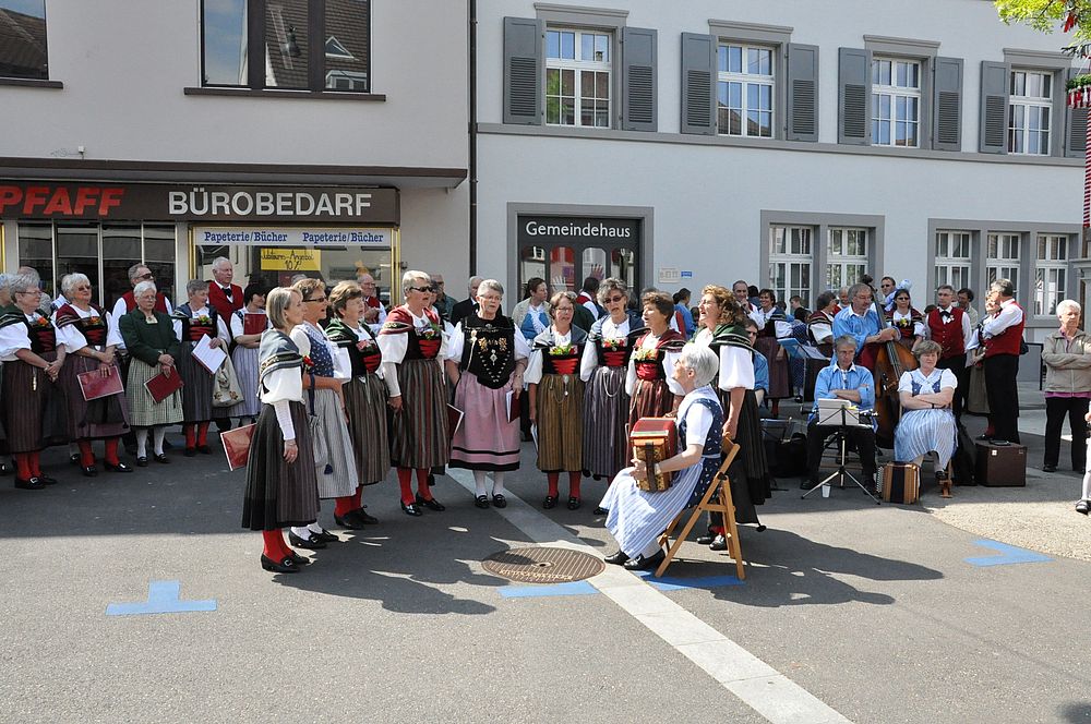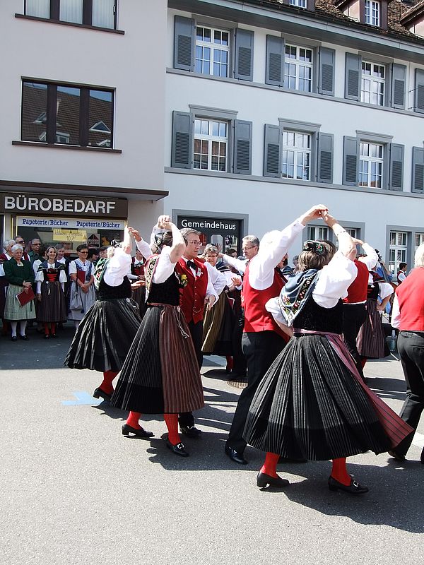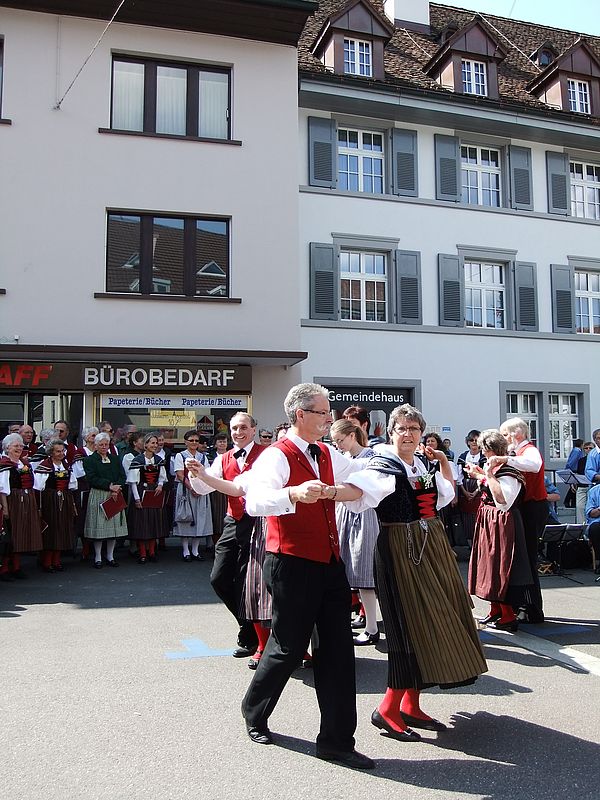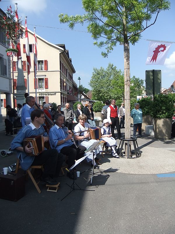 Vor dem Gemeindehaus wartete die zum Aufspielen bereite OLK . In gewohnt lüpfiger Weise begleiteten sie die Tänze. Für ein grösseres Publikum tanzte die Tanzgruppe beschwingt und passend den „Sunndigmorge“ und den „Babeligritte Rheinländer“, sowie den „Züri-Alawander“. Dies für einmal in der verkehrsfreien Begegnungszone.