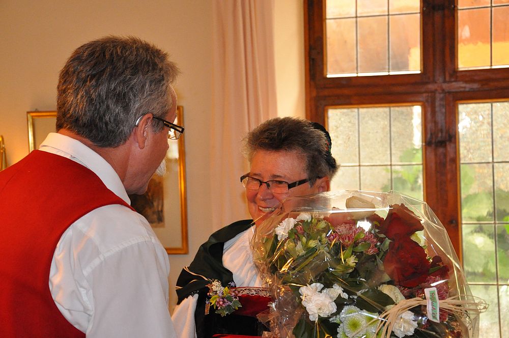 Beim gemeinsamen Mittagessen im Restaurant Sonne wurde die langjährige und verdiente Sängerin Bethli Weitnauer von Hanspeter Misteli mit einem Blumenstrauss in den „sogenannten Ruhestand“ verabschiedet.