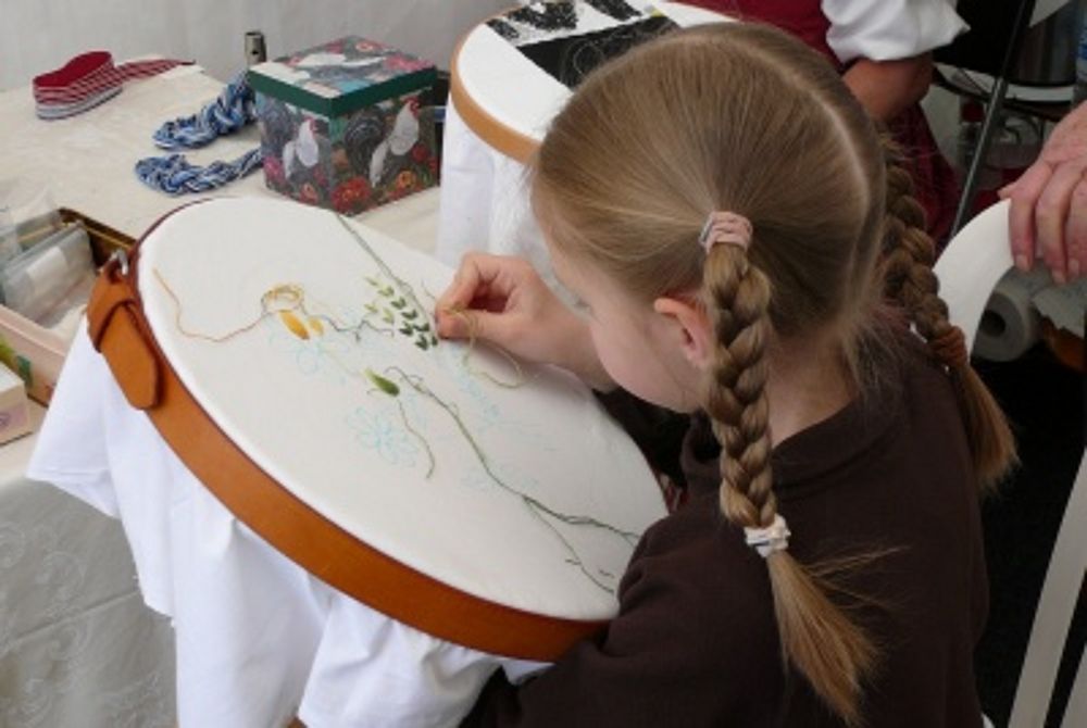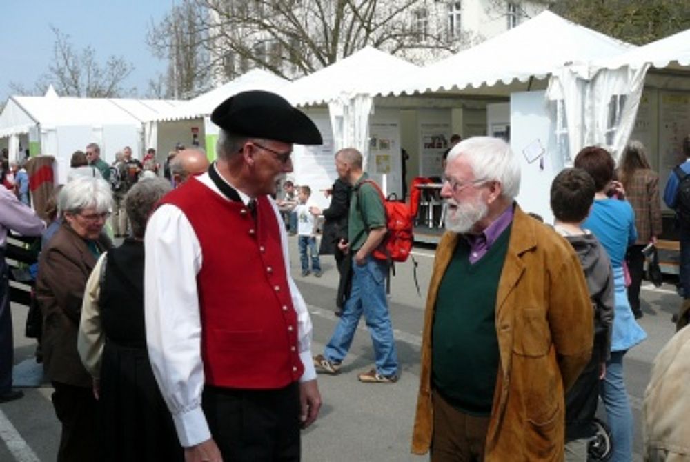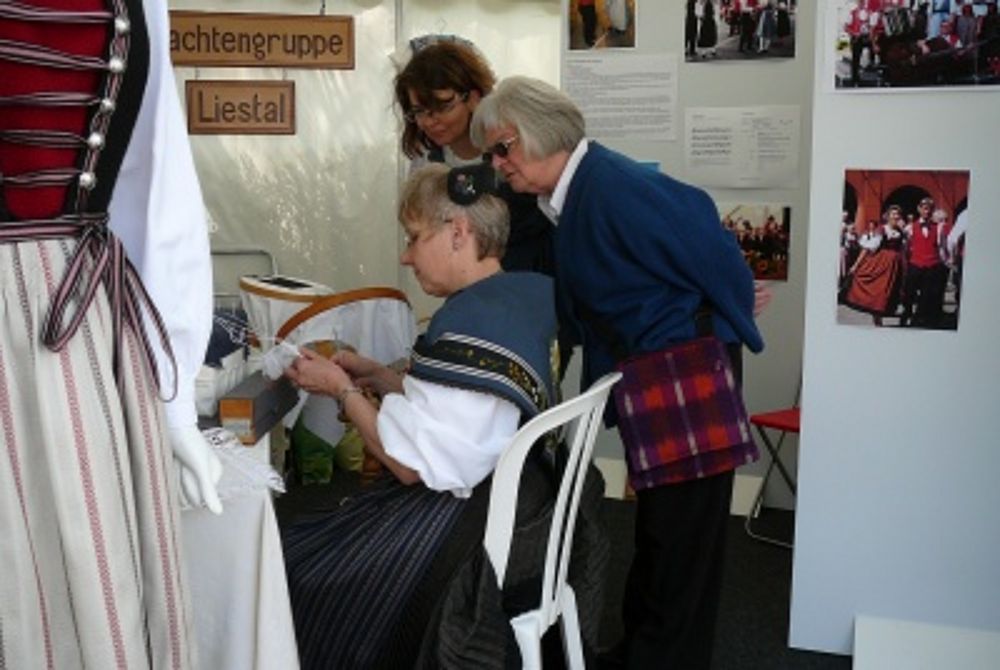 Anlässlich der 550 Jahr Feier der Uni Basel benutzte die Trachtengruppe Liestal die einmalige Plattform, um sich am "Markt des Wissens" vorzustellen. Unter dem Motto „wer sind wir?“ stellten wir den interessierten Besuchern das Trachtenwesen und den Volkstanz vor. Je eine Schaufensterpuppe in der Baselbieter und der Birsecker Festtracht zierten unseren Stand. Kathrin Rudin und Margrit Kessler demonstrierten die Techniken des Bändel Webens, des Filochierens und des Stickens eines Seidentuchs, die auf sehr grosses Interesse stiessen. Wer es sich zutraute, konnte unter kundiger Anleitung selbst versuchen, ein Blatt zu sticken.