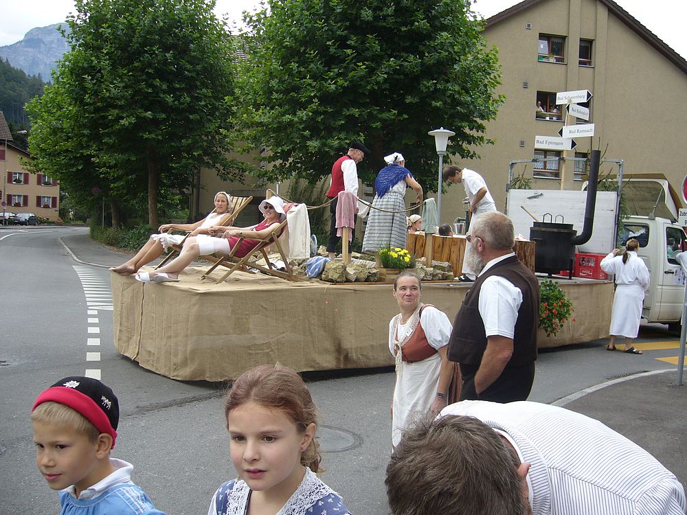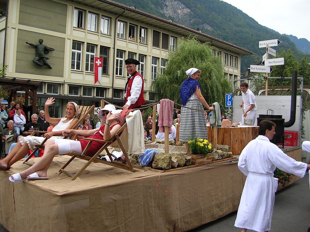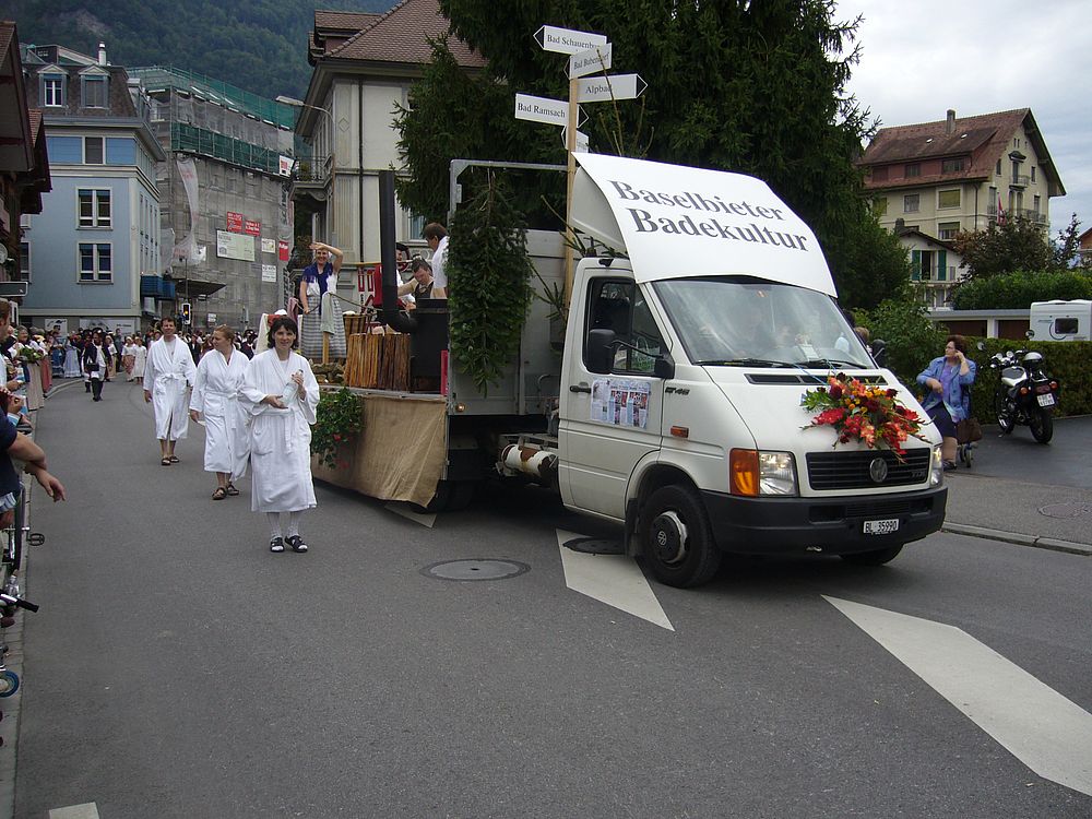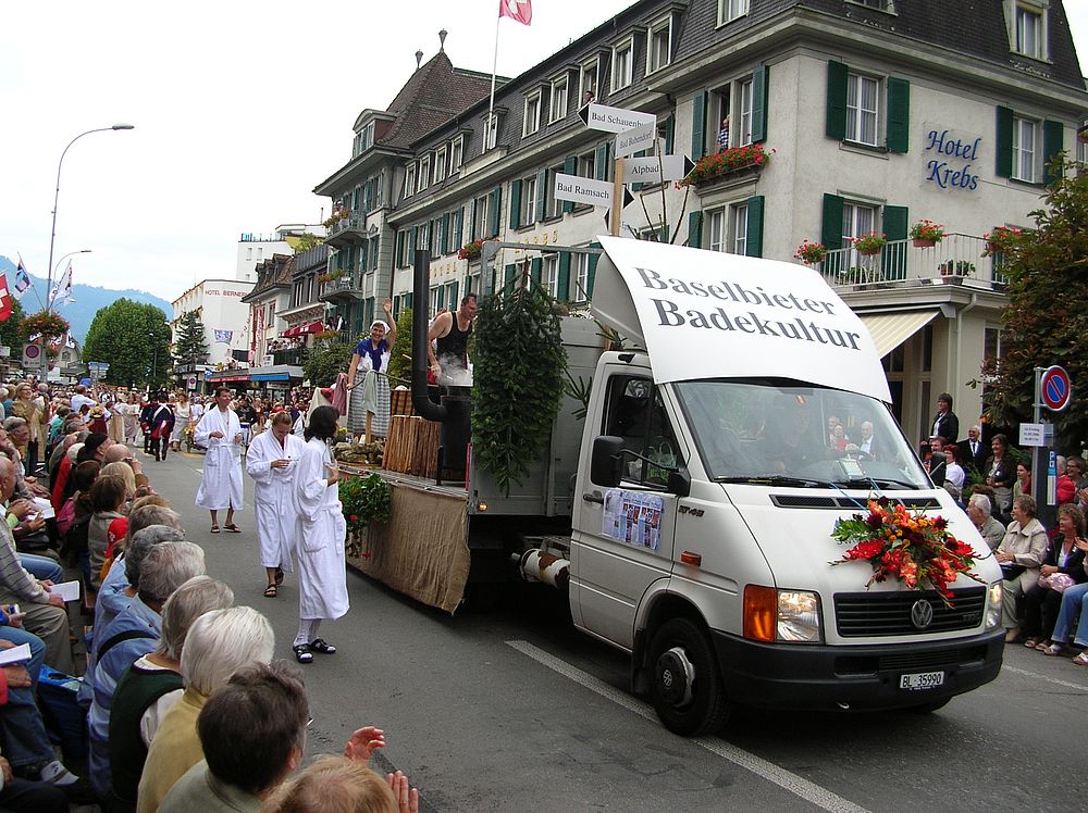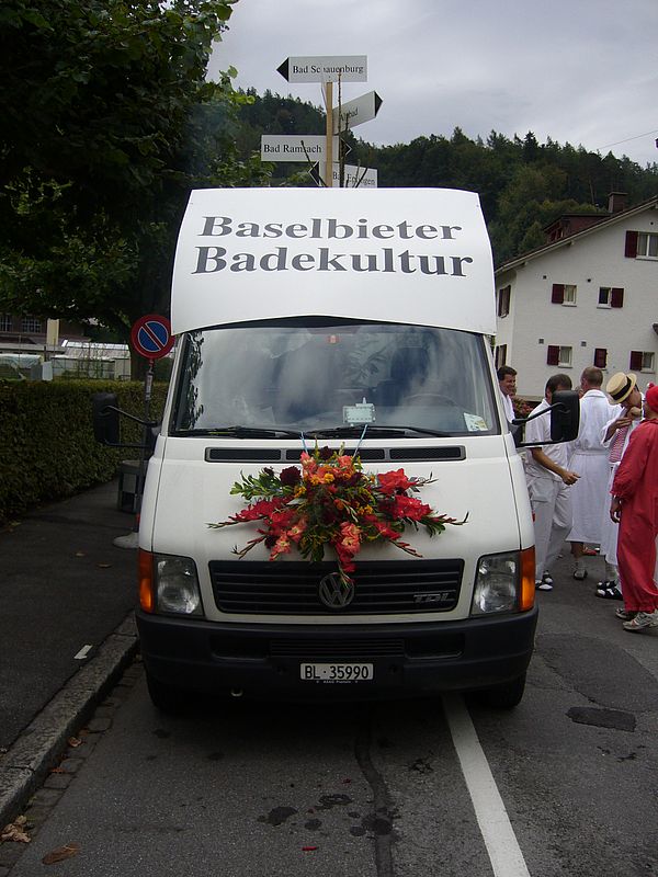 Wie wir dem Applaus der Zuschauer entnehmen konnten, fand der Wagen der ‚Baselbieter Bäderkultur’ grossen Anklang. Auch das verteilte Ramsacher Wasser wurde gerne entgegengenommen, wobei viele aber einen anderen Inhalt vermuteten…