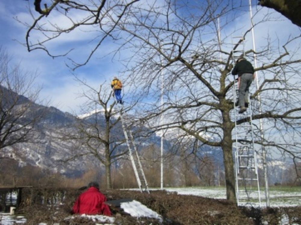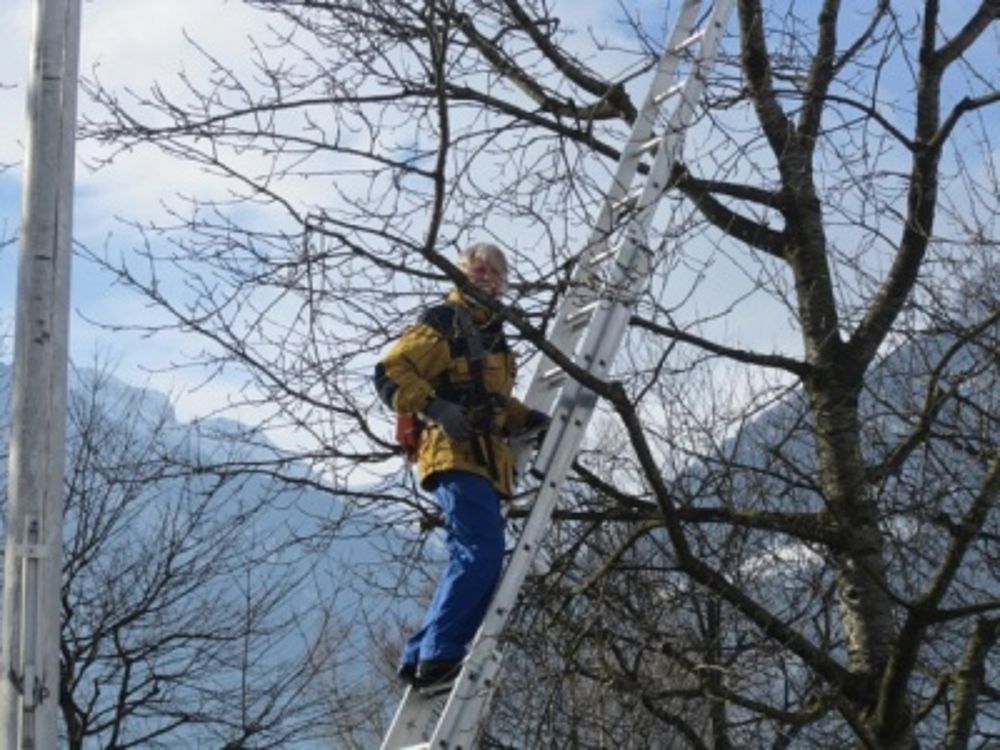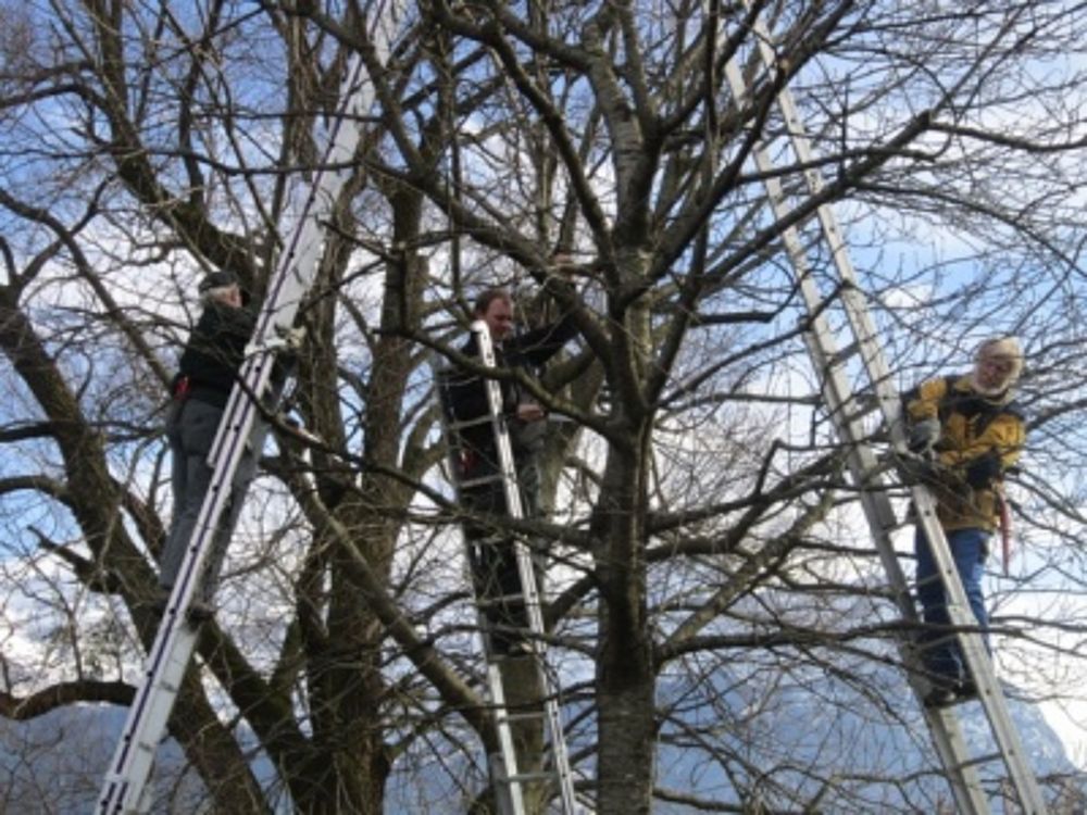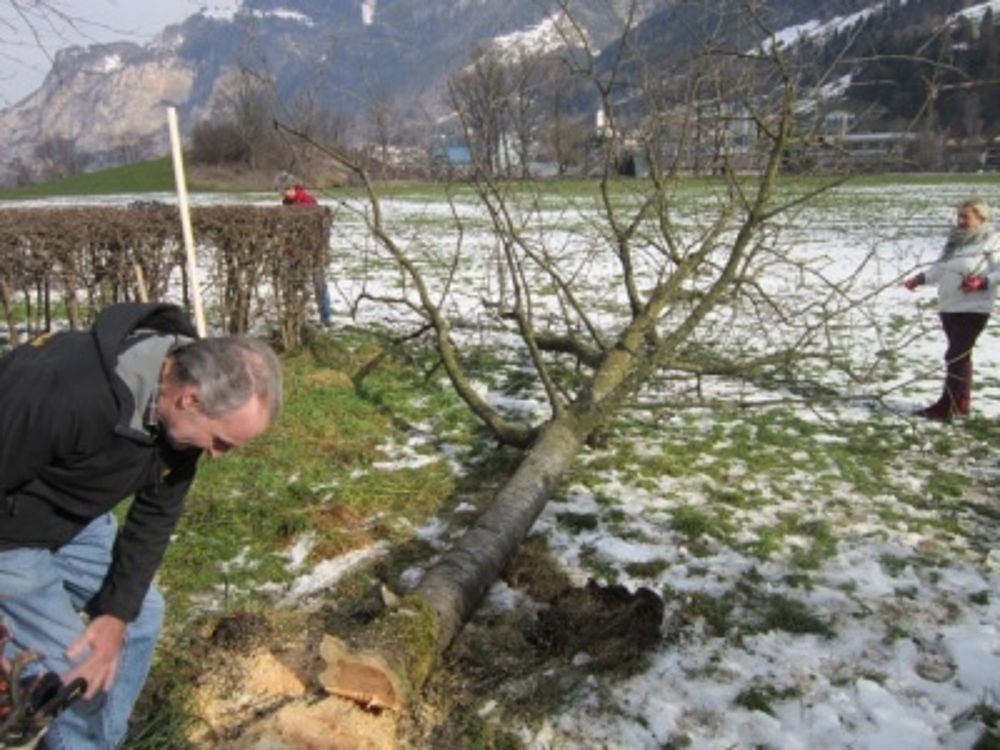 Nach allen Abklärungen bei der Gemeinde Flüelen, fuhren wir am Samstag, 14. Februar, mit acht Personen nach Flüelen. Zwei Obstbauern und ein Baumwärter aus unserer Gruppe machten sich sogleich an die Arbeit. Die Leitern stellte uns die Gemeinde zu Verfügung. Dank dem schönen Wetter kamen wir flott voran. Wer nicht auf dem Baum war, schichtete das Astmaterial auf. Das Schlussresultat kann sich sehen lassen. Sechs Kirschbäume geschnitten und ein Kirschbaum gefällt und durch einen neuen ersetzt. Die Äste wurden säuberlich zu sechs grossen Haufen geschichtet und zum Abholen durch die Gemeinde Flüelen bereit gestellt.