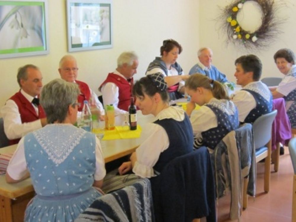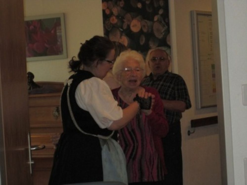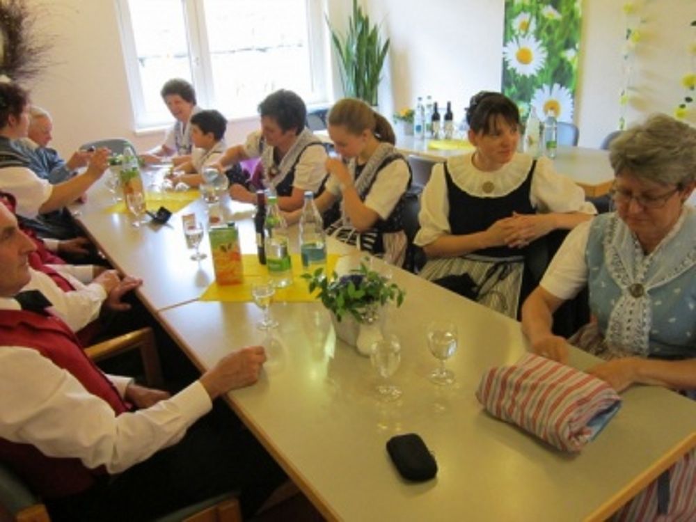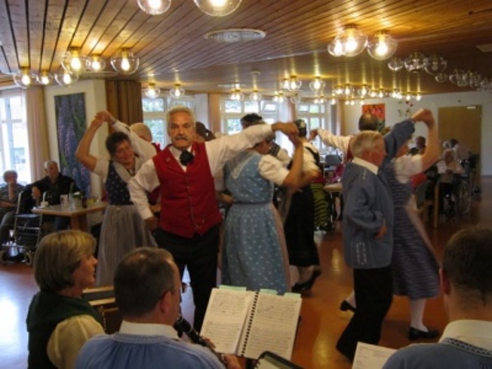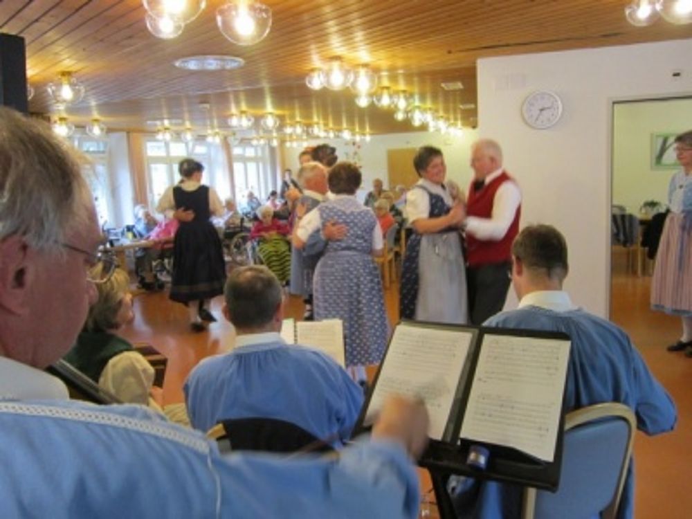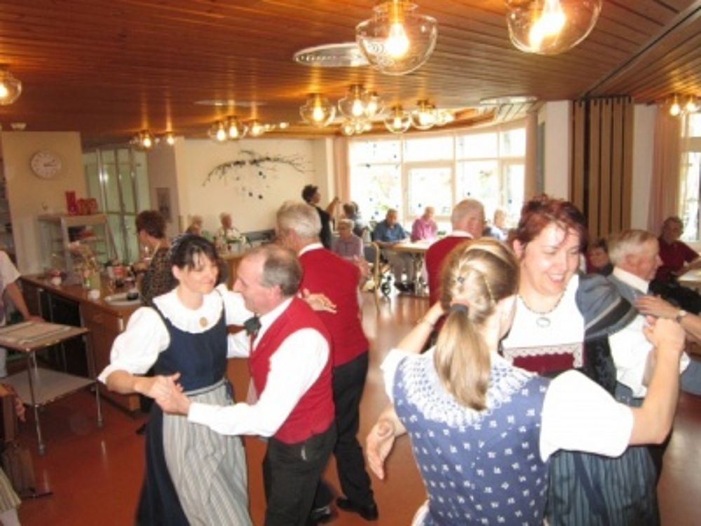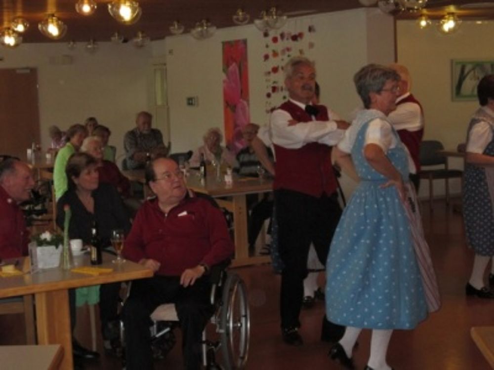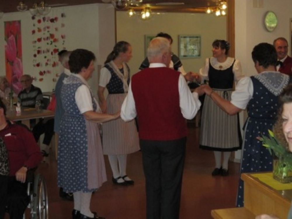 Da das Wetter nicht zum draussen bleiben einlud, wurde die Veranstaltung im grossen Saal im Erdgeschoss abgehalten. Zur musikalischen Begleitung der Oberbaselbieter Ländlerkapelle tanzten wir die Tänze: „Waisligerwalzer, Selbviert, Frühlingswalzer, Heidiland, Mai-rösliwalzer, Pöstlerschottisch, La Talianina und Im Örgelihus". Den anwesenden Heimbewohnern und Angehörigen hat es merklich gefallen, durften sie zwischen unseren Darbietungen zu den Klängen der OLK selbst das Tanzbein schwingen.
