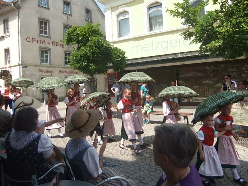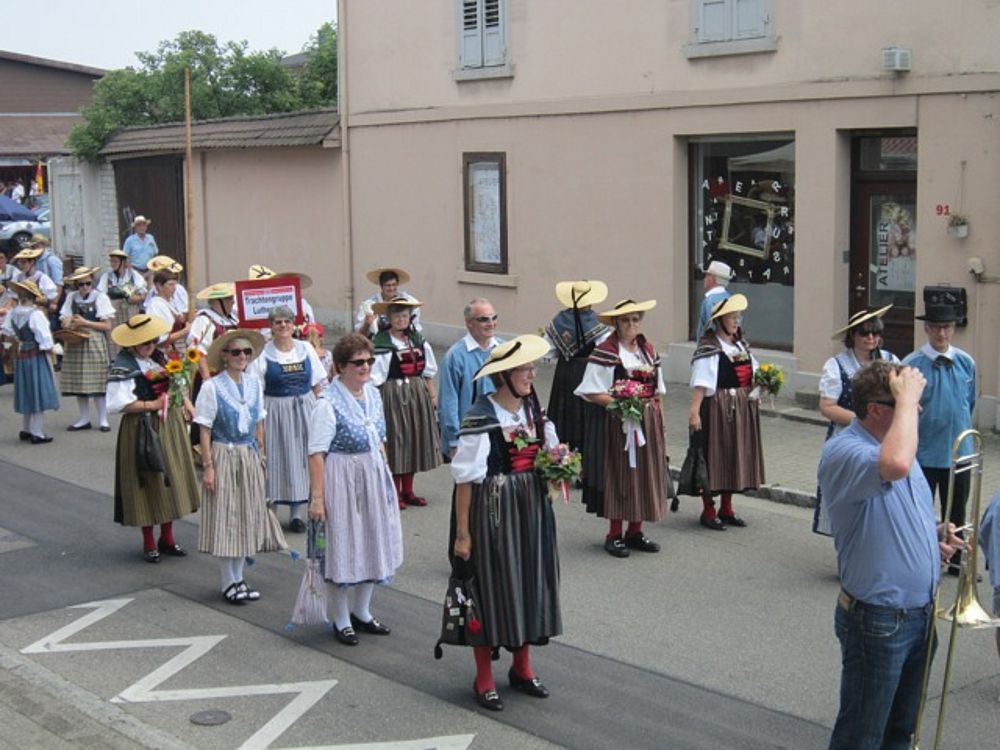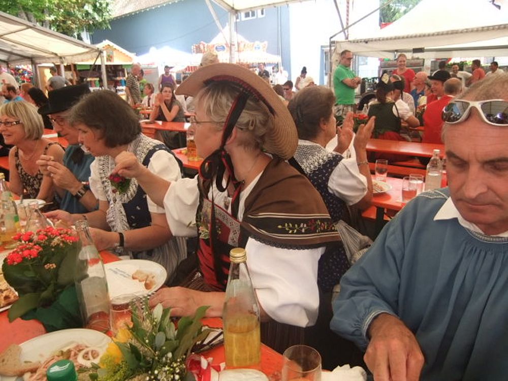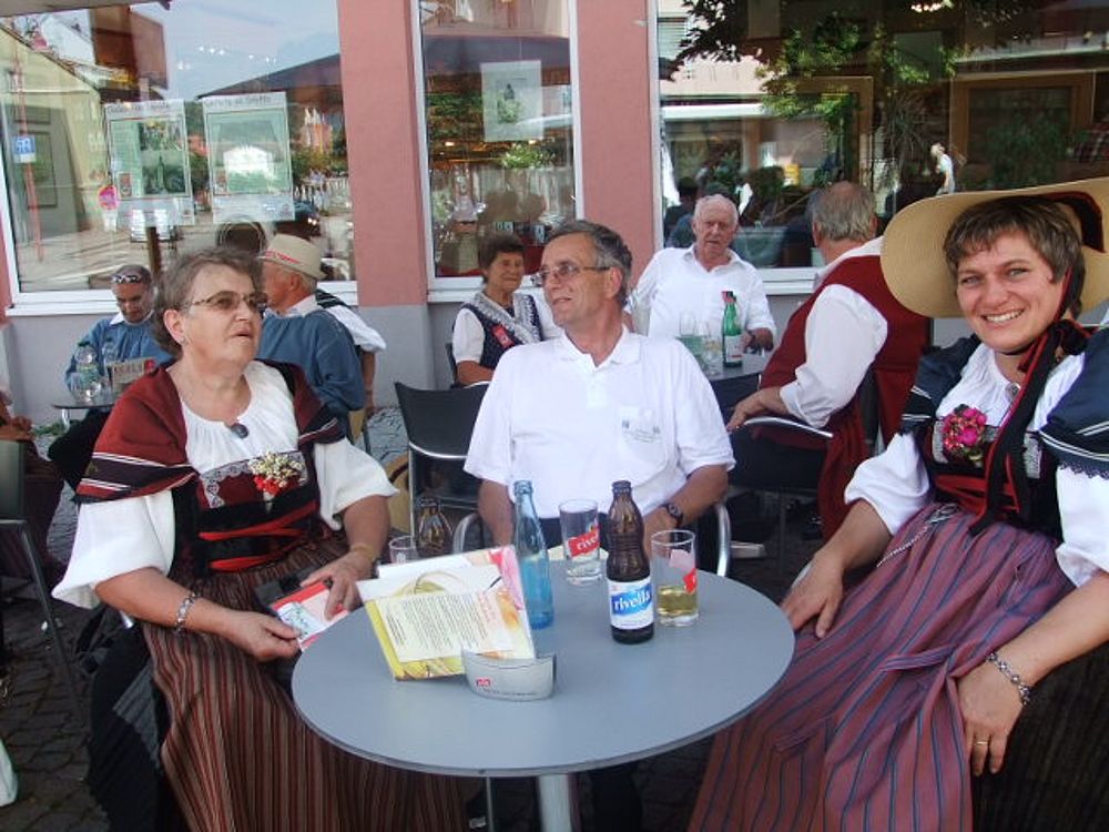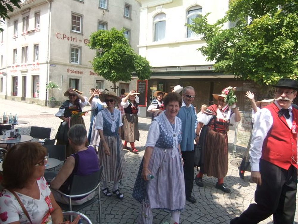 Vorteilhaft war für uns die Einteilung, schon an sechster Stelle durften wir uns einreihen. Pünktlich um 14.00 Uhr ging es los, inmitten von Blaskapellen, Trachtengruppen und sonstigen folkloristischen Formatierungen liefen wir im Umzug mit. Viele begeisterte Zuschauer standen trotz Hitze am Strassenrand und applaudierten. Nach einer Kehrtwende trafen wir wieder Zentrum ein. Dort fanden wir Platz in einer schattigen Gartenwirtschaft, von wo aus wir den Umzug fertig ansehen und selbstverständlich auch den Durst löschen konnten.Wir lauschten noch den Vorträgen von der nahen Bühne und liessen damit den Ausflug ausklingen.