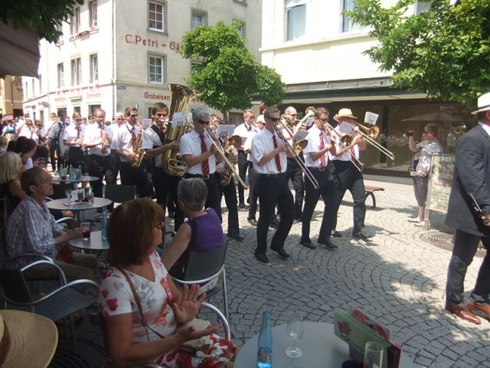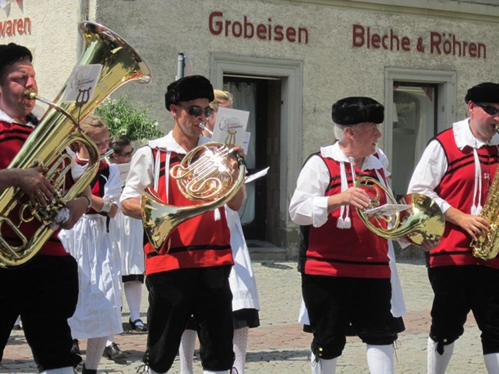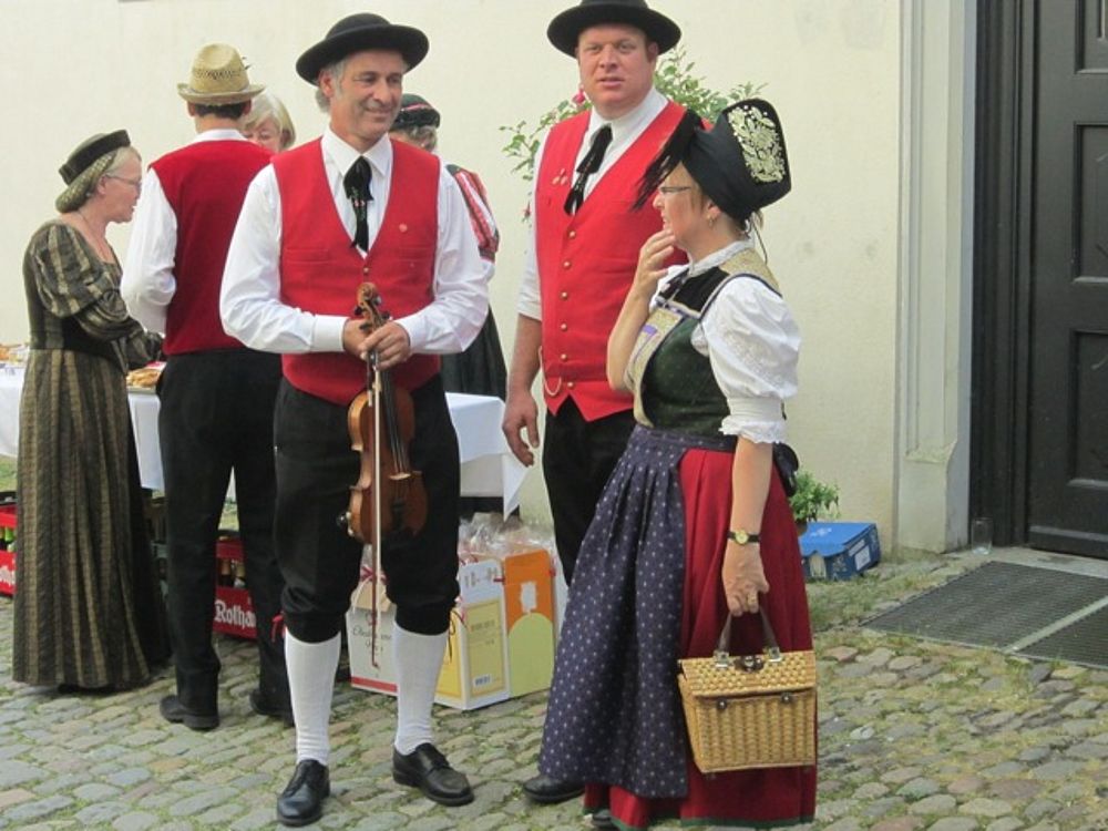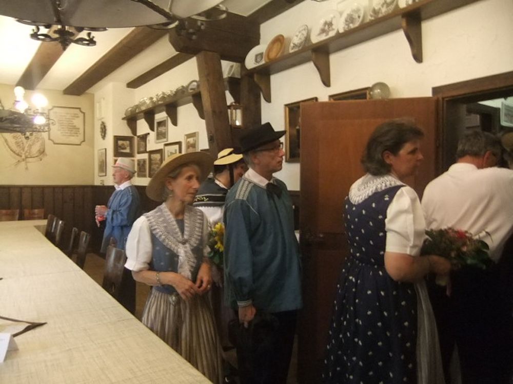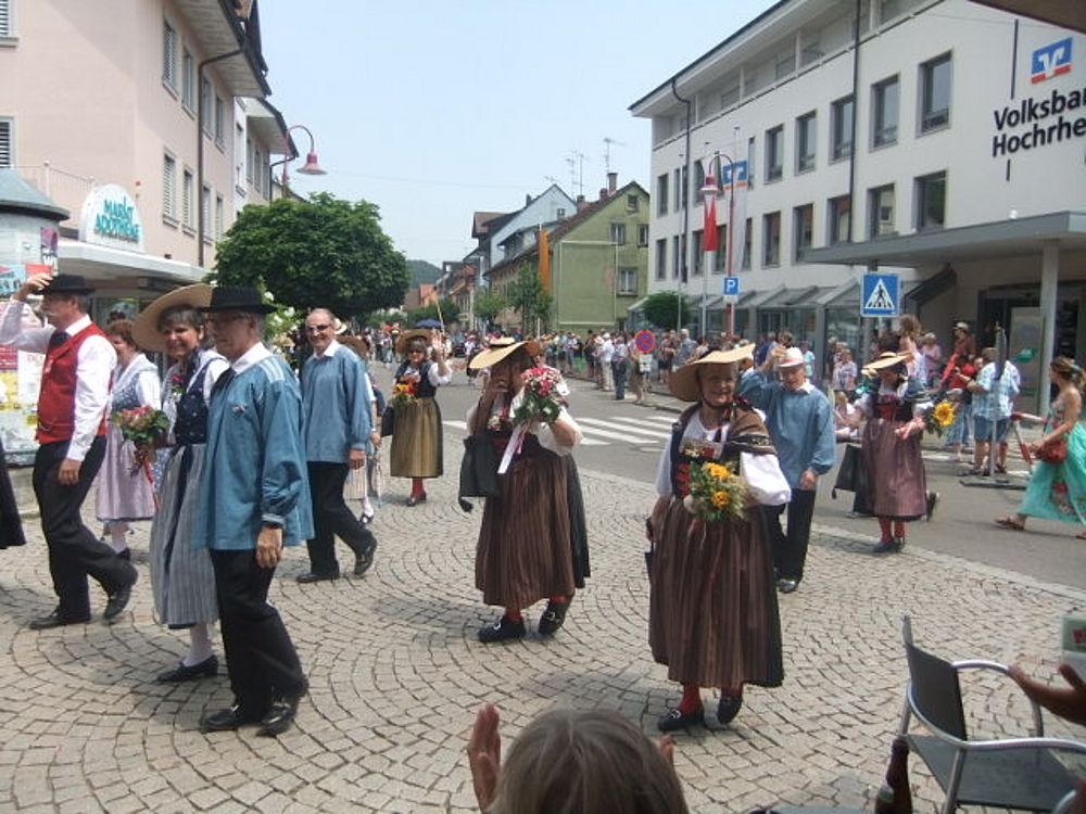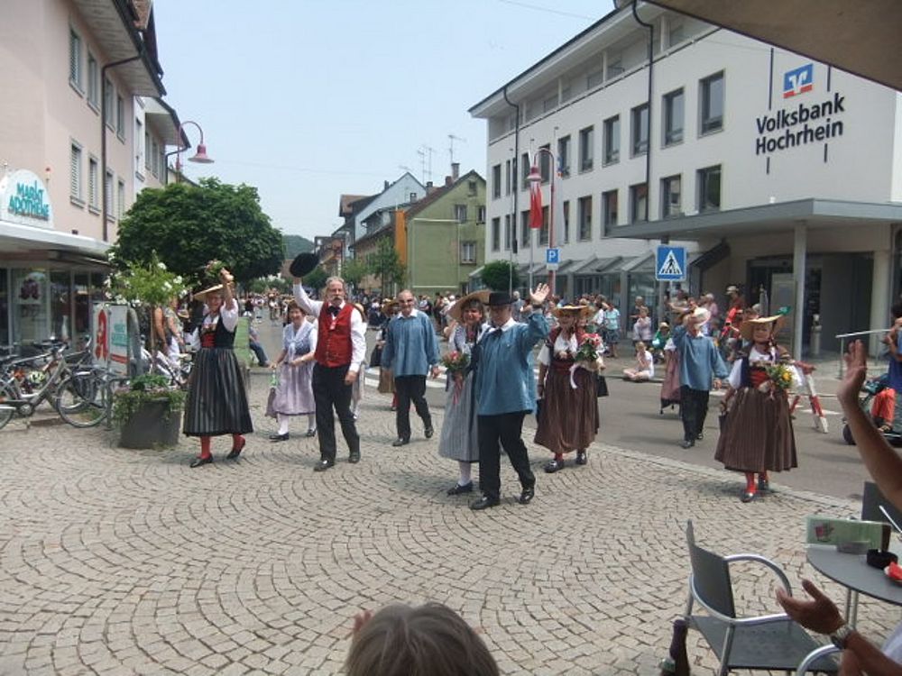 Vorteilhaft war für uns die Einteilung, schon an sechster Stelle durften wir uns einreihen. Pünktlich um 14.00 Uhr ging es los, inmitten von Blaskapellen, Trachtengruppen und sonstigen folkloristischen Formatierungen liefen wir im Umzug mit. Viele begeisterte Zuschauer standen trotz Hitze am Strassenrand und applaudierten. Nach einer Kehrtwende trafen wir wieder Zentrum ein. Dort fanden wir Platz in einer schattigen Gartenwirtschaft, von wo aus wir den Umzug fertig ansehen und selbstverständlich auch den Durst löschen konnten.Wir lauschten noch den Vorträgen von der nahen Bühne und liessen damit den Ausflug ausklingen.
