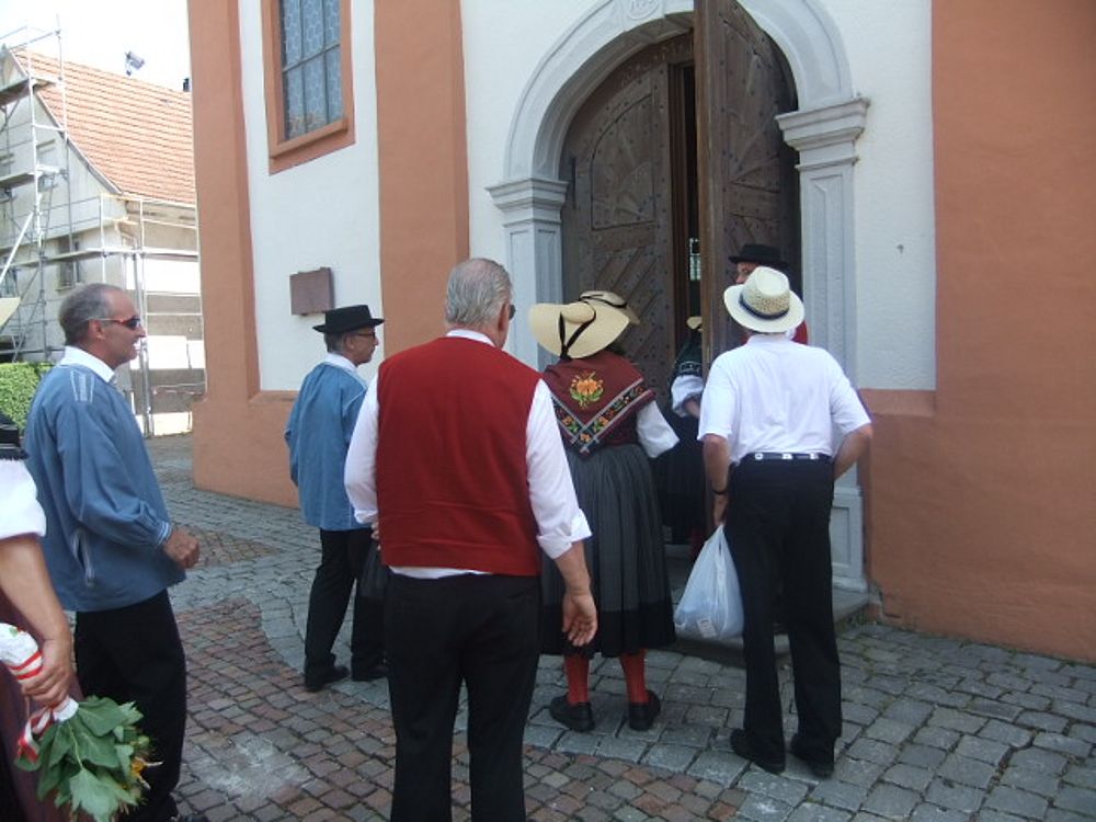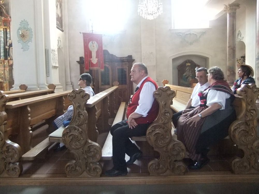 Ein "Grüppchen" Trachtenleute bestieg bei hochsommerlichen Temperaturen in Sissach den Bus, nach einstündiger Fahrt kamen wir wohlbehalten in Tiengen an. Dort wurden wir von einer Dame empfangen, die uns zum Marktplatz führte. Der Spaziergang wurde durch zwei Kurzbesuche in der „Maria Himmelfahrt“ Pfarrkirche und in der Zunftstube der „Bürger- und Narrenzunft“ im Schloss unterbrochen. Die prächtige und kühle Kirche war ein willkommener Abstecher.