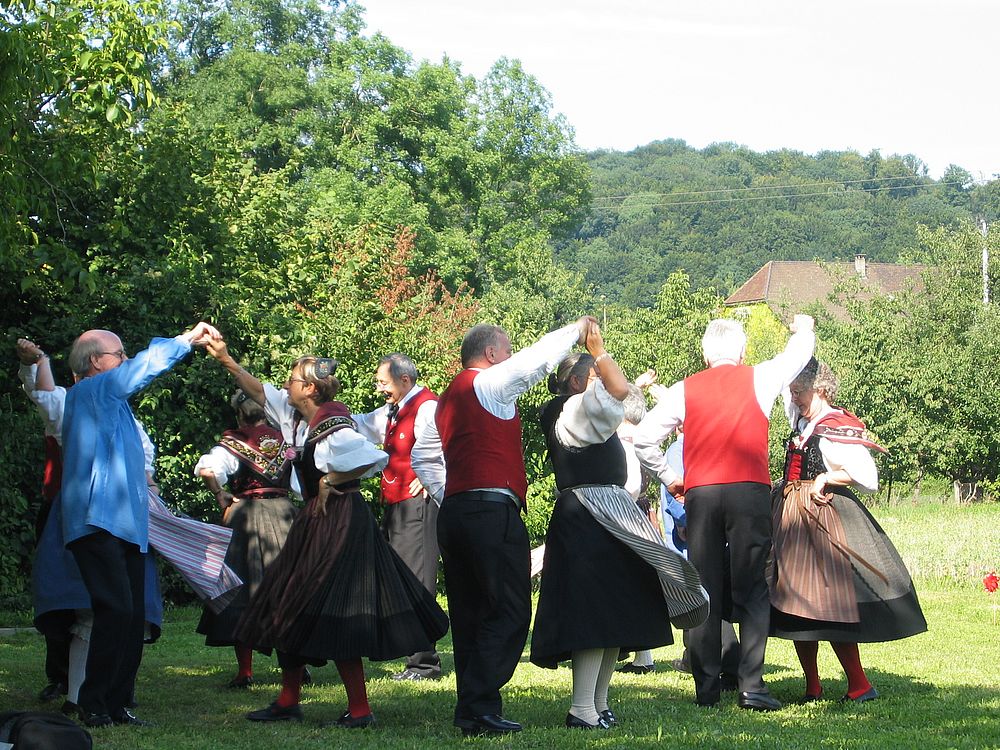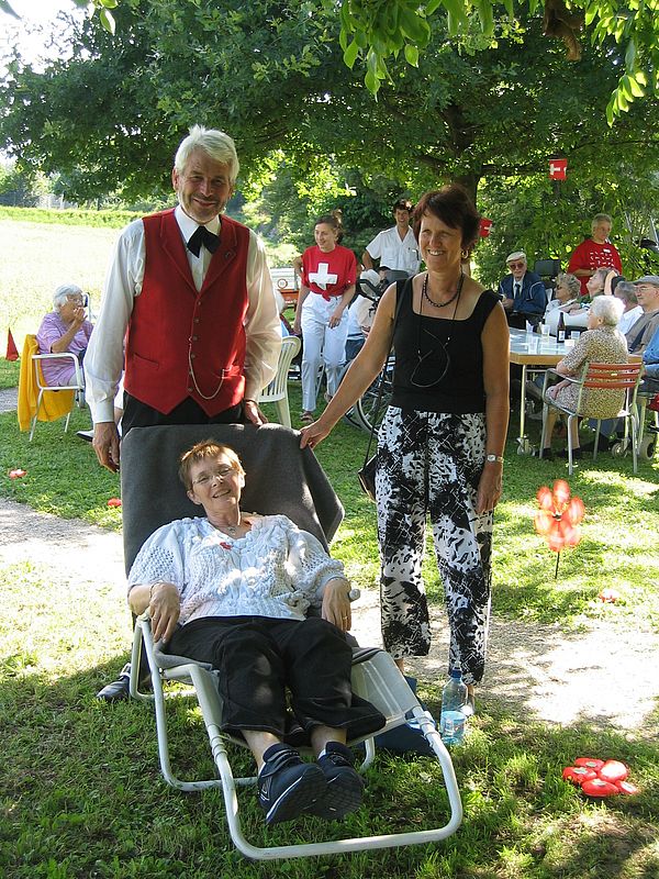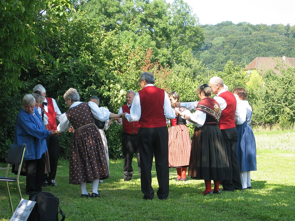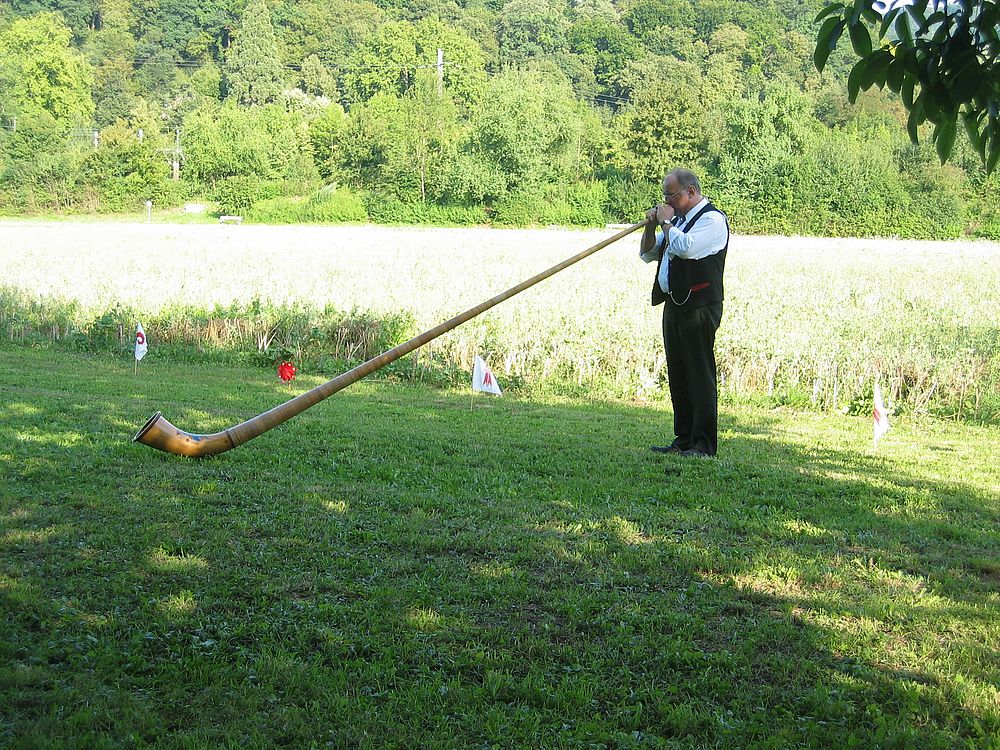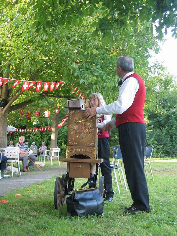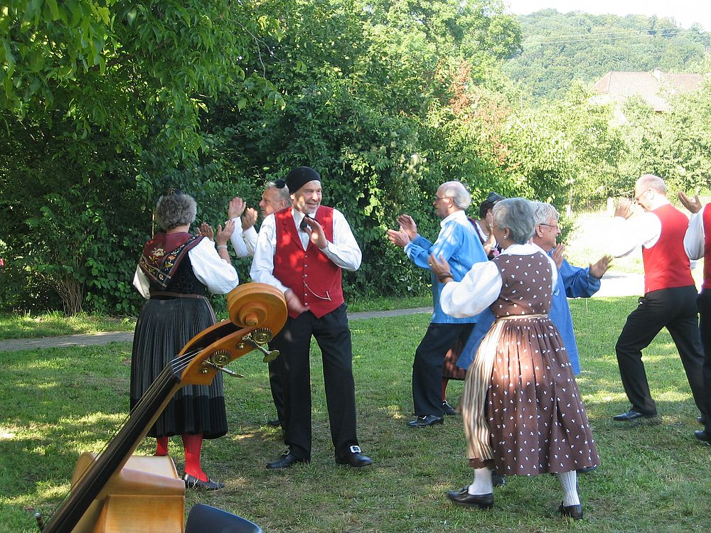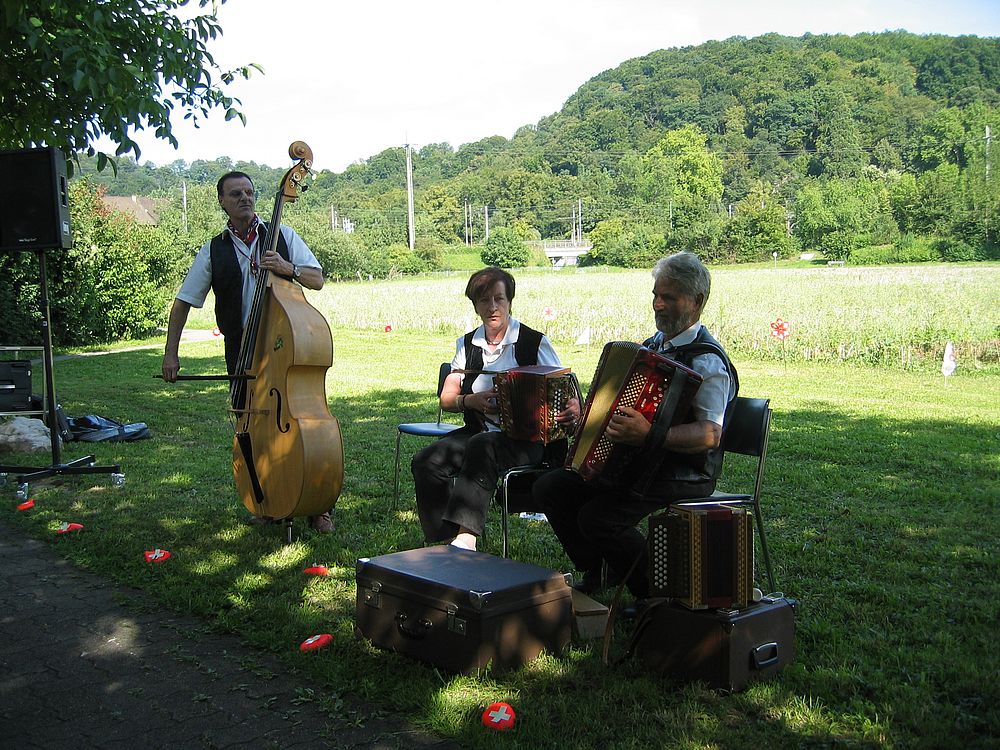 Dank des super Wetters fand die Feier zur Freude Aller wieder im Garten statt, auch wenn dadurch Rasen (und nicht wie beim Eintanzen ein Parkettboden) unsere Tanzfläche bildete. Weitere Mitmachende waren erneut die Kapelle Flüehblüemli Basel und ein Alphornbläser. Auch das Drehörgeli, diesmal von René bedient, war mit dabei und sorgte dafür, dass neben volkstümlicher Musik auch viele Oldies Melodien die zahlreichen Besucher erfreuten.