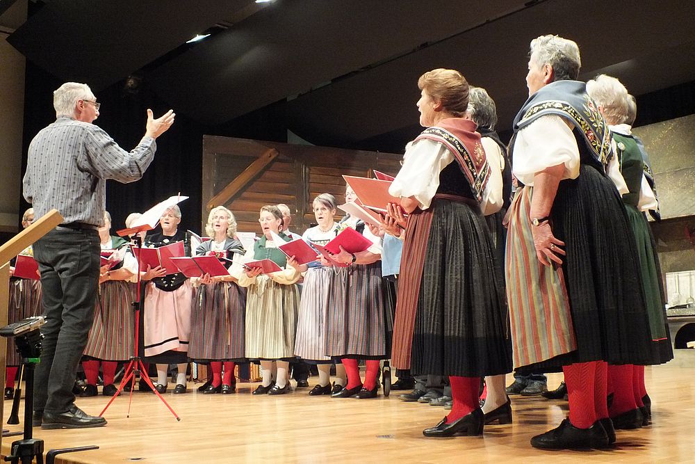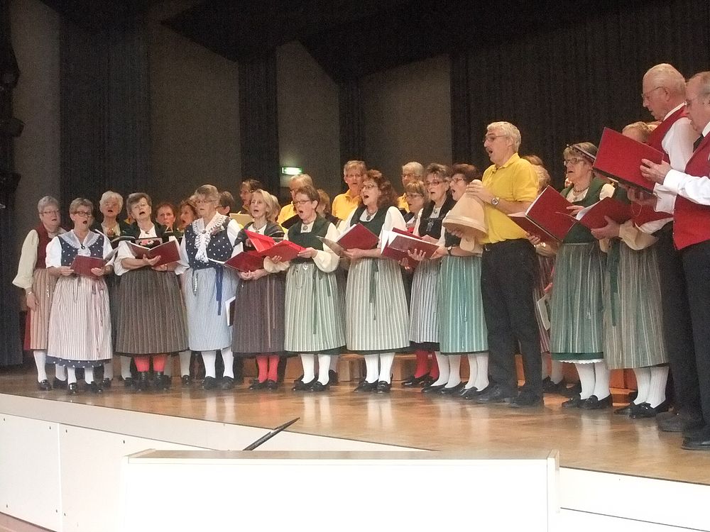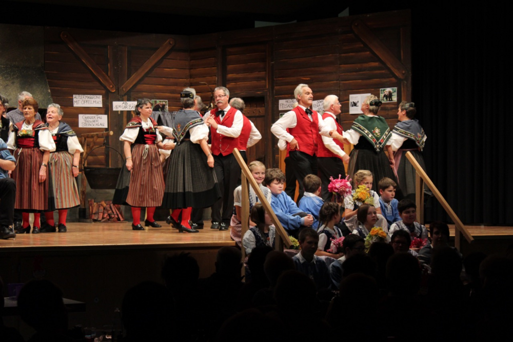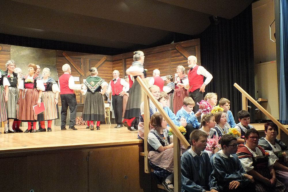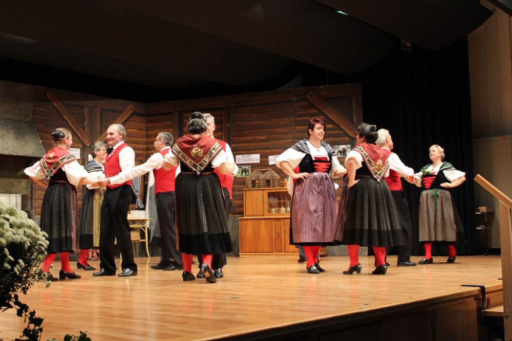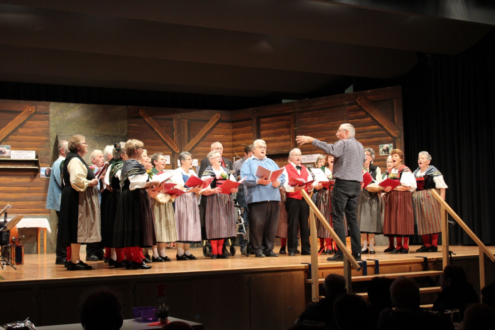 Eine Herausforderung war das Lied “Freude am Leben“. Der Trachtenchor meisterte dies perfekt und erhielt grossen Applaus. Den Abschluss des ersten Teils boten die drei Gruppen zusammen. S’Träumli, das bekannte Lied der Boss Buebe, liess die Trachtenleute beschwingt über die Bühne tanzen und der Chor sang zur rassig gespielten Melodie.