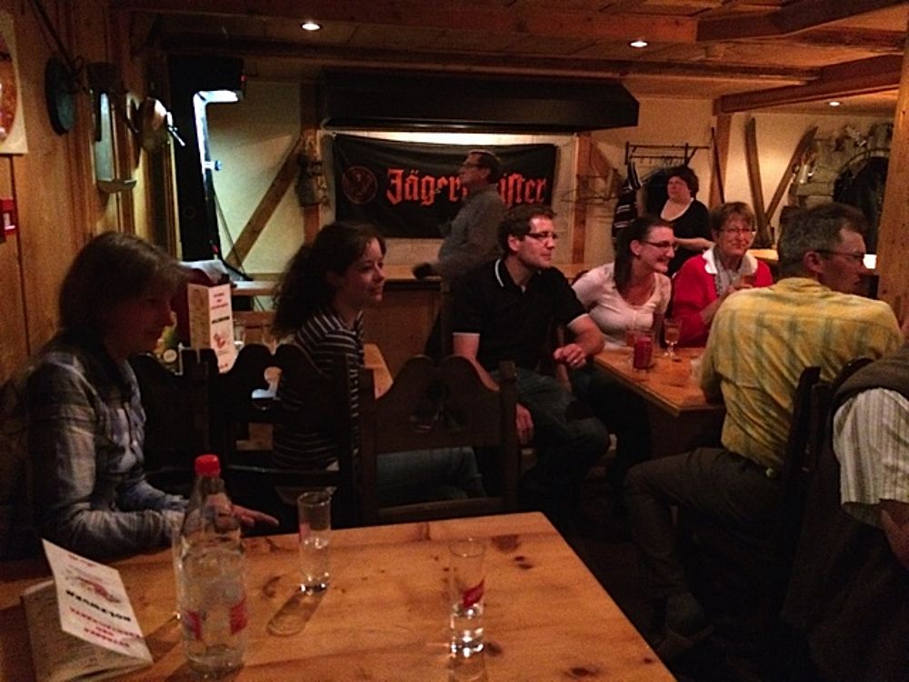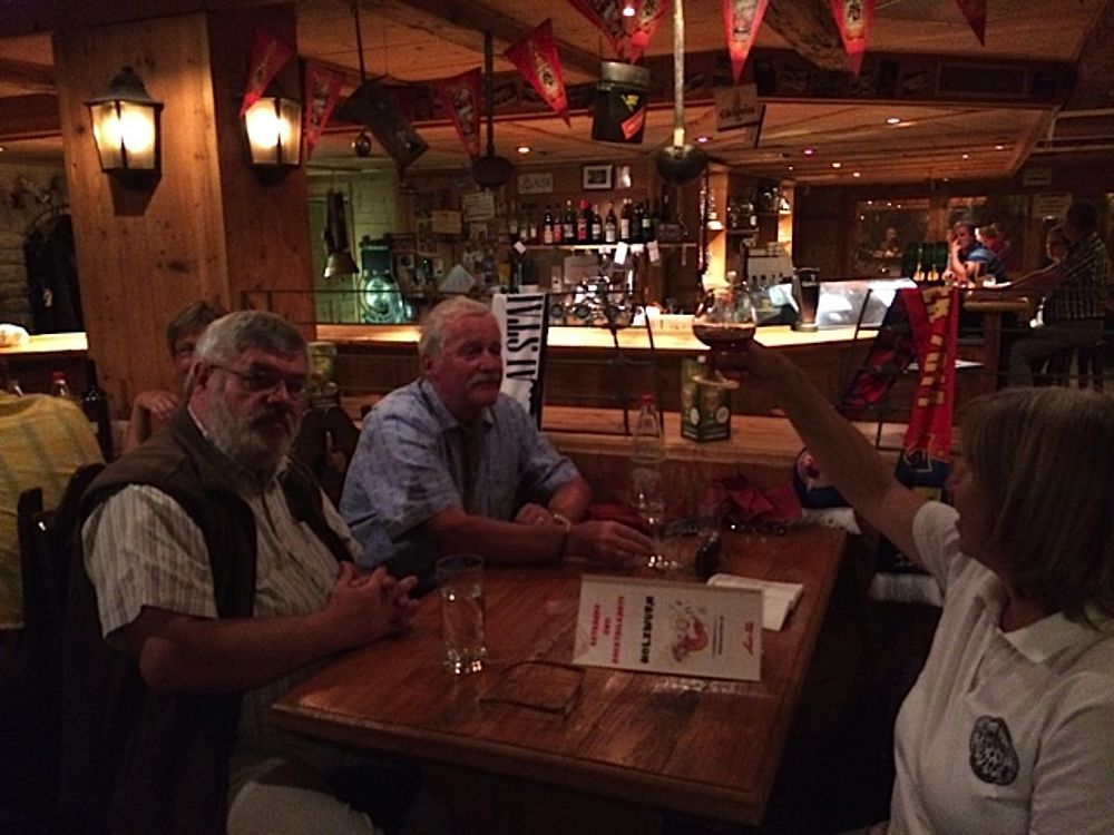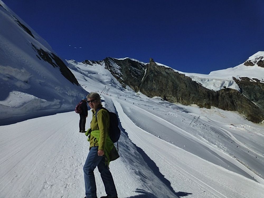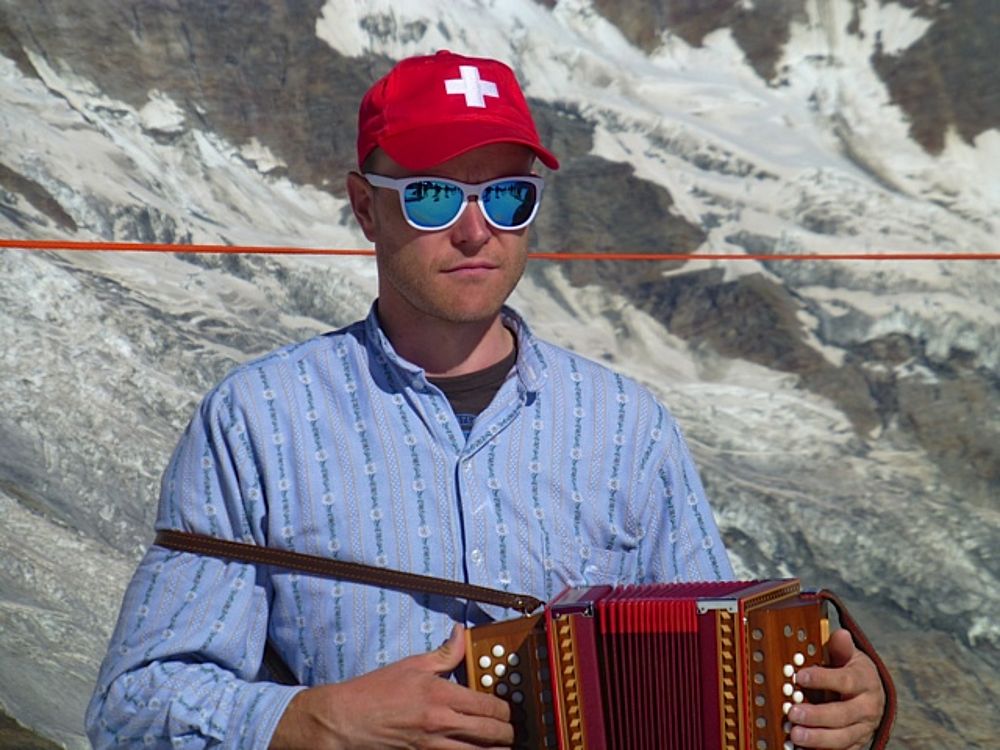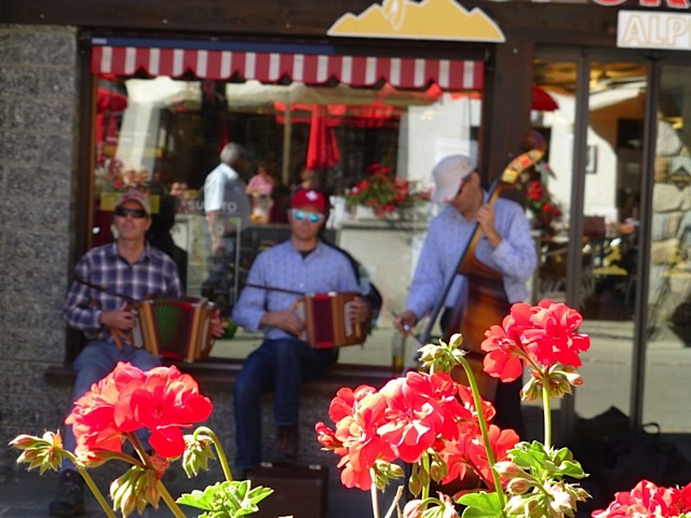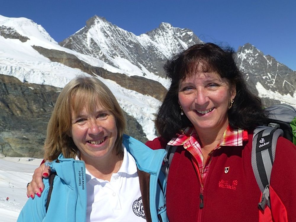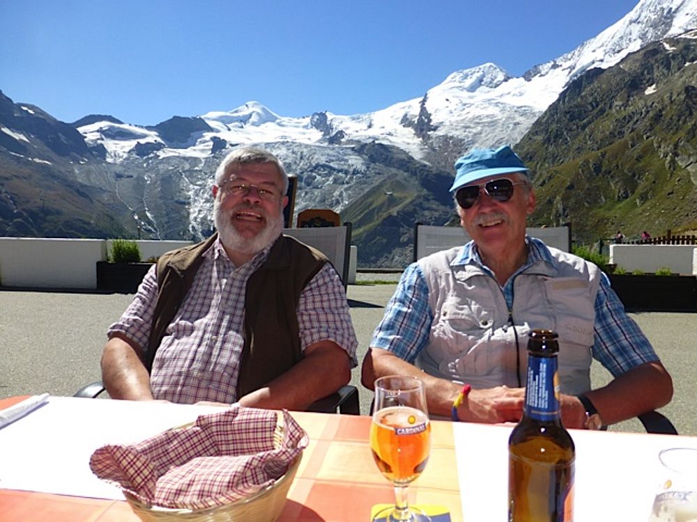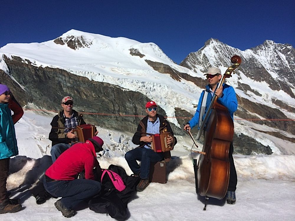 Der Sonntag stand ganz im Zeichen von Sonneschein pur, Schnee, Eis und Gletscher!! Mit der Gondel und der Metro-Bahn ging aus auf 3500 müM auf den Allalin. Unsere Musikanten war kein Aufwand zu Schade, die Örgeli und die Bassgeige bis ganz nach oben mitzunehmen. Die dünne Luft so hoch oben machte sich aber dann beim Alewander und Marschwalzer mit den anderen Gästen deutlich bemerkbar! Aber was soll's: Im Schnee haben von uns noch die wenigsten getanzt, gesungen und musiziert. Das hat man nicht alle Tage, deshalb nutzten wir die Gelegenheit.