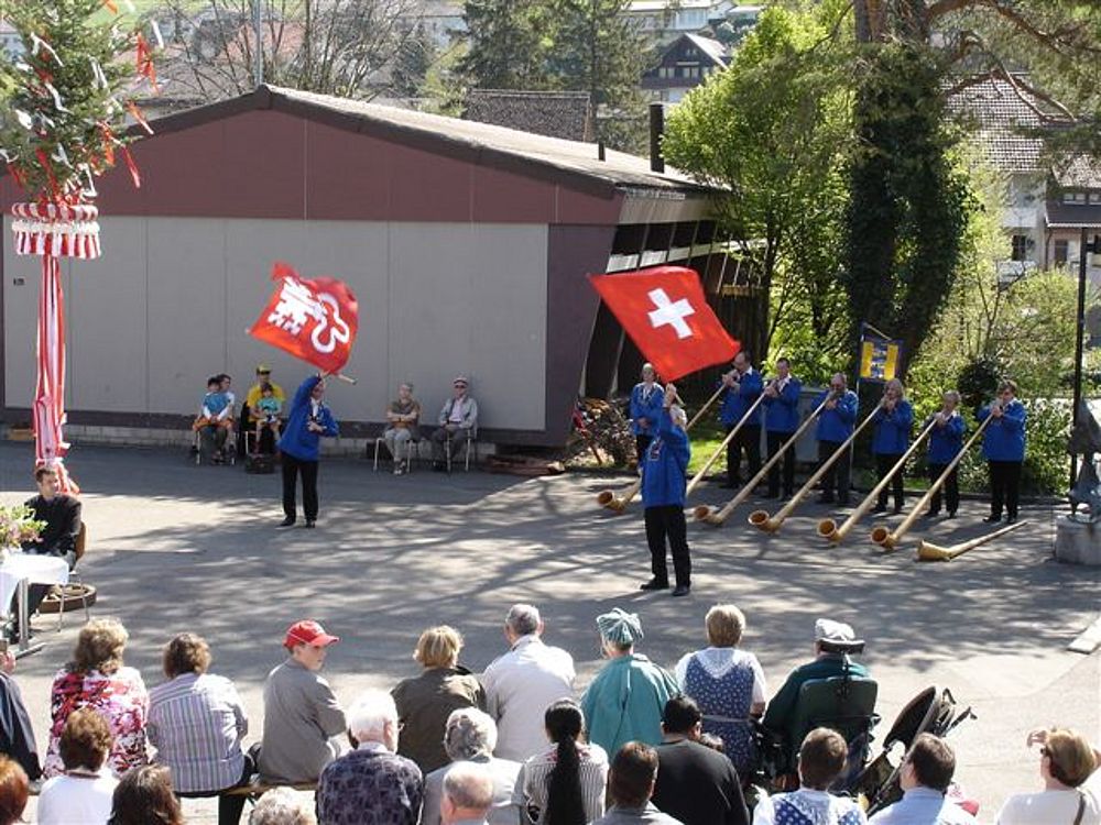 Der reformierte Pfarrer Hanspeter Schürch und der katholische Vikar Markus Fellmann gestalteten vor dem Tanzen gemeinsam den ökumenischen Gottesdienst, bei dem die Frage nach der Heimat im Zentrum stand. Pfarrer Schürch berichtete aus seiner Kindheit, wo ein Wegzug seiner Familie aus dem Oberbaselbiet ins Ferienhaus im Emmental diskutiert wurde. Die Vorstellung, die Kameraden nicht mehr zu sehen und an einen fremden Ort gehen zu müssen, erfüllte ihn mit Panik. Heute beobachtet er, wie „einem das Leben ab und zu einen Wechsel abverlangt.“ Und mit einem Blick auf die Gegenwart meinte er: „Das sind die Zeiten, in denen wir wieder vermehrt den Wunsch haben nach Heimat.“ Wehmütig klangen die Alphörner der Gruppe Onoldswil, die zusammen mit Fahnen- und Talerschwingern den Gottesdienst umrahmten.