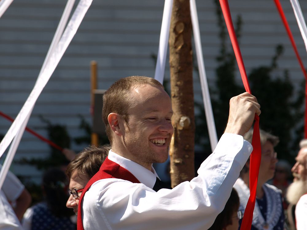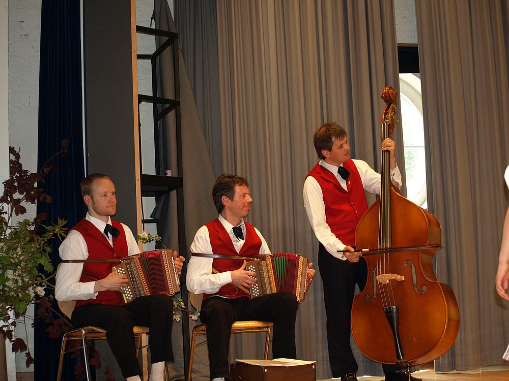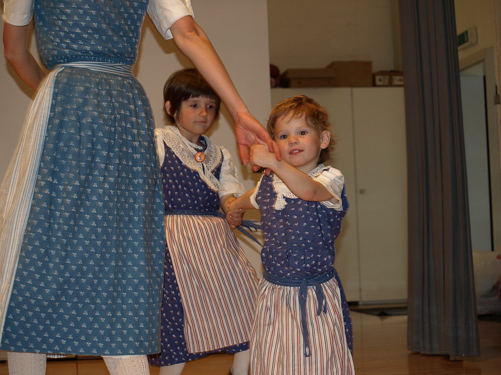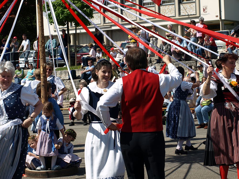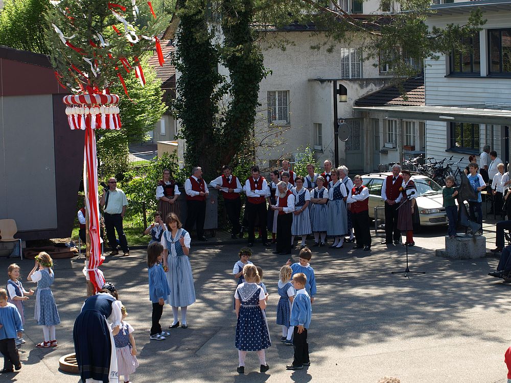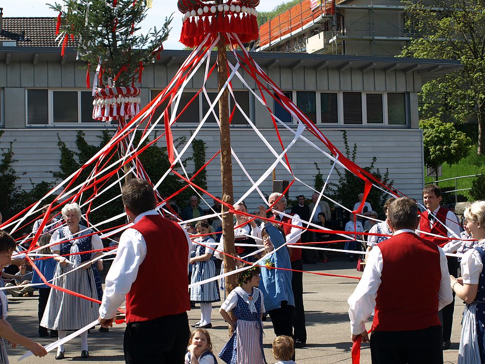 Die Kindertanzgruppen Summervögeli und Strusse zeigten unter der Leitung von Heidi Thommen und Sabine Tschan ihr Können. Ihnen folgten die erwachsenen Tänzerinnen und Tänzer, ebenfalls begleitet vom Schwyzerörgeli-Quartett Schenkenberg. Die Herren trugen die Festtagstracht mit dem roten Gilet, die Damen mehrheitlich die blau-weisse Werktagstracht. Der Bändeltanz bildete den Abschluss des klangreichen Morgens. Im Takt der Musik wickelten die Kinder und die Erwachsenen die rot-weissen Bänder um die beiden Stämme, die von einer Tanne und einem Kranz mit 33 Eiern geschmückt wurden. Am Nachmittag zeigten die Kinder in der Mehrzweckhalle weitere Tänze aus der Schweiz.