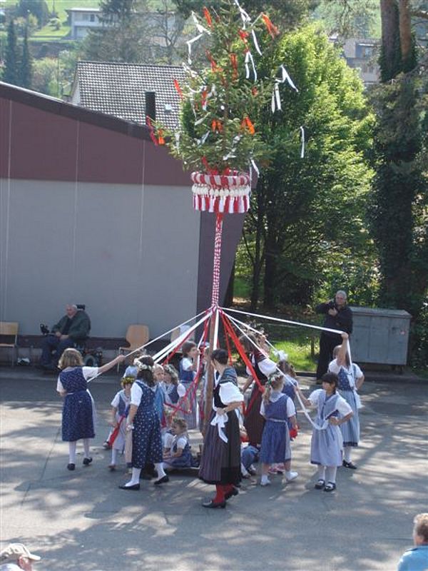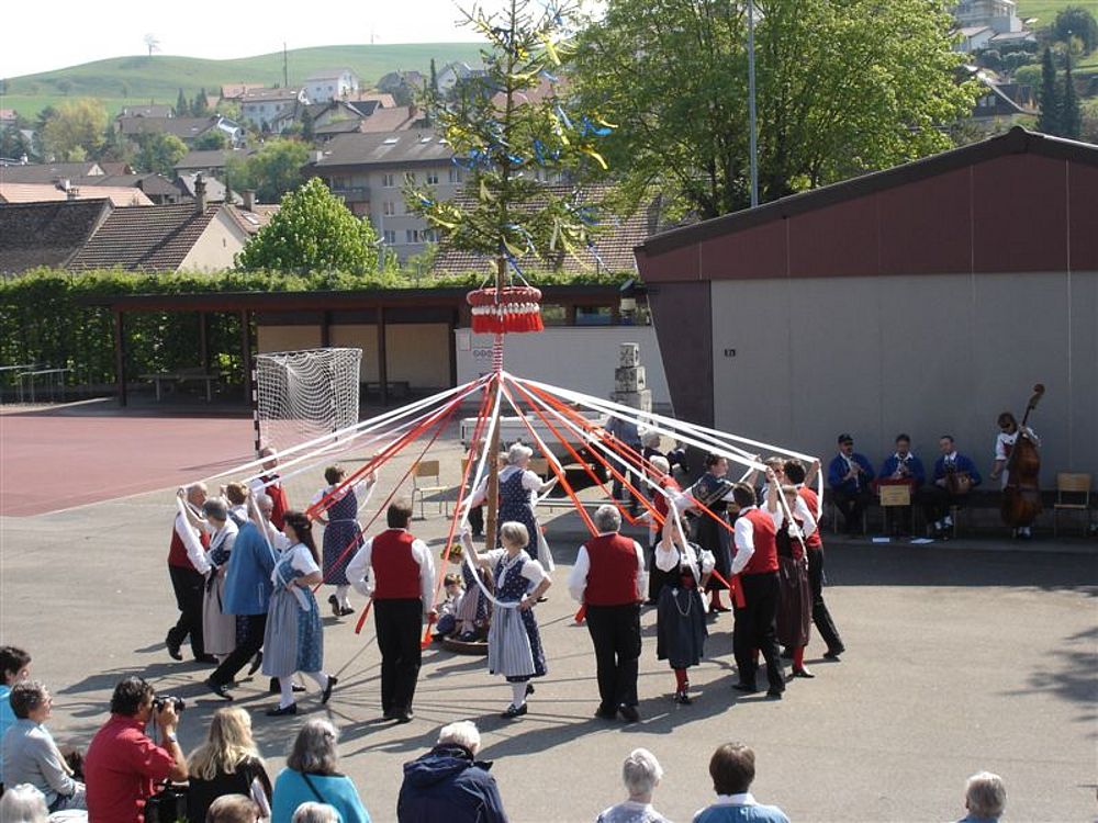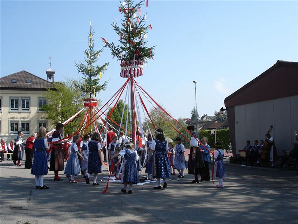 Wie in den letzten Jahren, war auch diesmal schönes Wetter, was zahlreiche Zuschauer auf den Pausenplatz in Niederdorf lockte. Das Maitanzen begann mit dem Gottesdienst, welcher musikalisch vom Trachtenchörli, der Alphorngruppe Lueg ins Land und einer Delegation des Musikvereins Niederdorf umrahmt wurde.