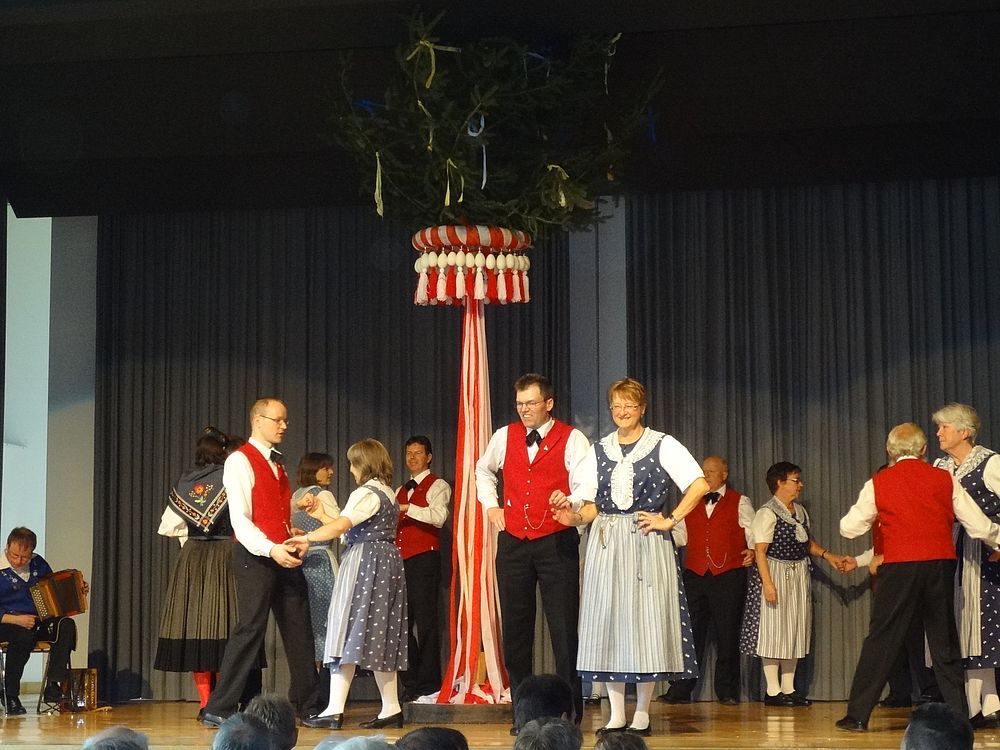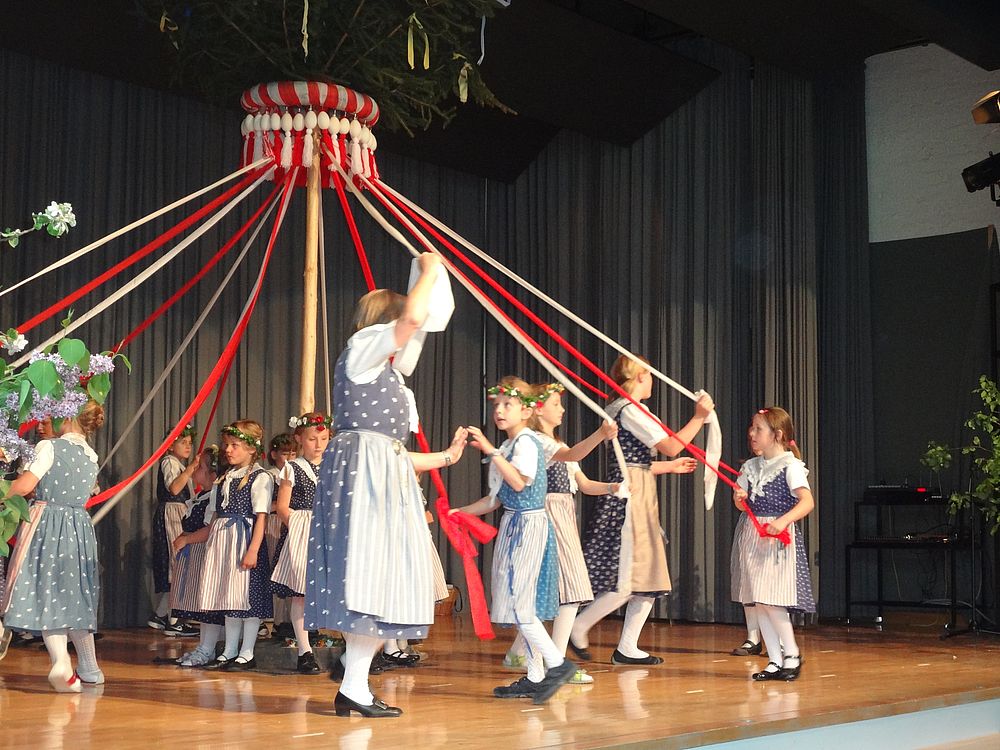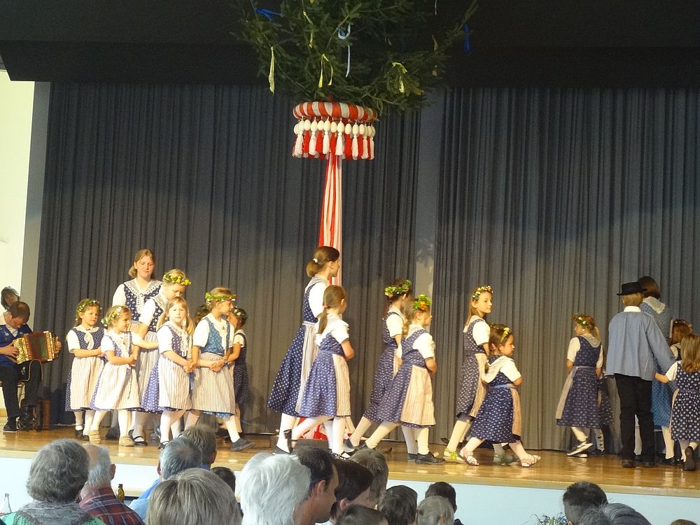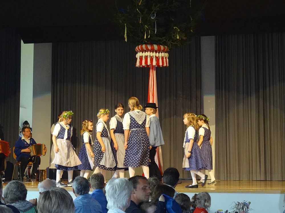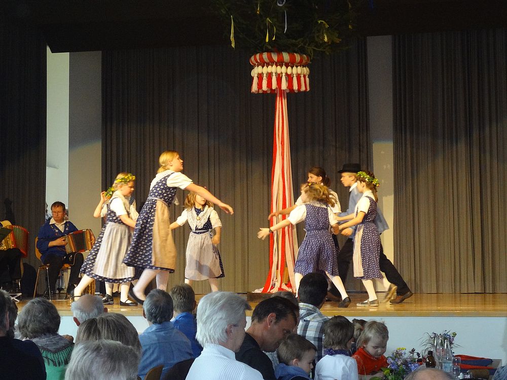 Da der Maitanzsonntag diesmal in der Turnhalle stattfand, fanden nicht wie sonst üblich zwei Maibäume nebeneinander Platz. Es war diesmal den Kindern vorbehalten, der vollbesetzten Halle den Maibaumtanz zu zeigen.